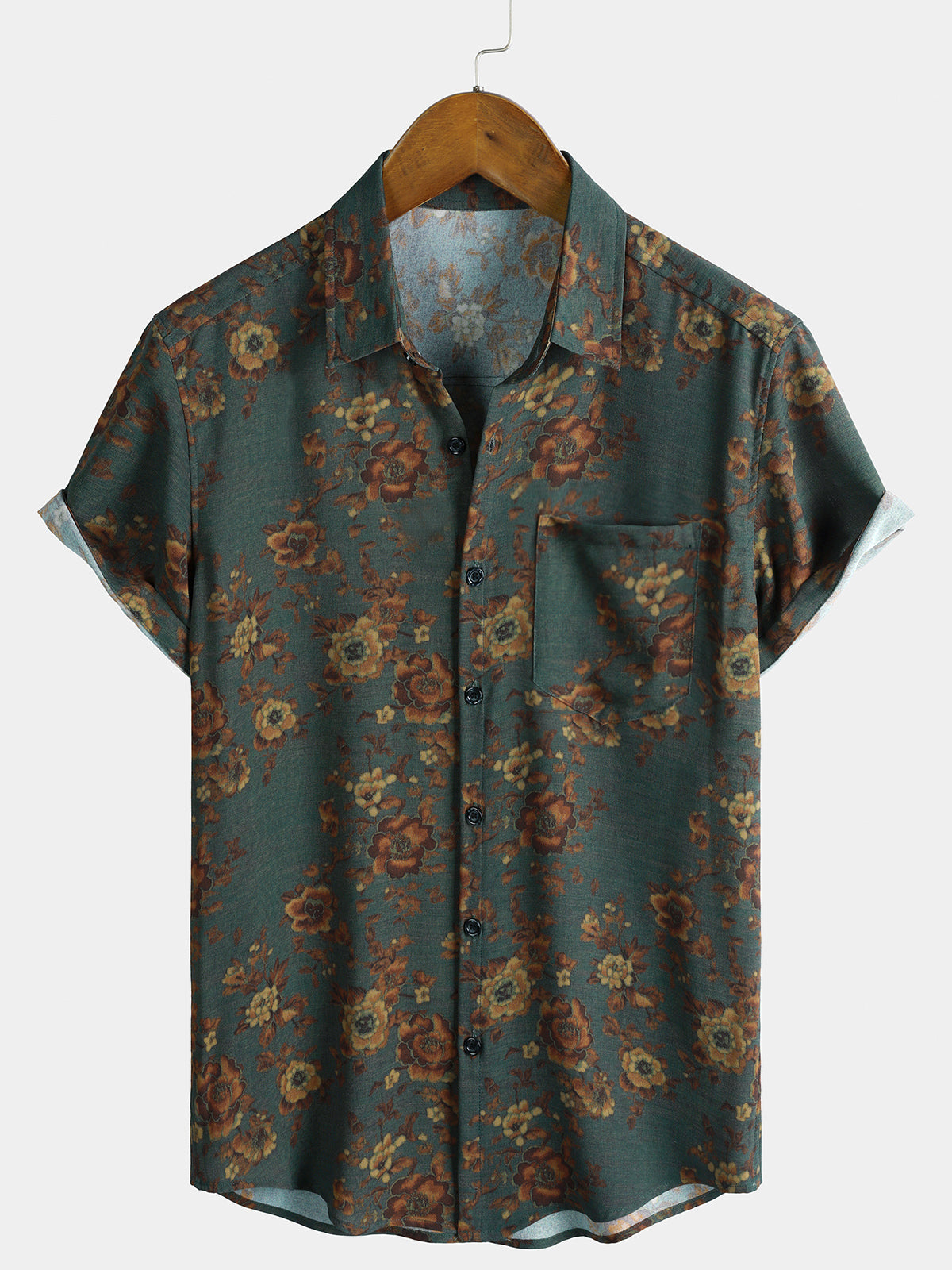 Men's Brown Floral Print Vintage Flower Holiday Breathable Short Sleeve Button Up Shirt