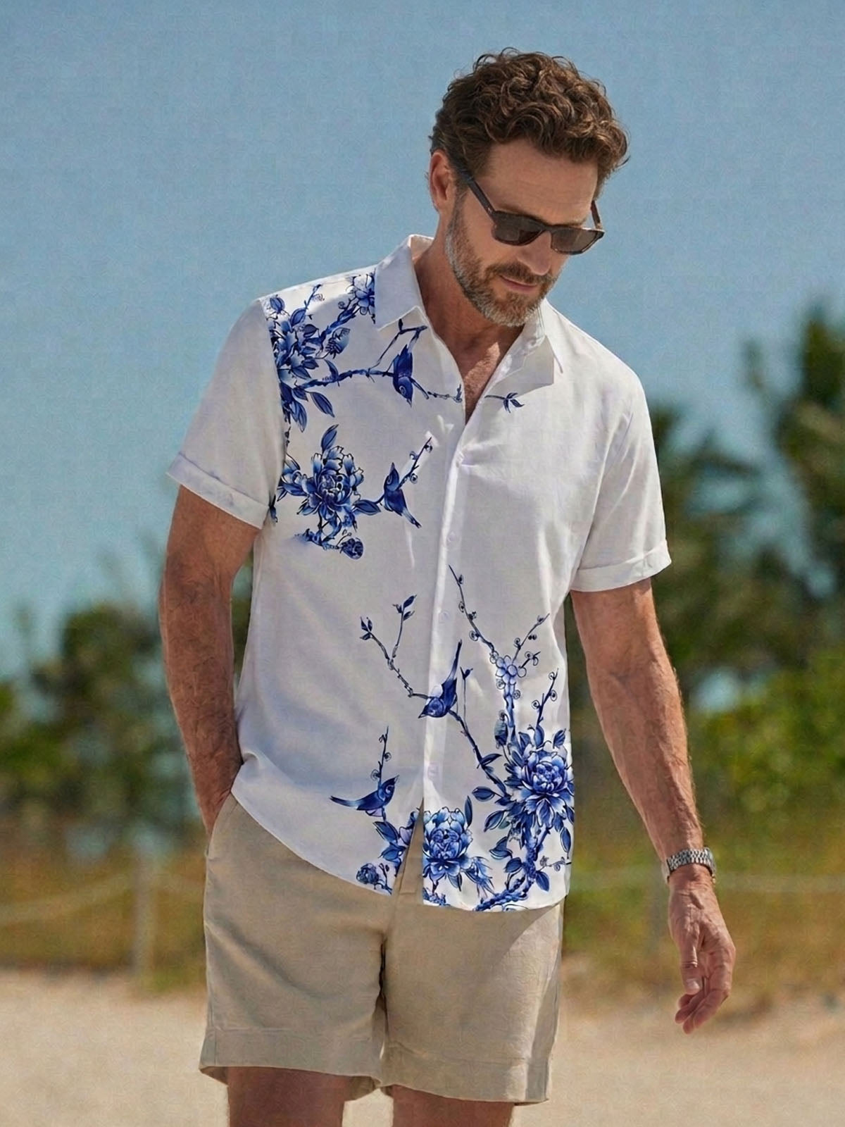 3 reviewsMen's Blue Floral Print Summer Hawaiian Holiday Short Sleeve Shirt