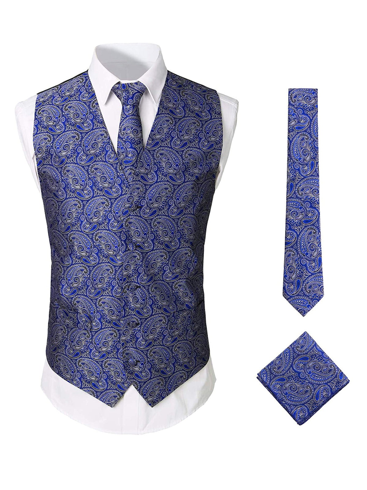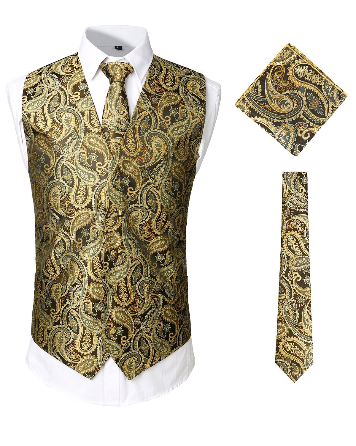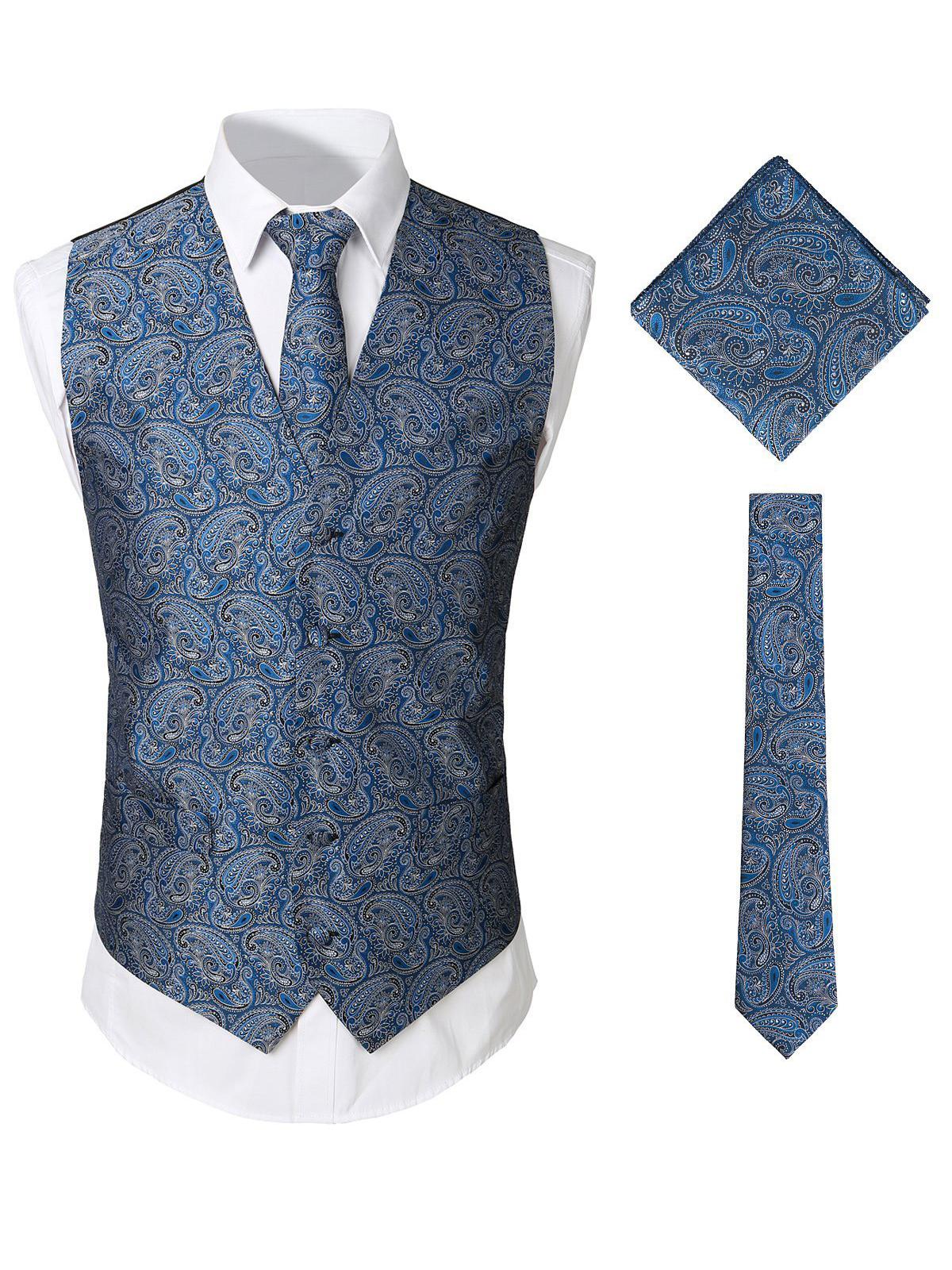 Men's Paisley Vest Necktie Square Pocket Handkerchief Set for Suit or Tuxedo
