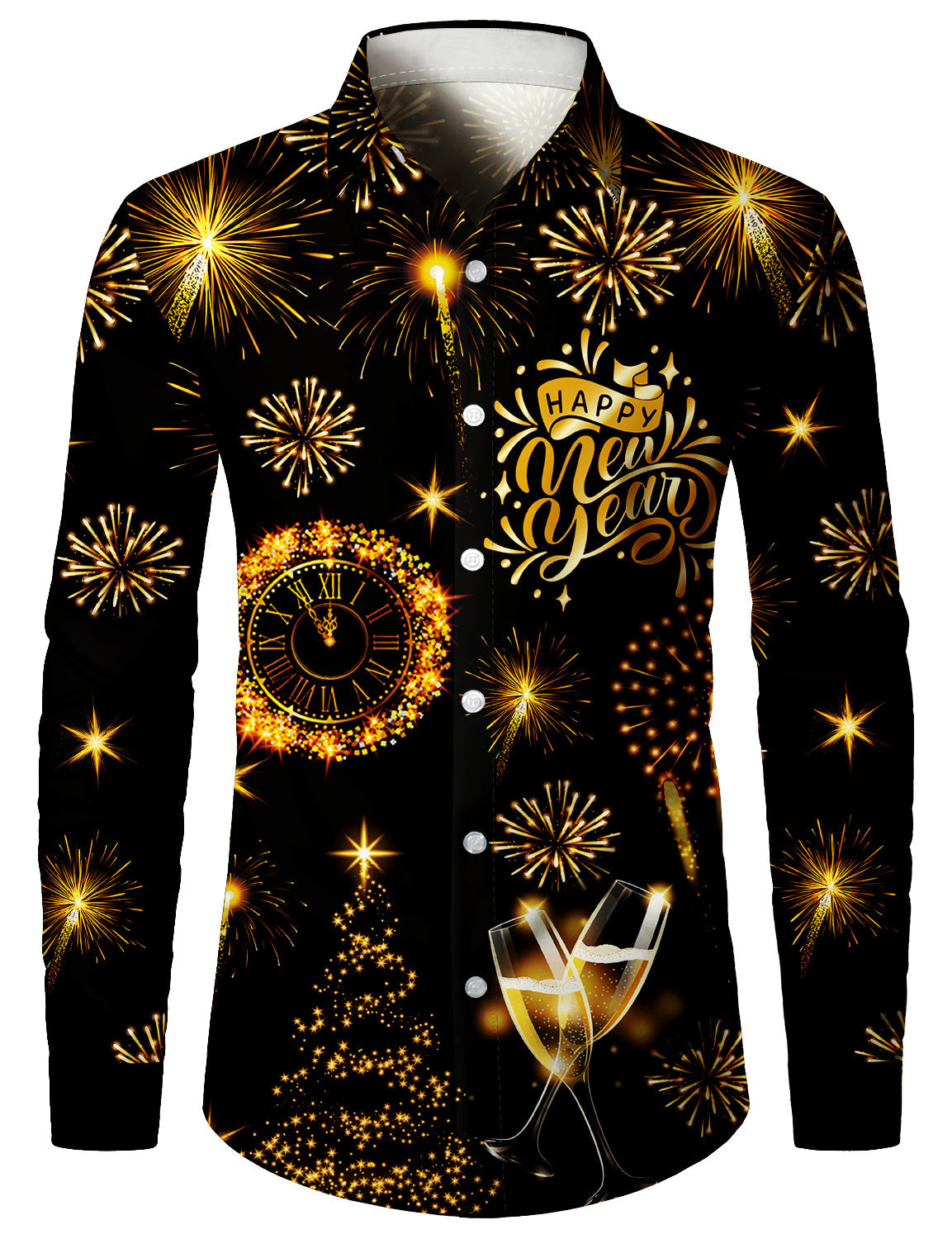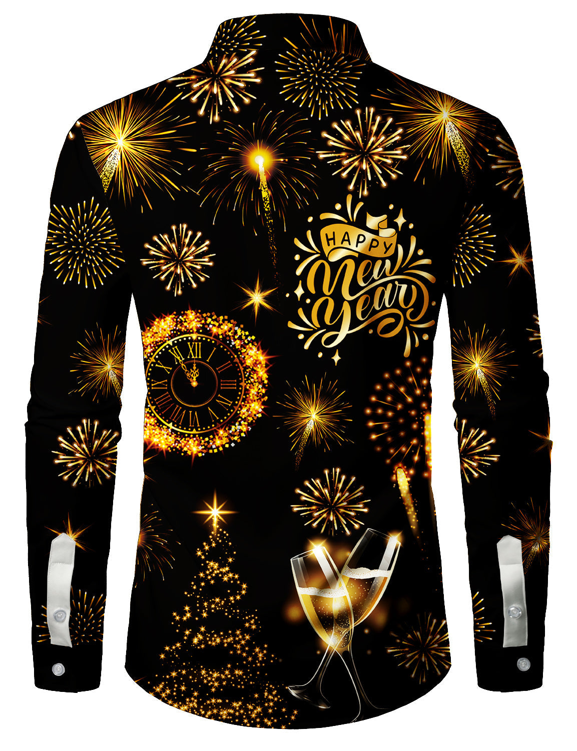 Men's Golden Fireworks Happy New Year Print Long Sleeve Holiday Shirt