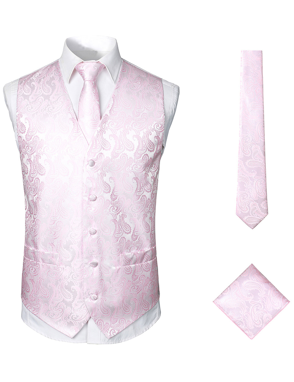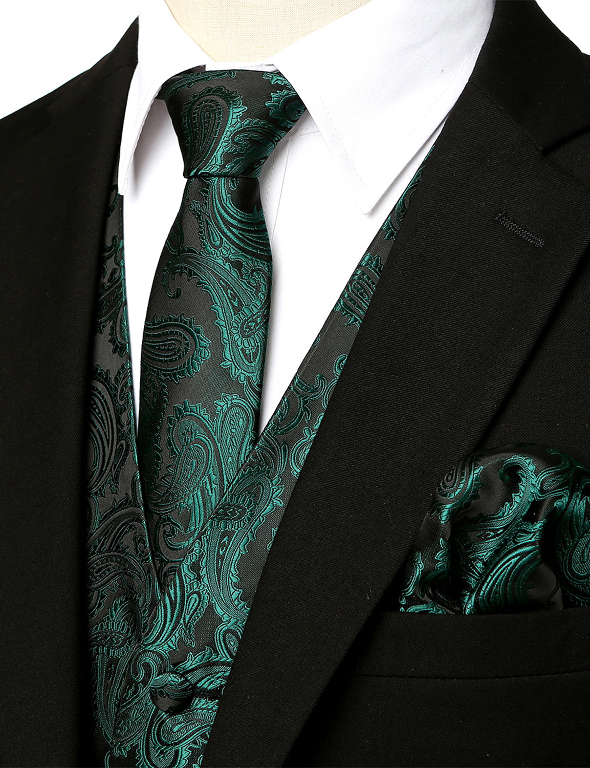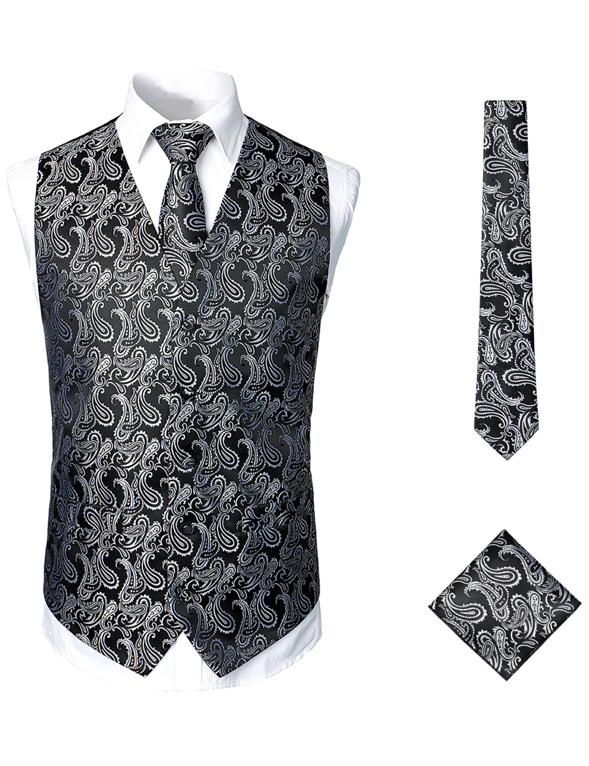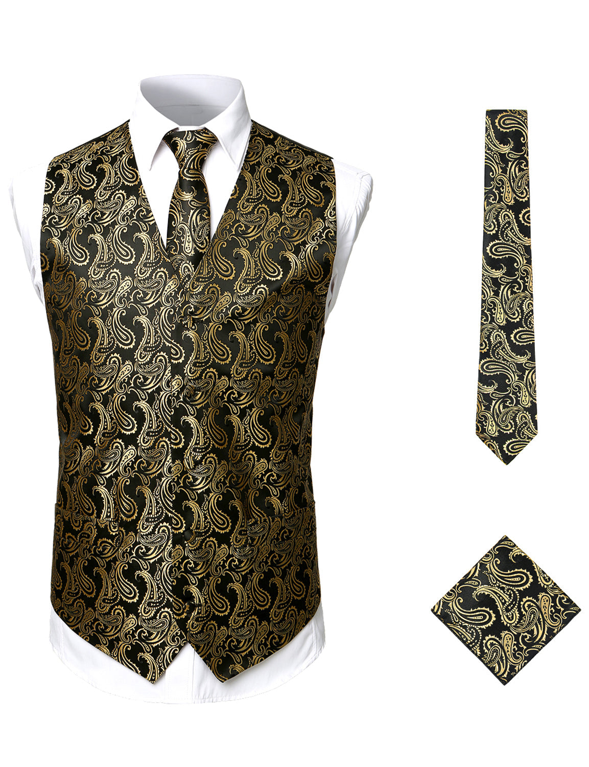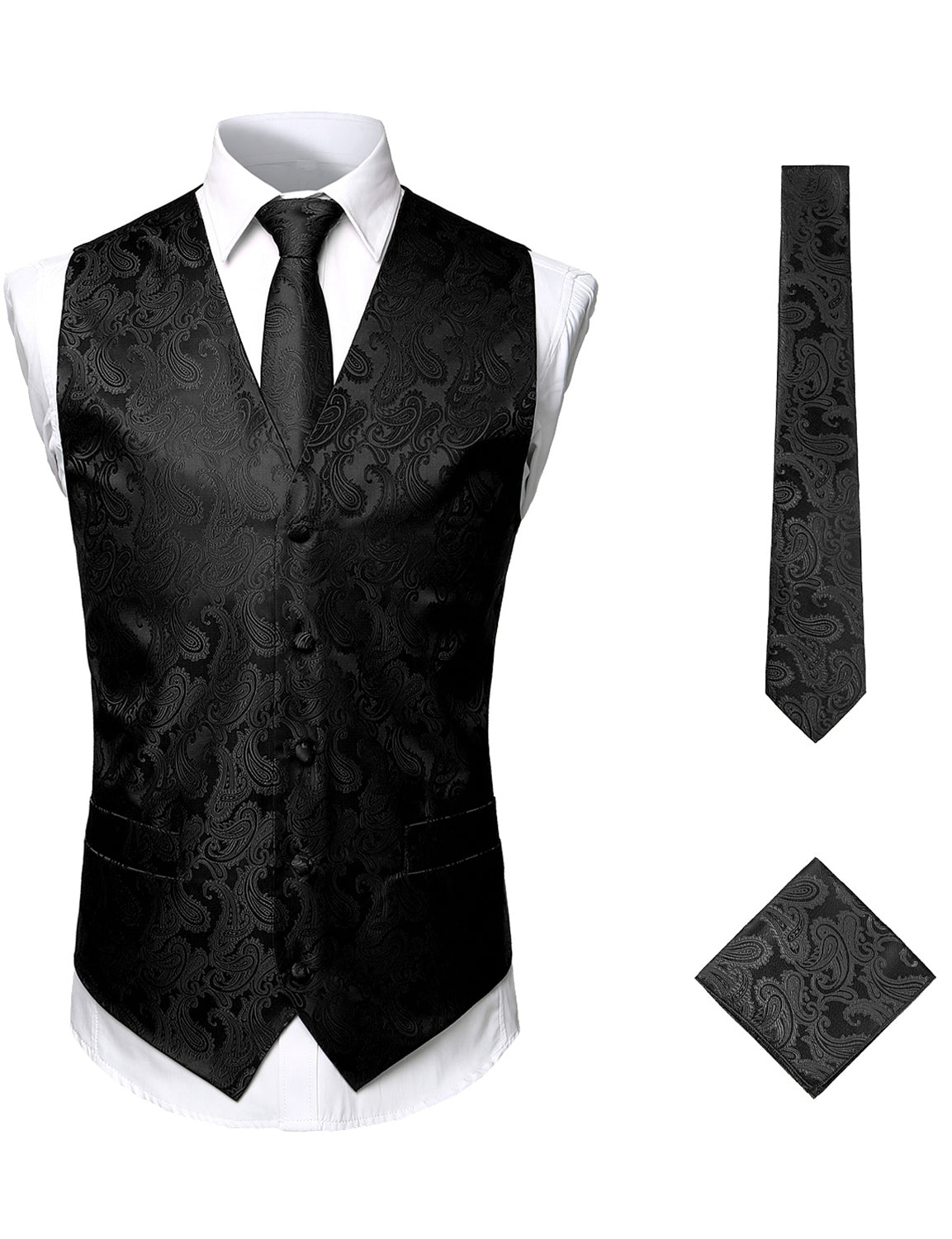 Men's 3pc Jacquard Paisley Vest & Tie Set Classic Necktie Pocket Square Waistcoat for Suit or Tuxedo