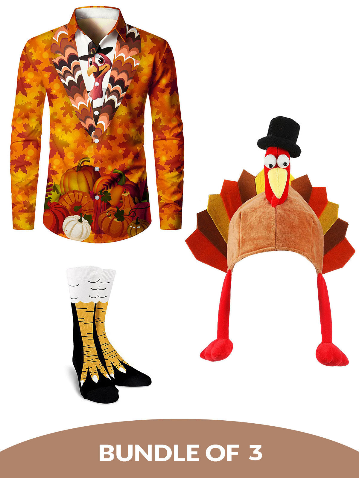 Bundle of 3 | Men's Thanksgiving Turkey Shirt Plush Turkey Hat & Cotton Socks