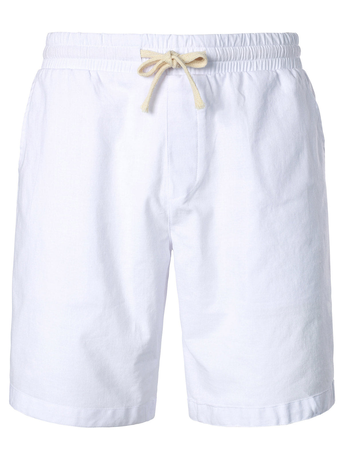 - Flat-front casual shorts with slanted side pockets and rear pockets, mid-rise, elastic waist and drawstring closure