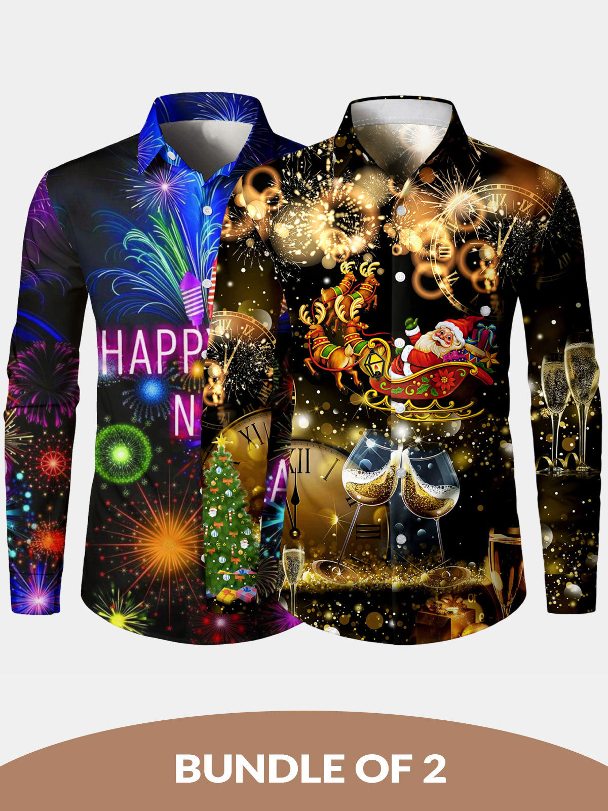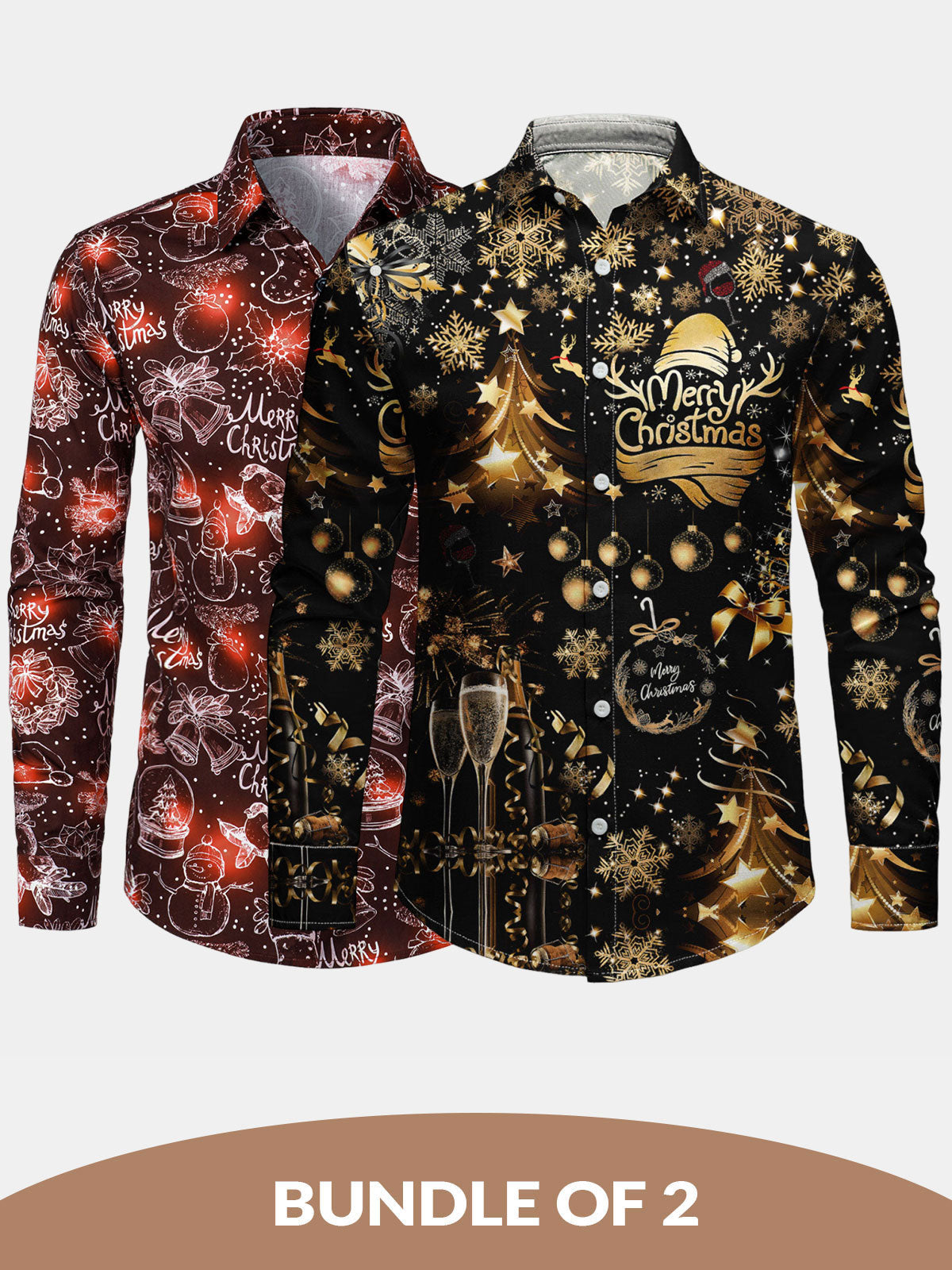 Bundle Of 2 | Men's Golden Merry Christmas Champagne Print Long Sleeve Shirts