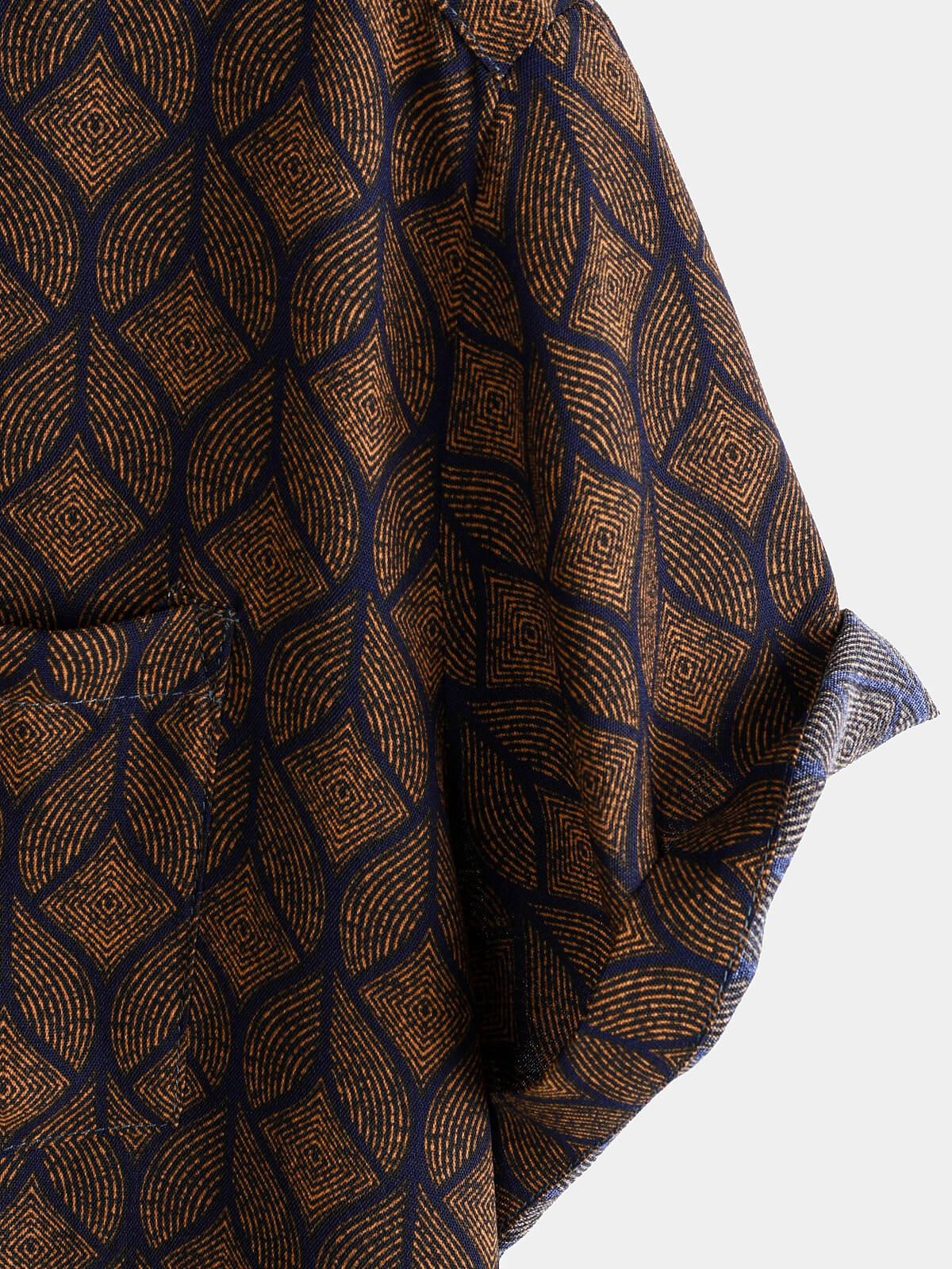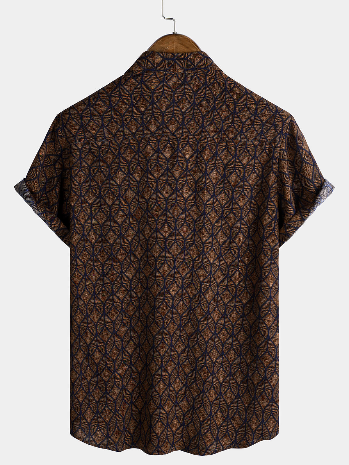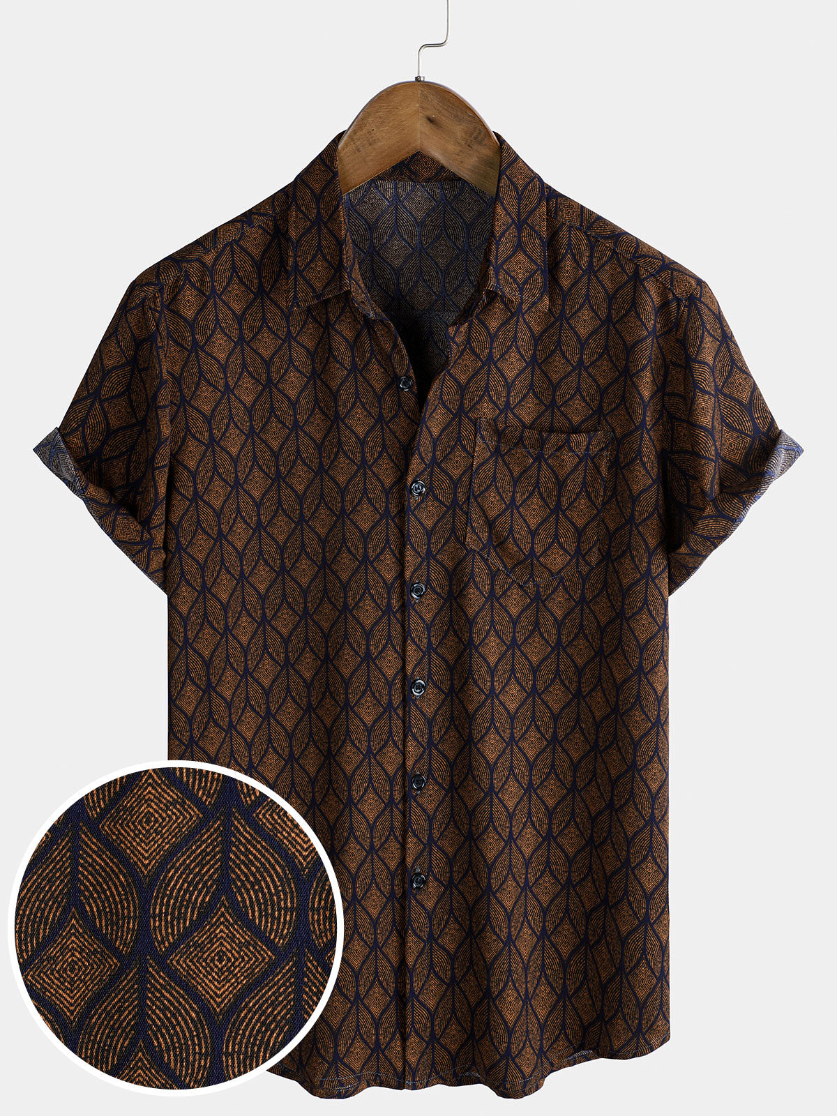 Men's Retro Brown Geometric Print Pocket Short Sleeve Shirt