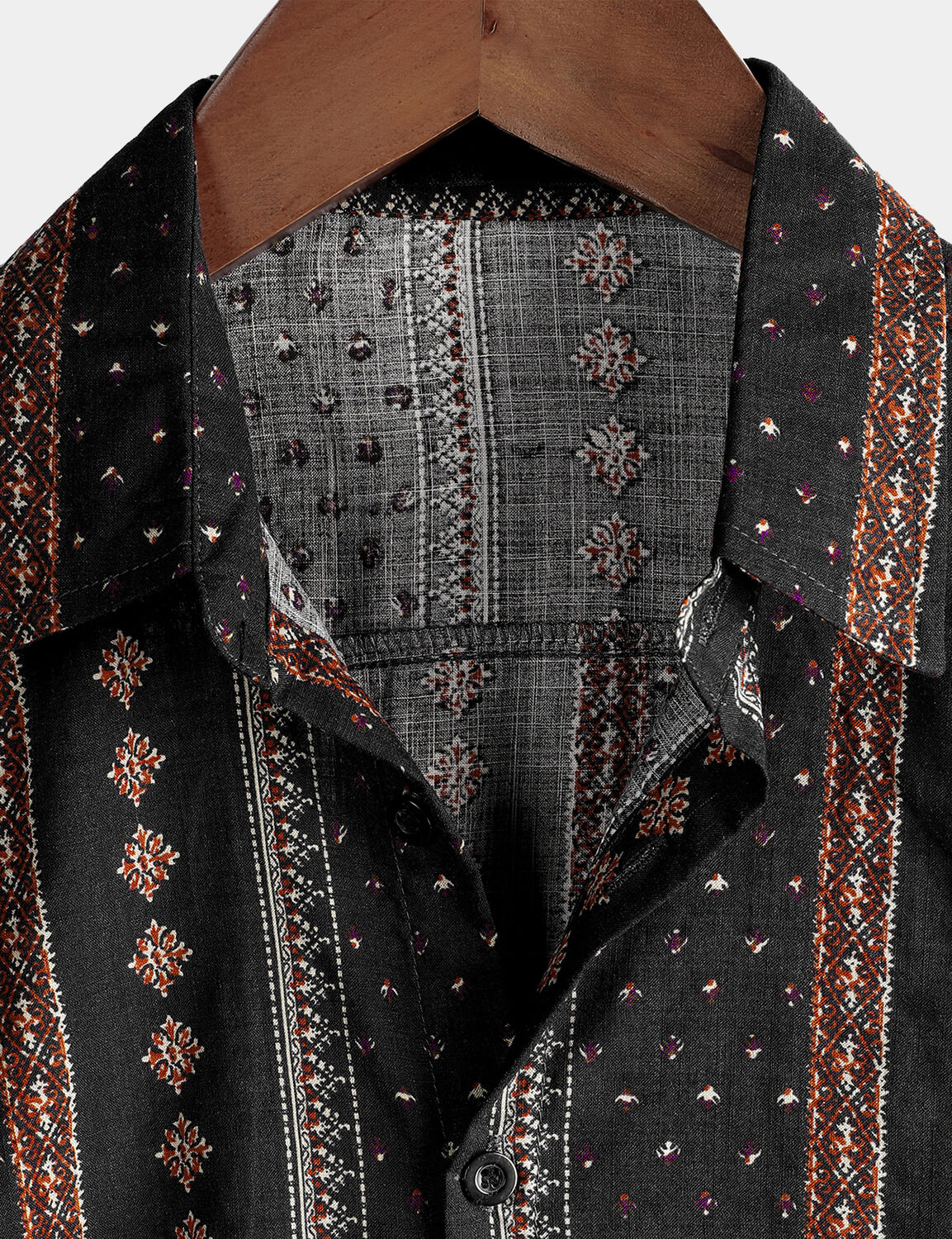 Men's Black Vertical Striped Print Retro Button Up 70s Vintage Short Sleeve Western Shirt