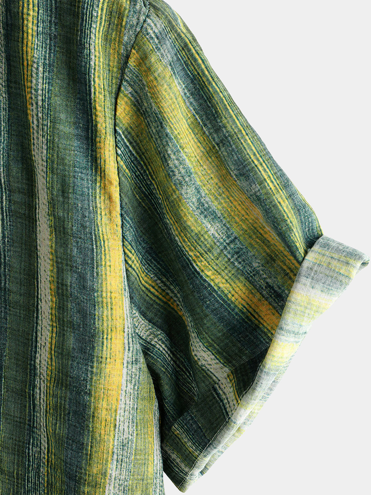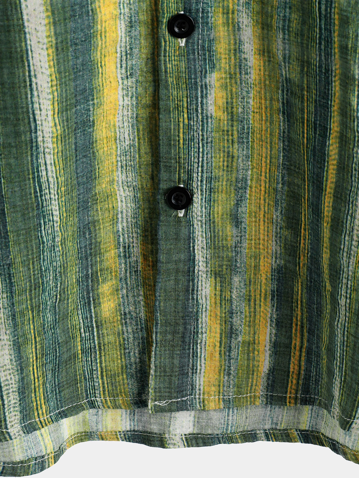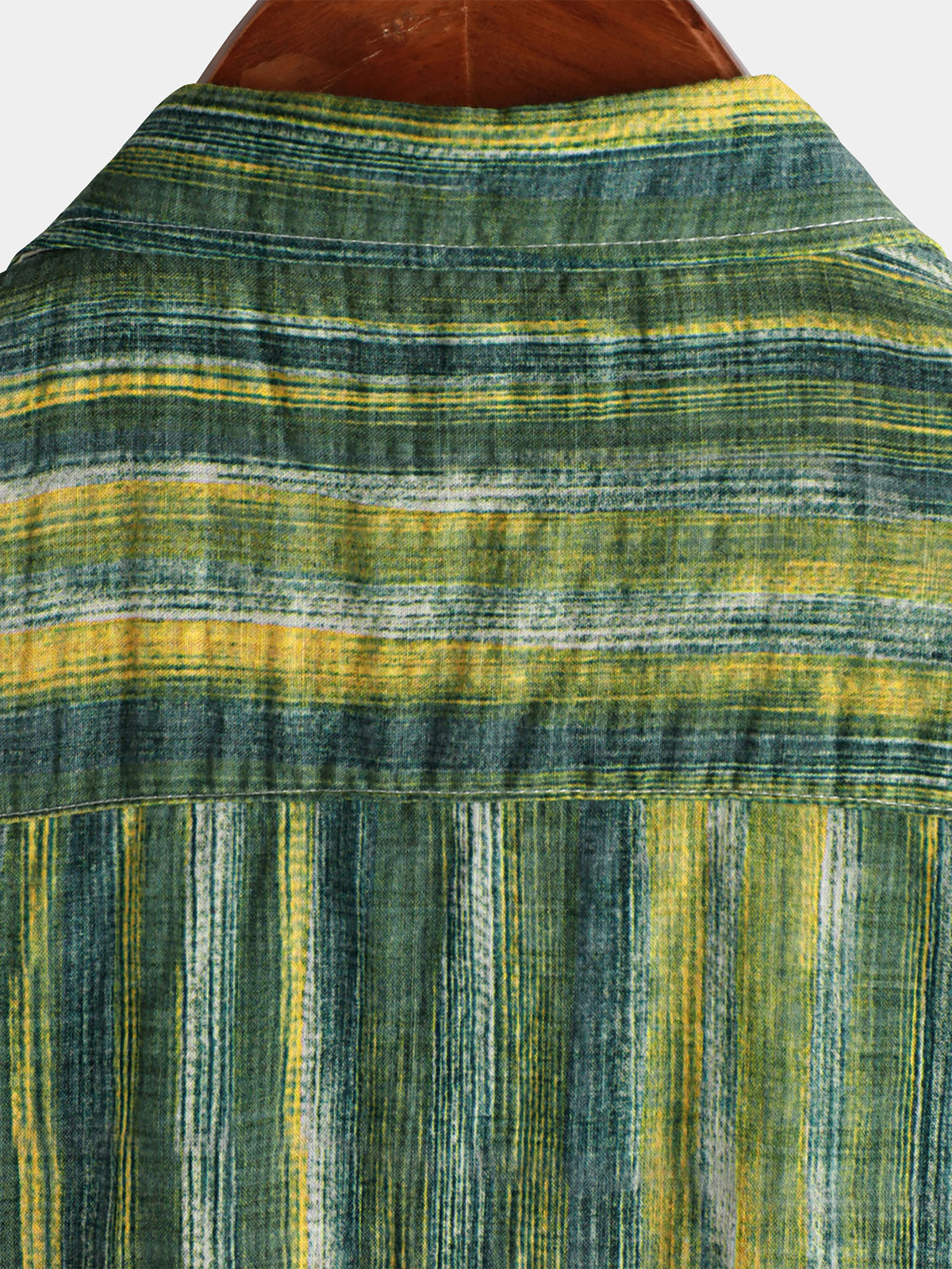 Men's Vintage Green And Brown Vertical Striped Button Up Pocket Short Sleeve Shirt