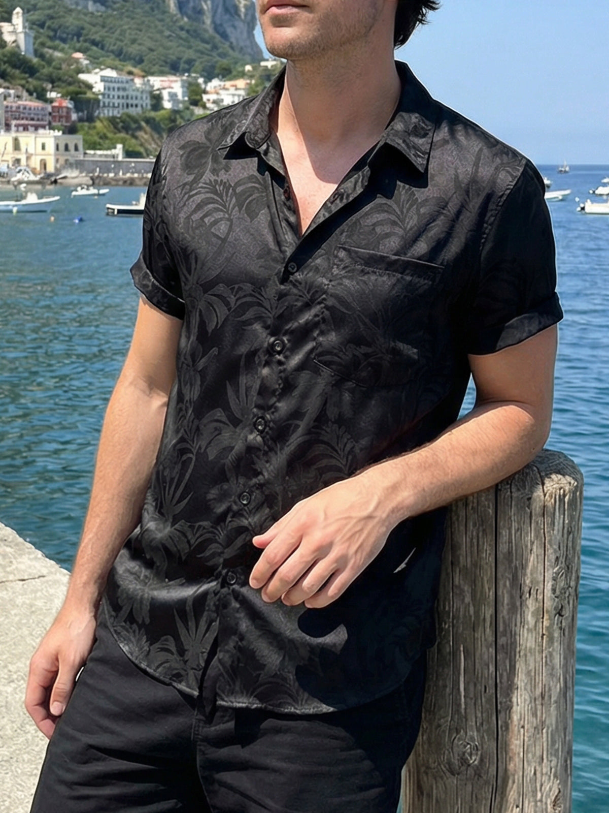 Men's Floral Jacquard Casual Pocket Summer Short Sleeve Beach Shirt