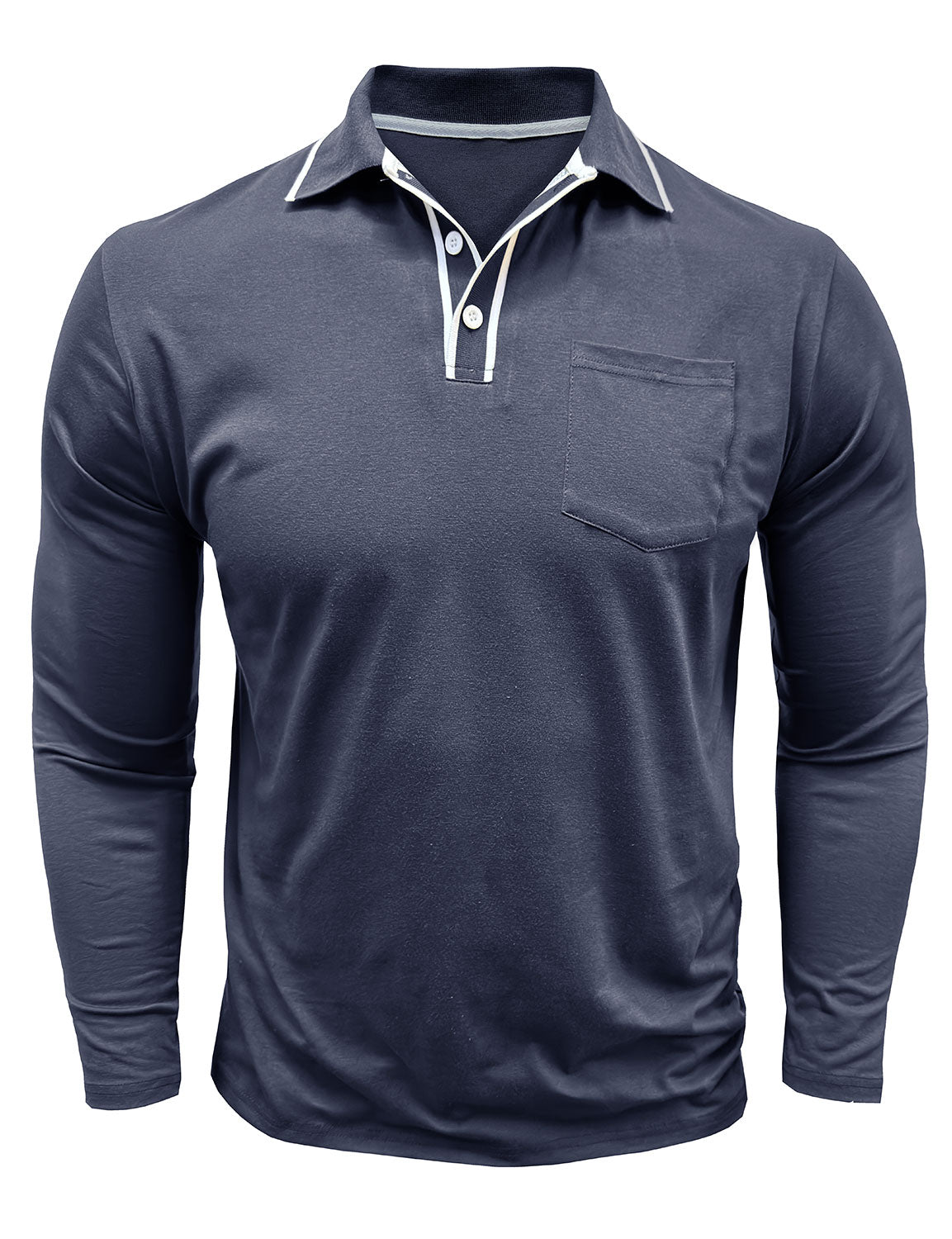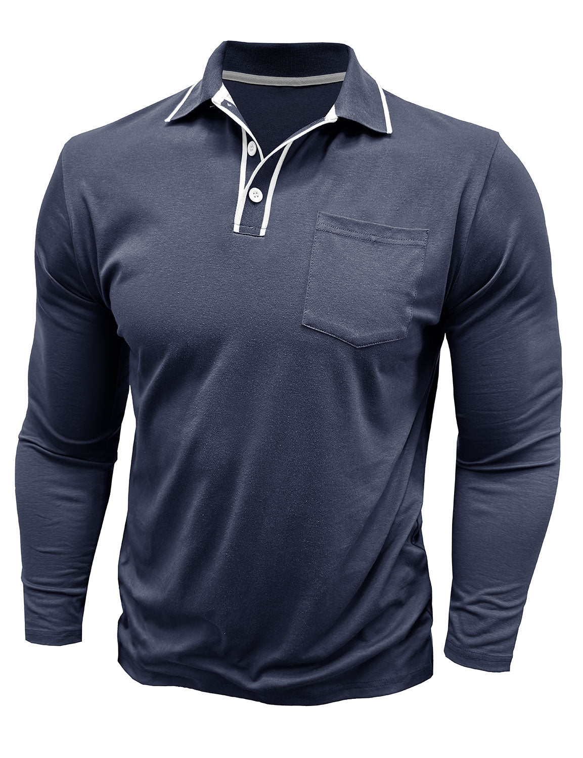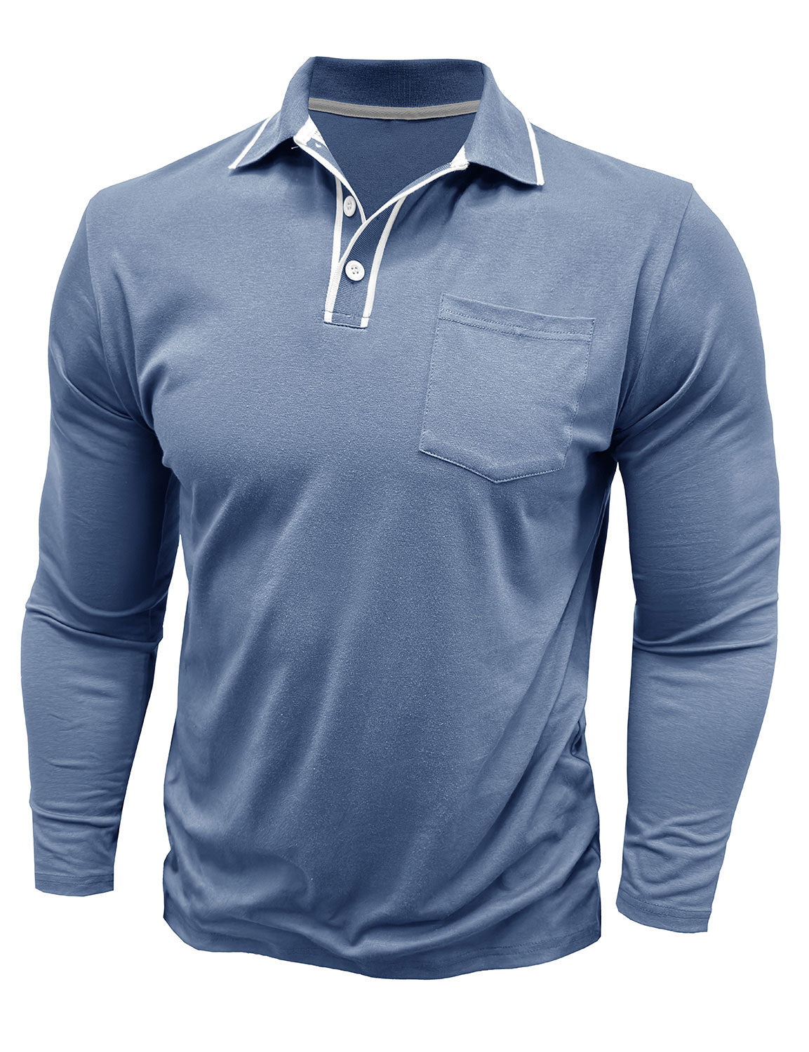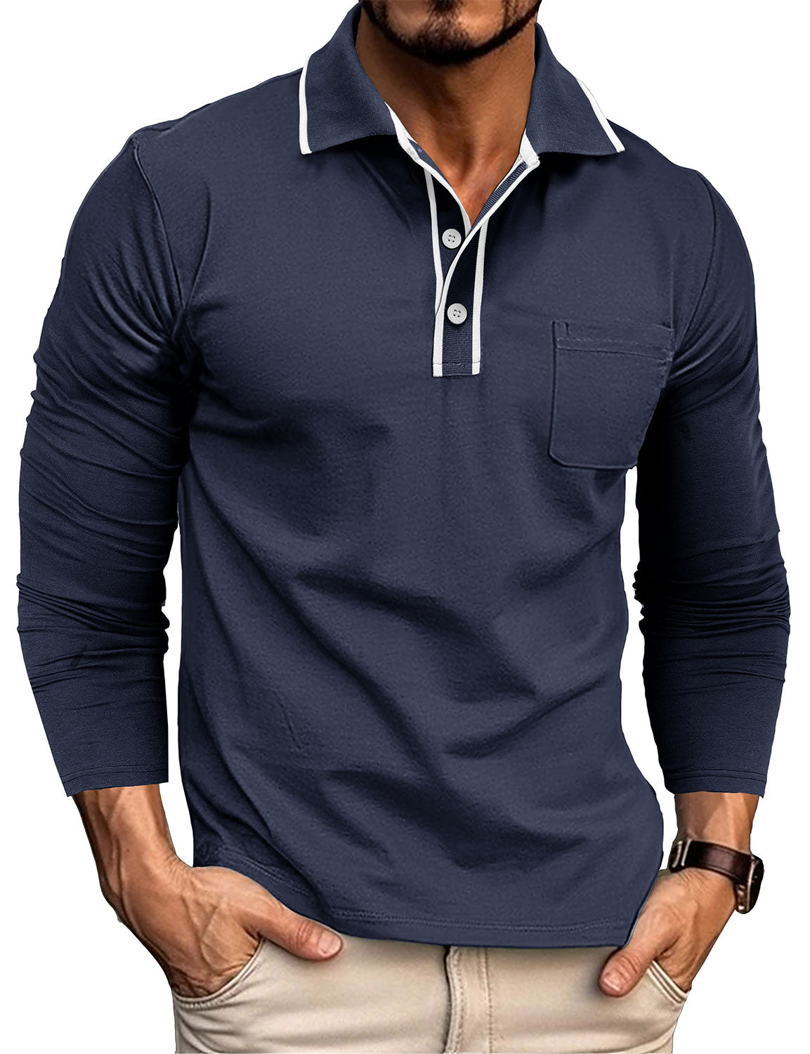 Men's Solid Color Pocket Cotton Polo Long Sleeve Shirt