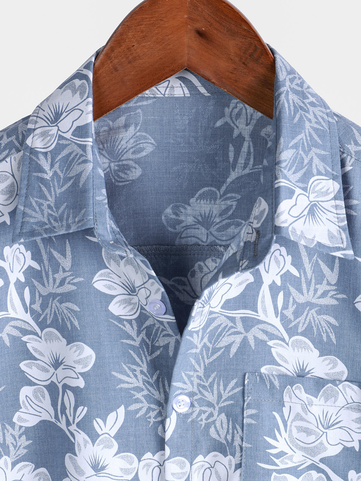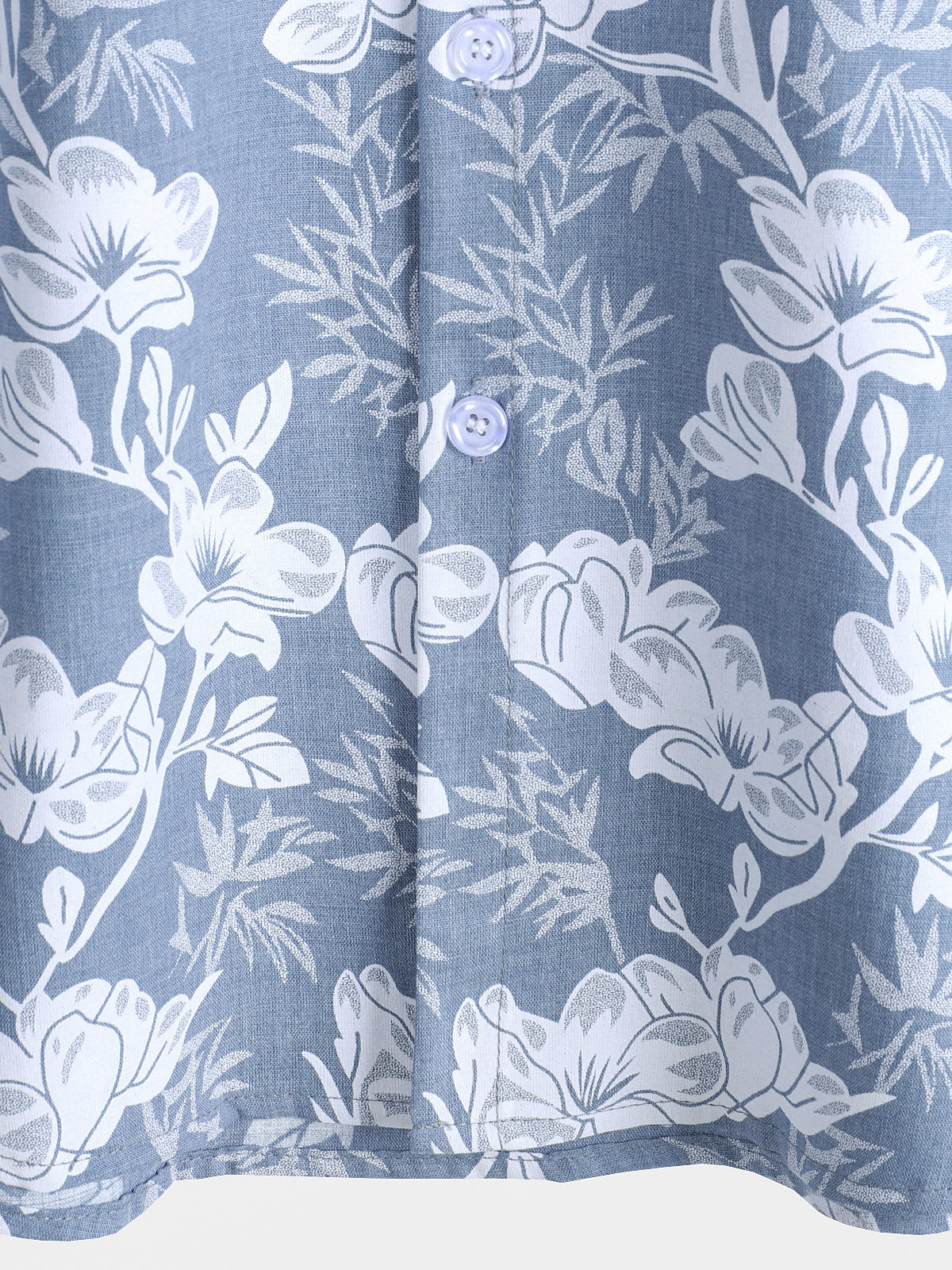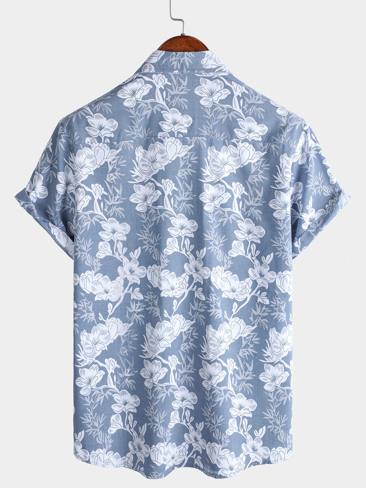 Men's Blue Floral Short Sleeve Cotton Summer Button Up Shirt