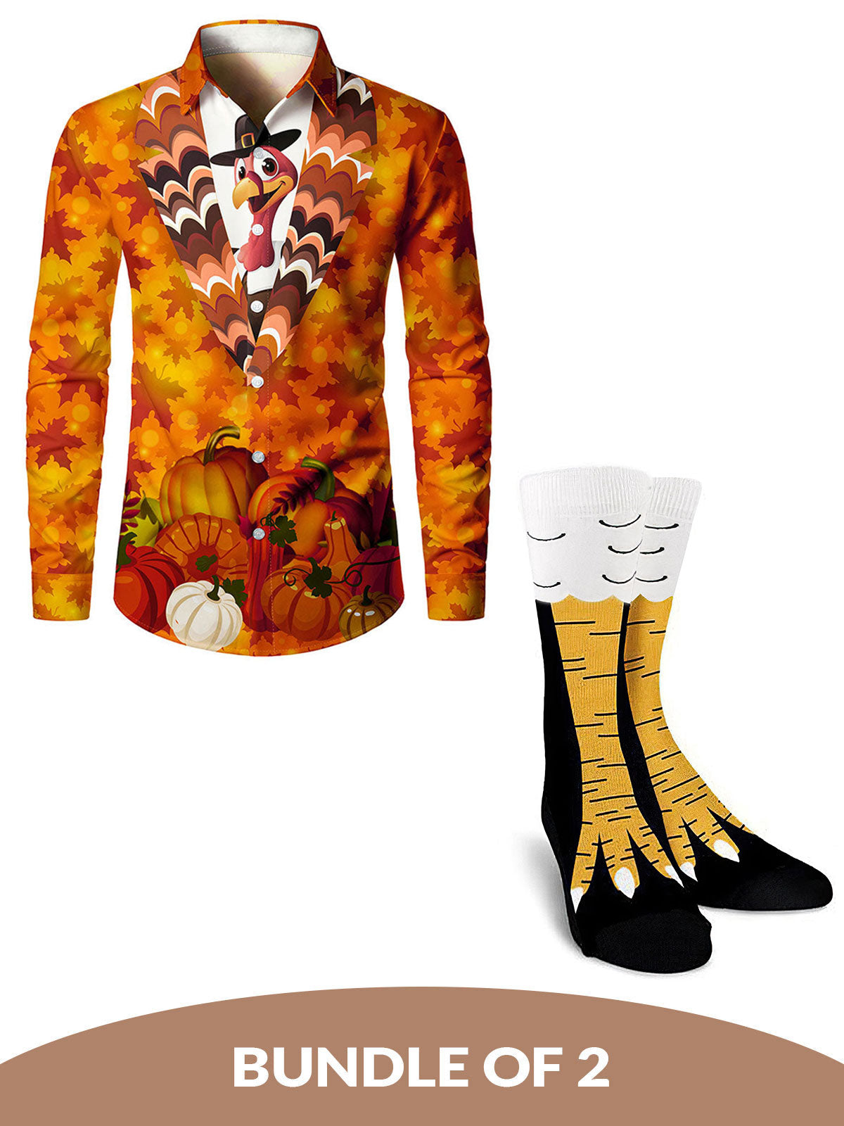 Bundle Of 2 | Men's Thanksgiving Turkey Long Sleeve Shirt & Turkey Funny Print Party Socks