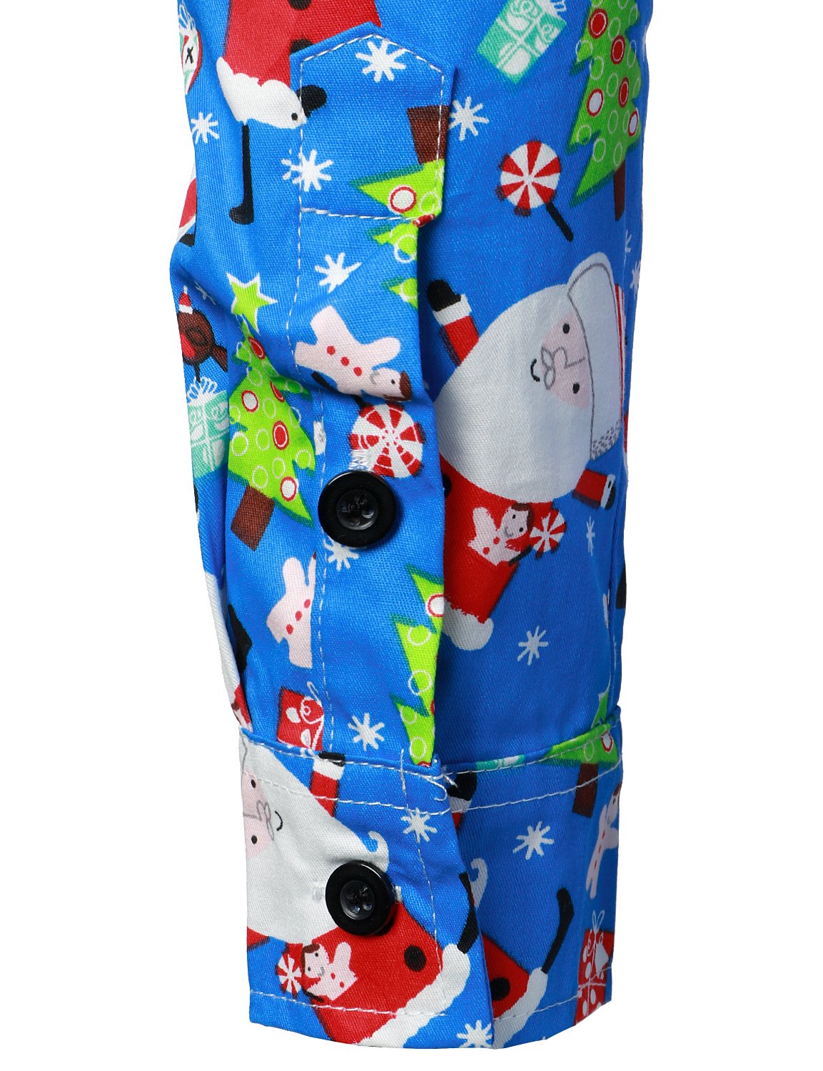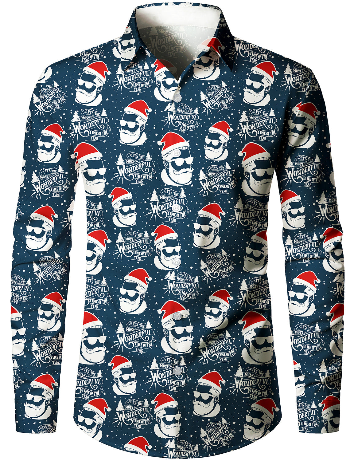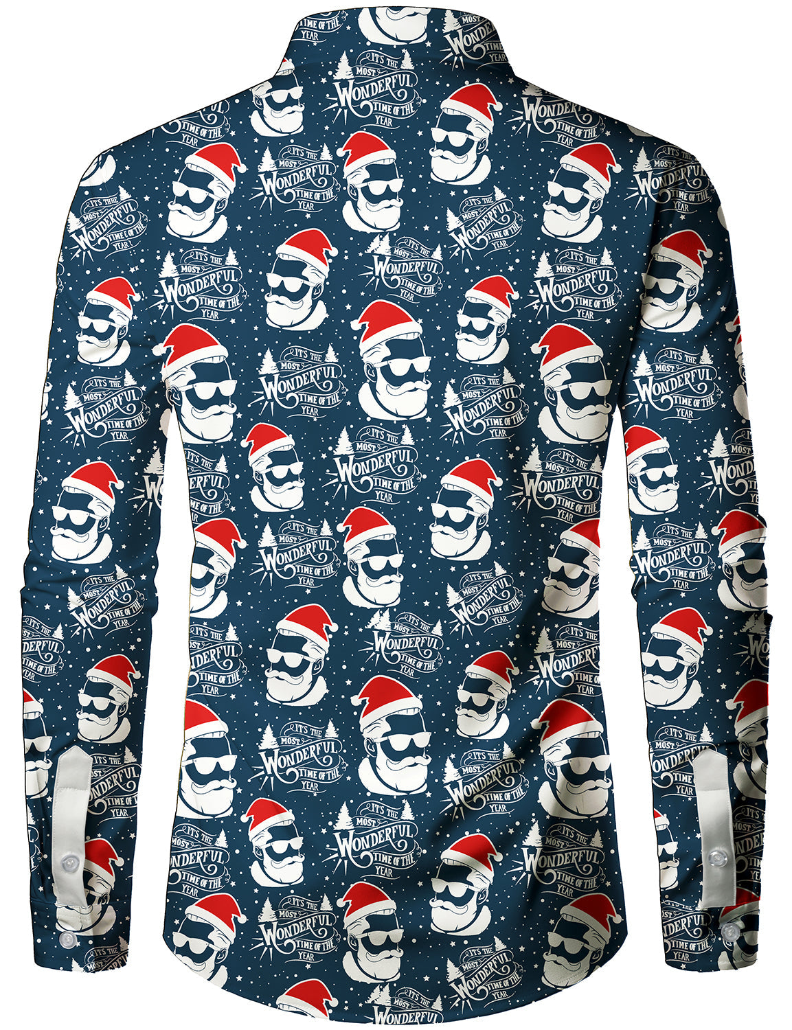 Men's Christmas Print Regular Fit Blue Long Sleeve Santa Dress Shirt