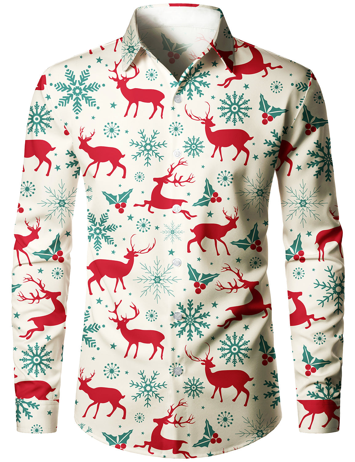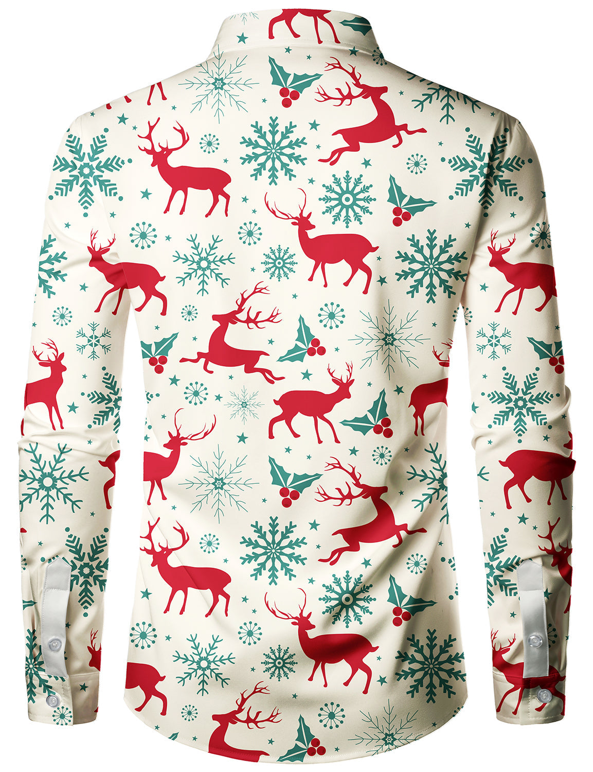 Men's Christmas Elk Print Snowflake Xmas Holiday Long Sleeve Shirt