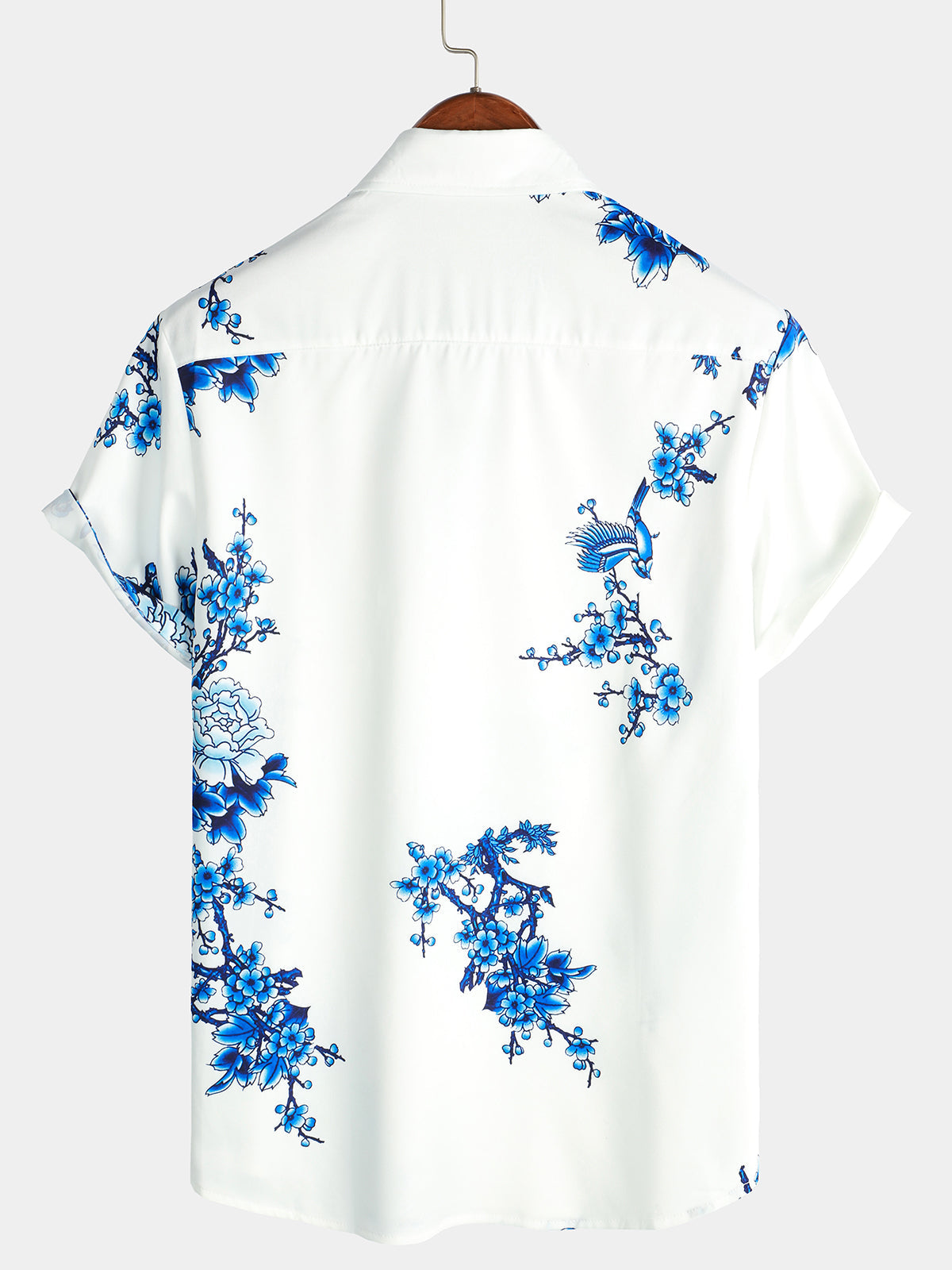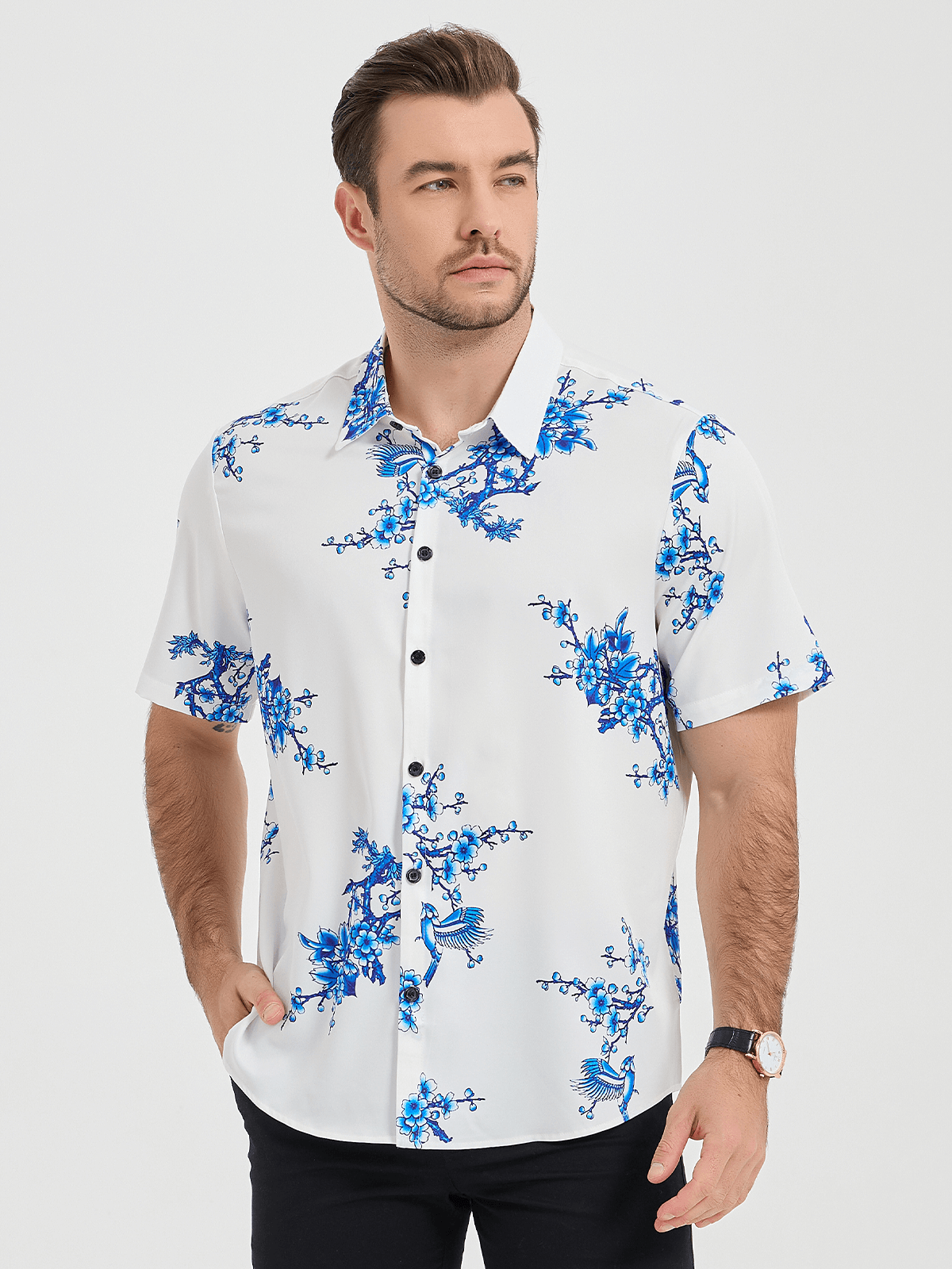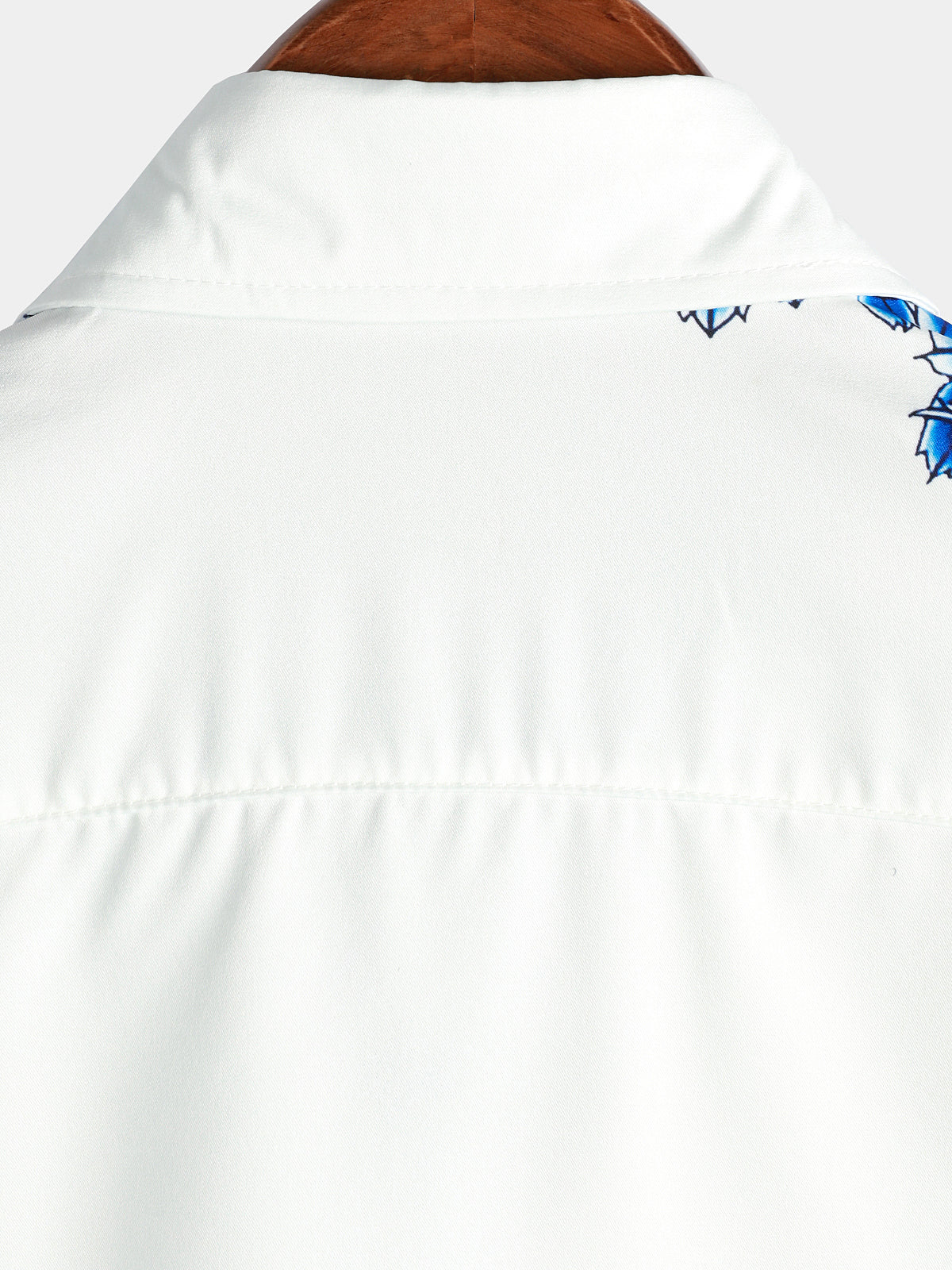 Men's Blue Floral Printed Button Up Casual Short Sleeve Shirt