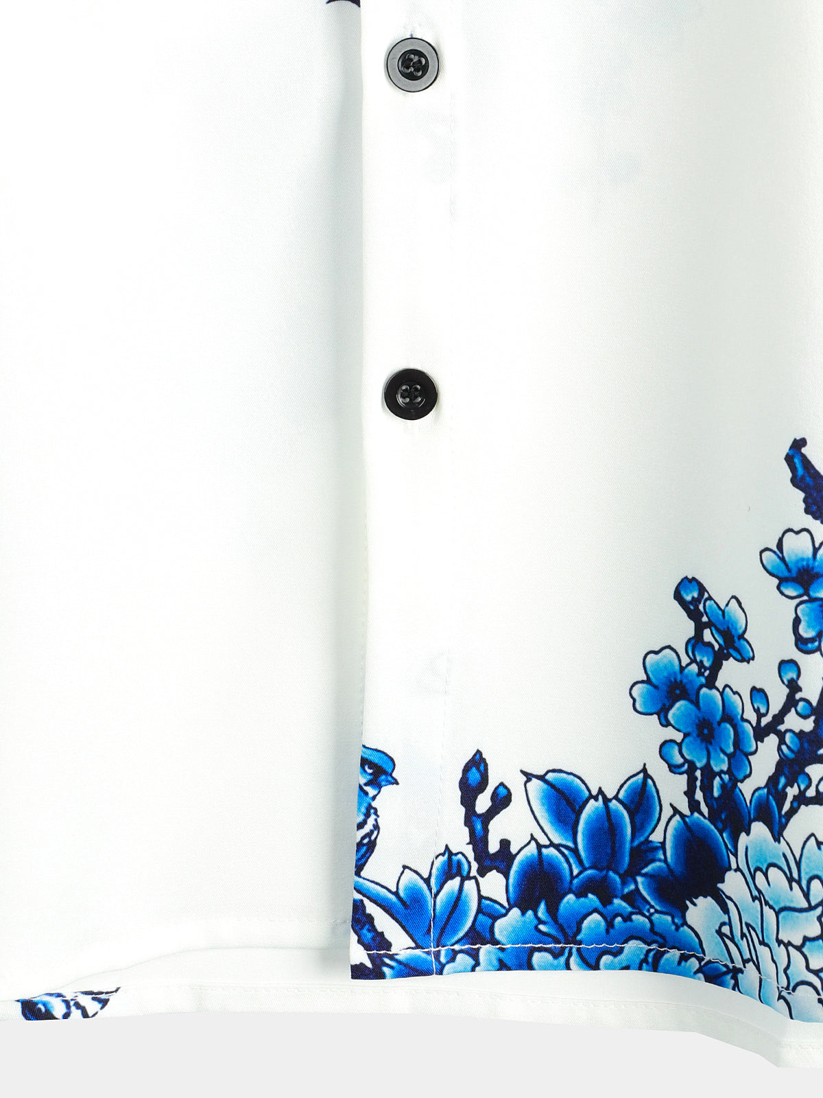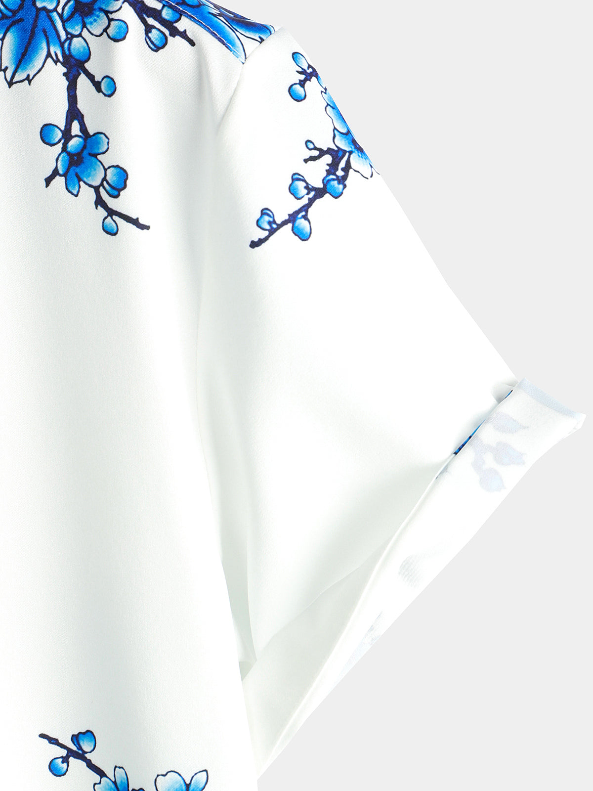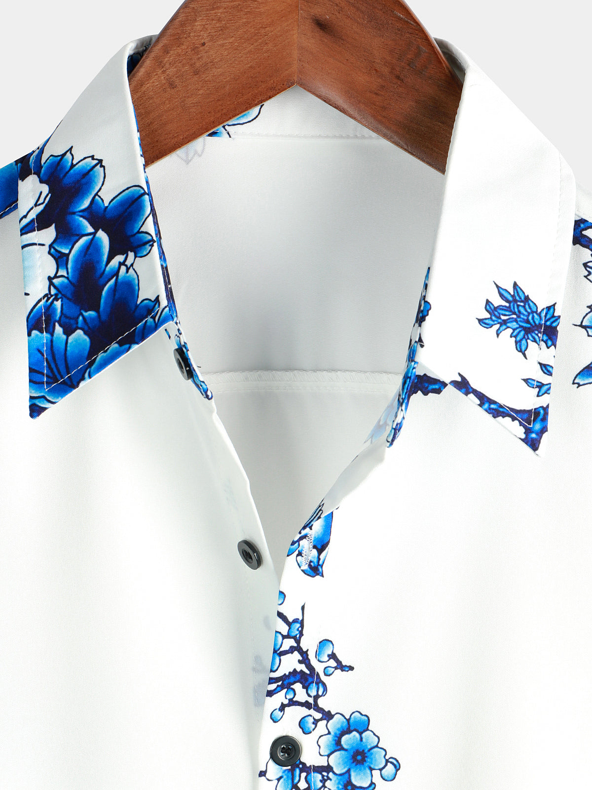 Men's Blue Floral Printed Button Up Casual Short Sleeve Shirt