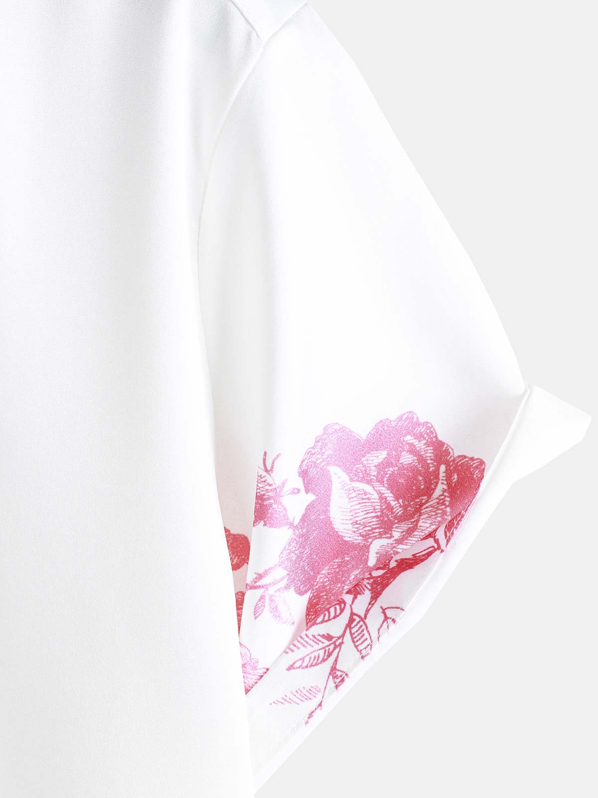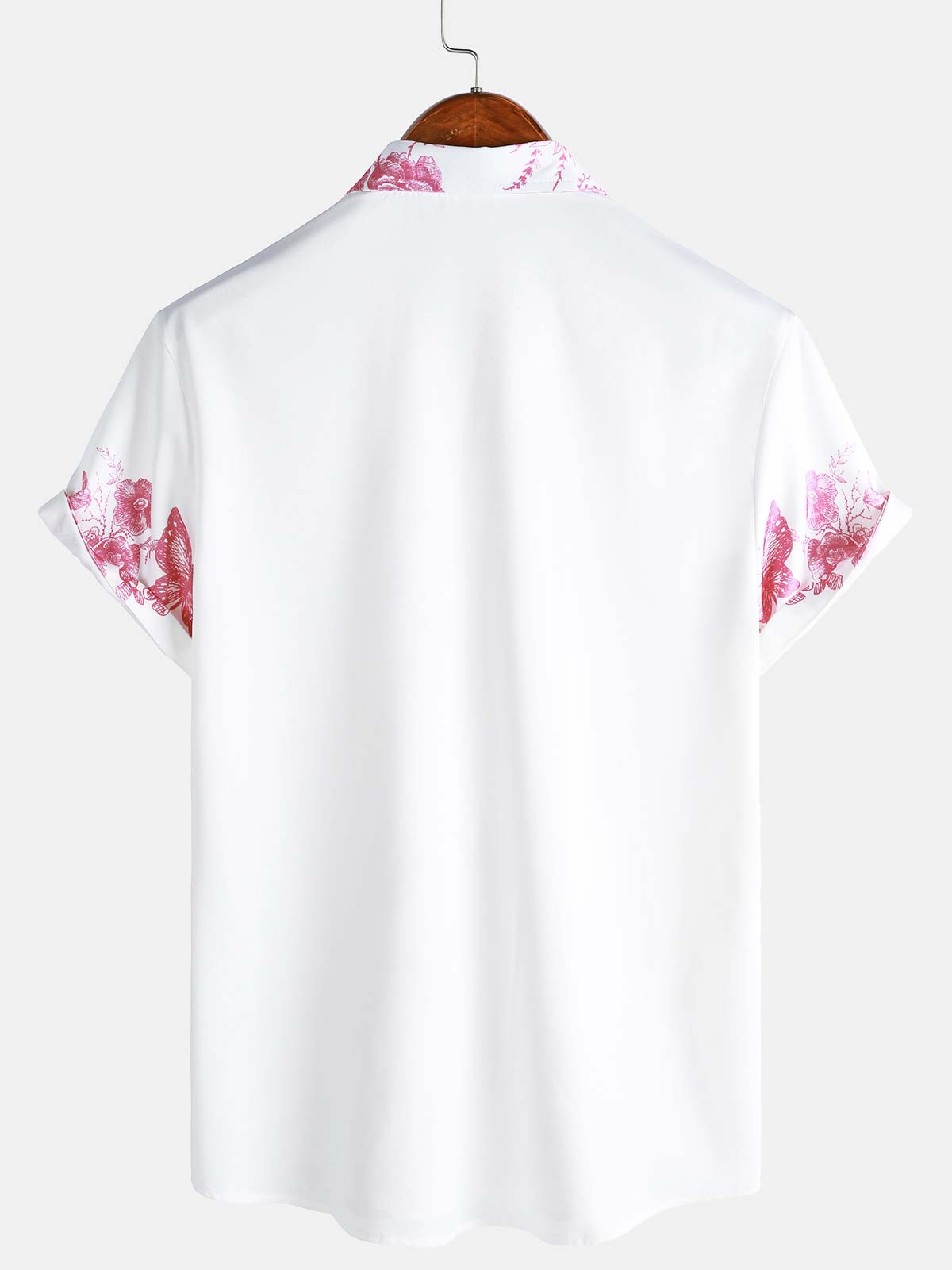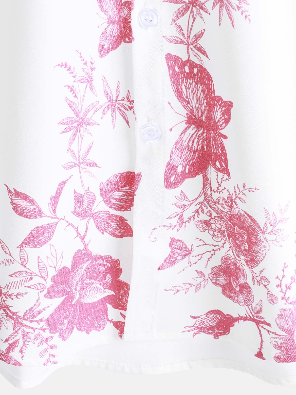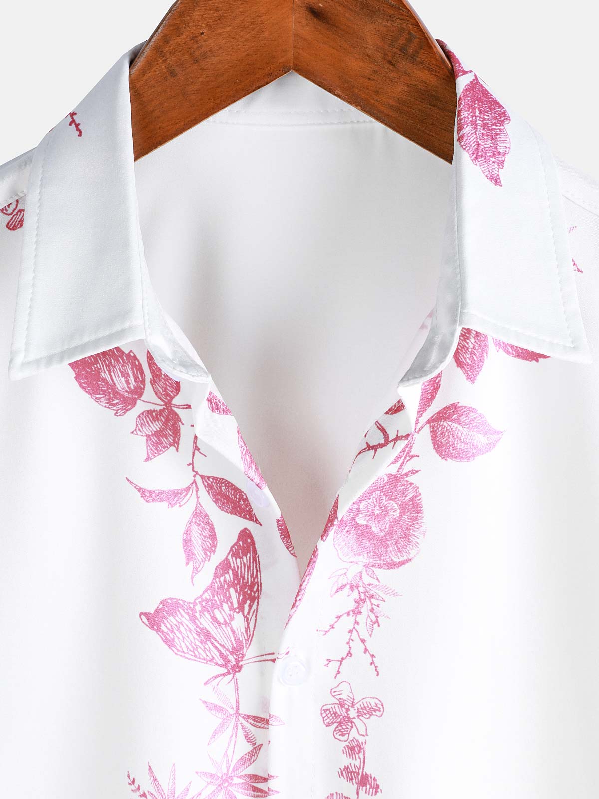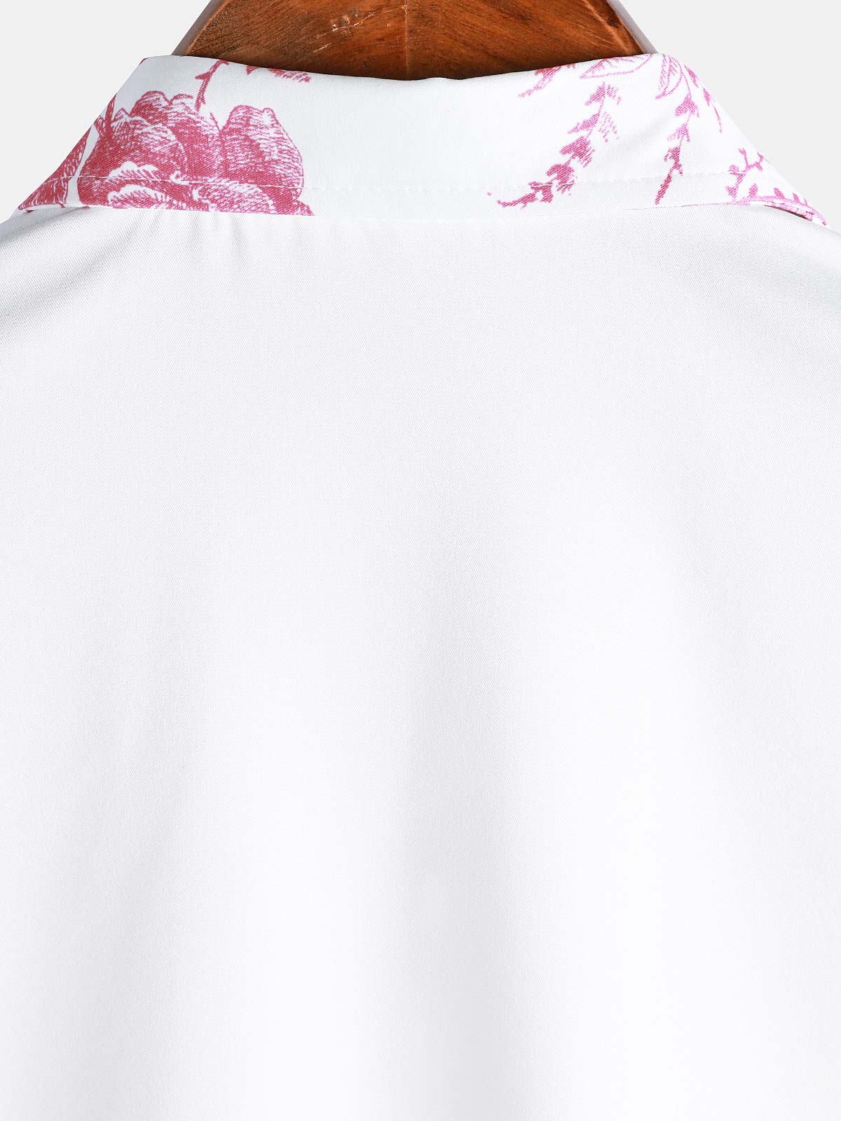 Men's Pink Floral Print Hawaiian Button Up Summer Beach Casual Collar Short Sleeve Shirt