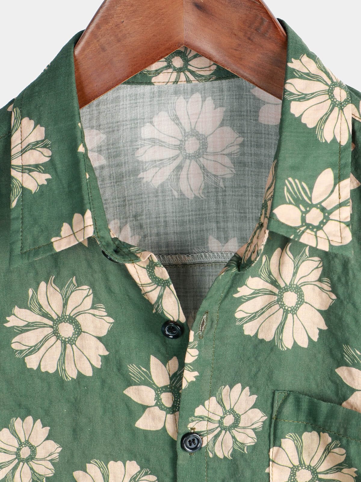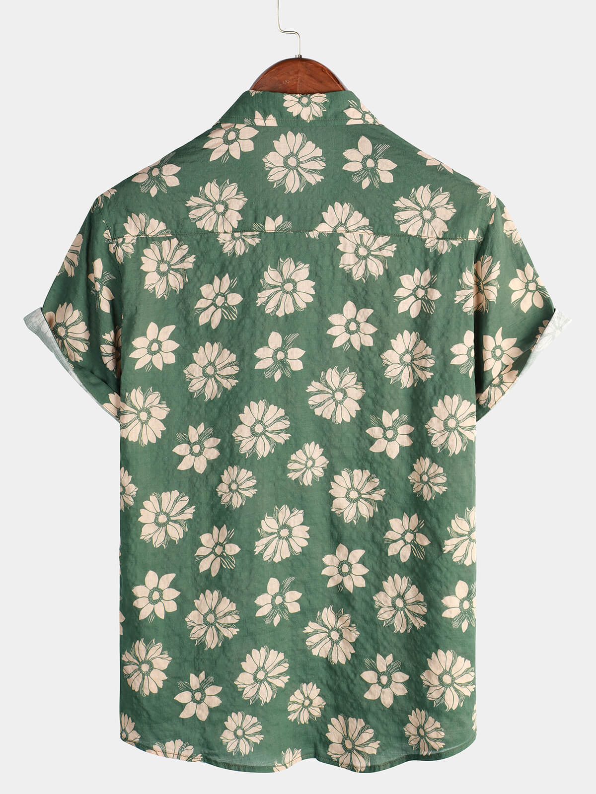 Men's Green Floral Hawaiian Short Sleeve Button Holiday Summer Shirt