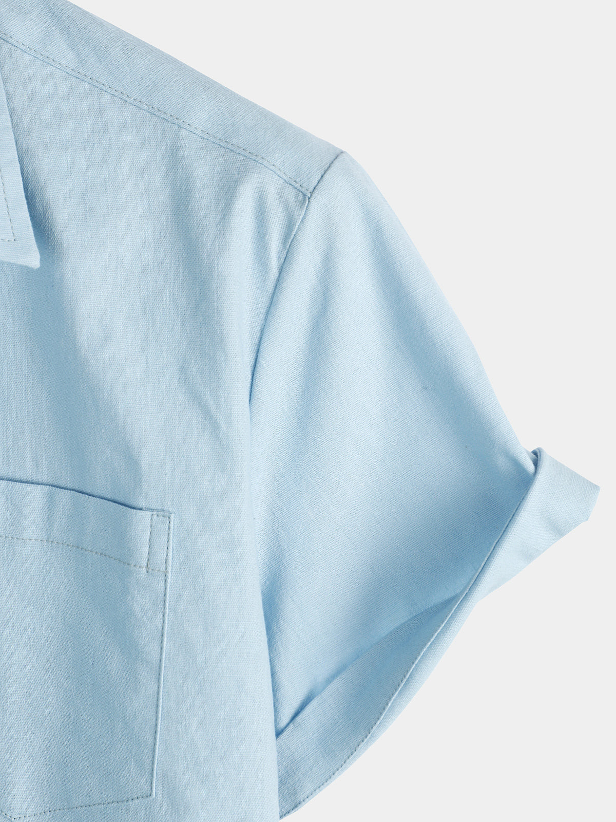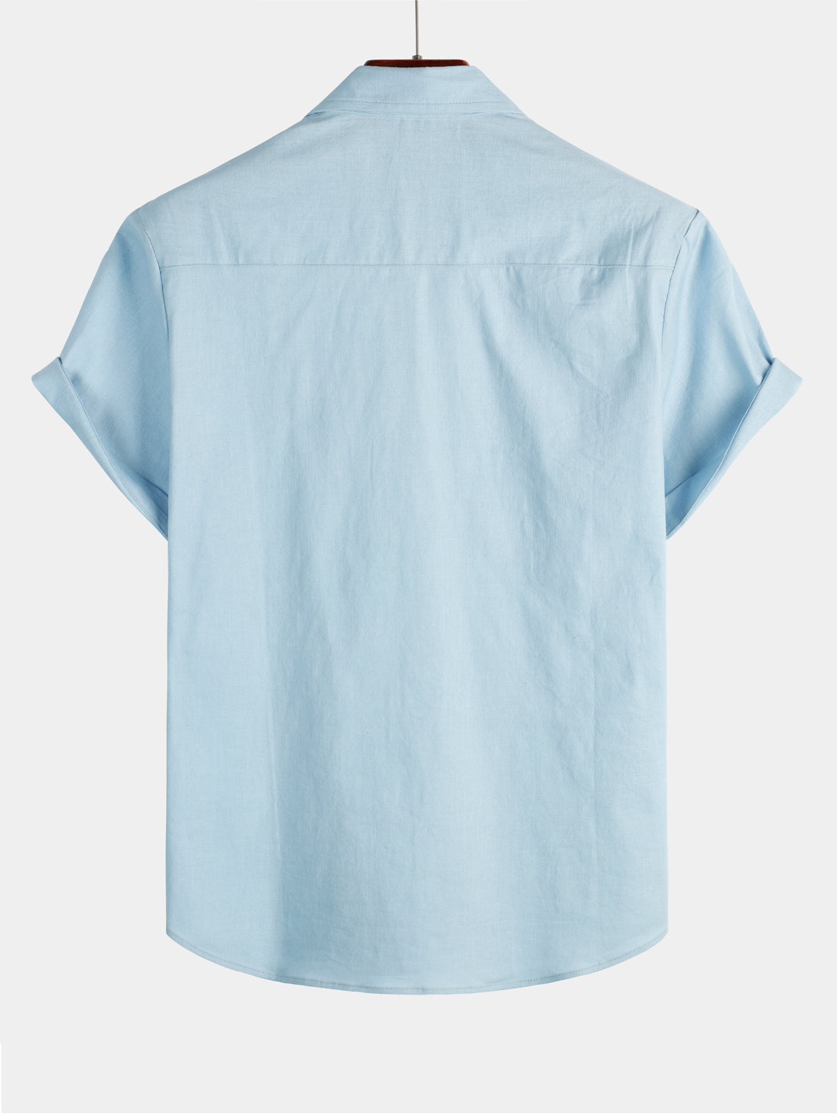 Men's Solid Color Linen Cotton Pocket Casual Button Short Sleeve Shirt