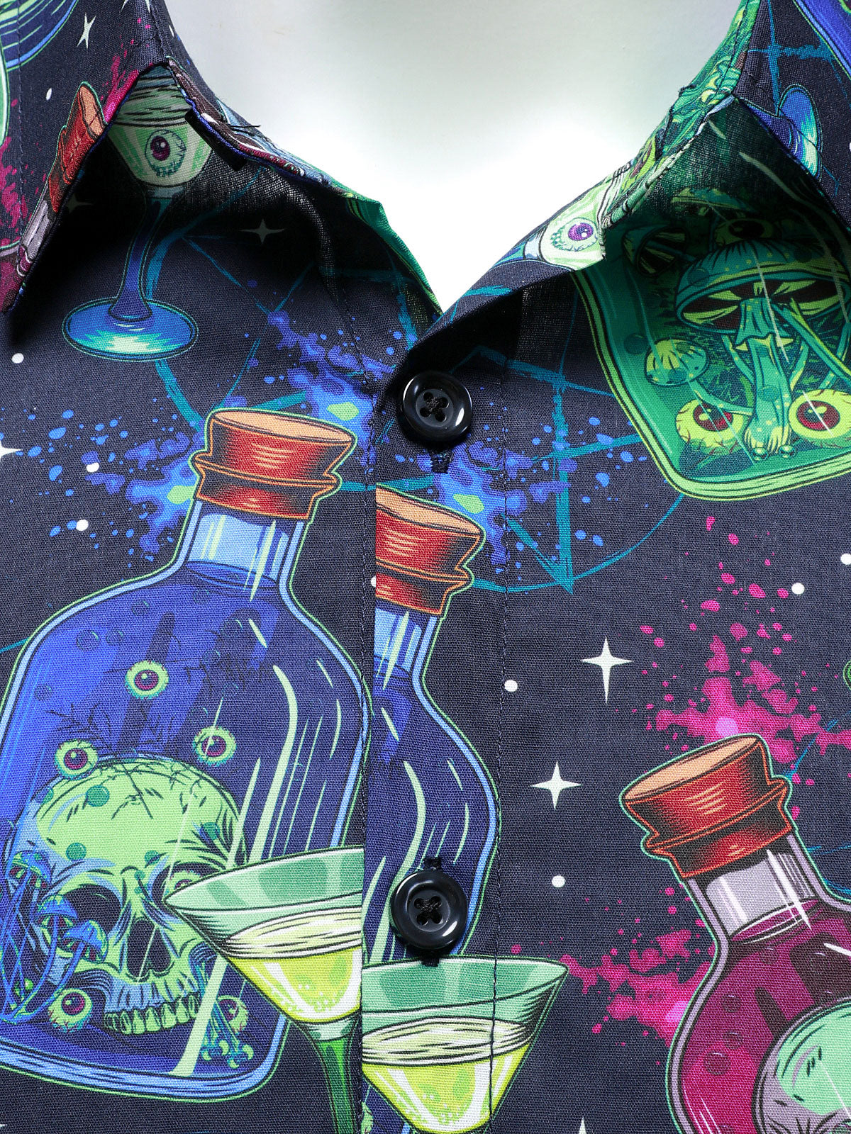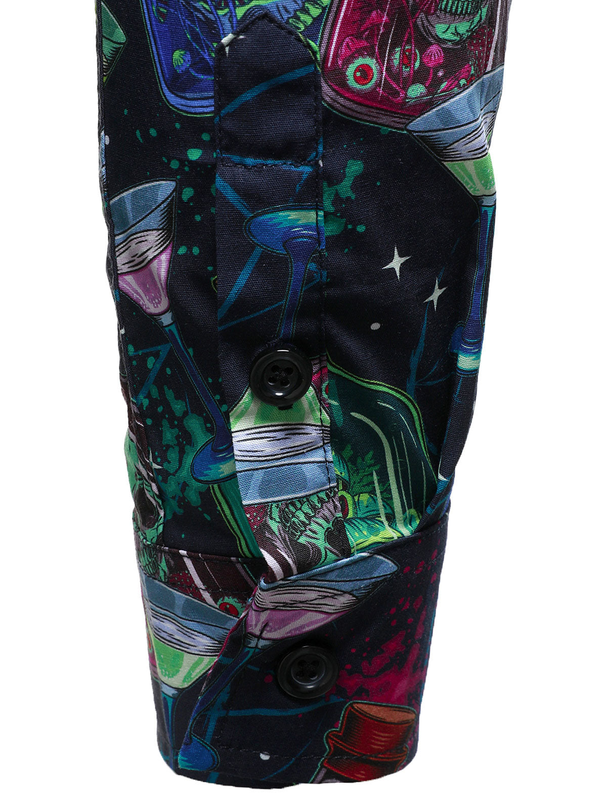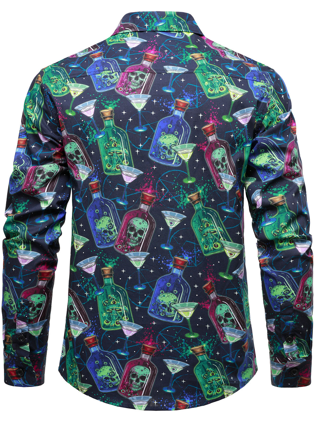 Men's Casual Holiday Wine Glass Skull Print Long Sleeve Cotton Party Shirt