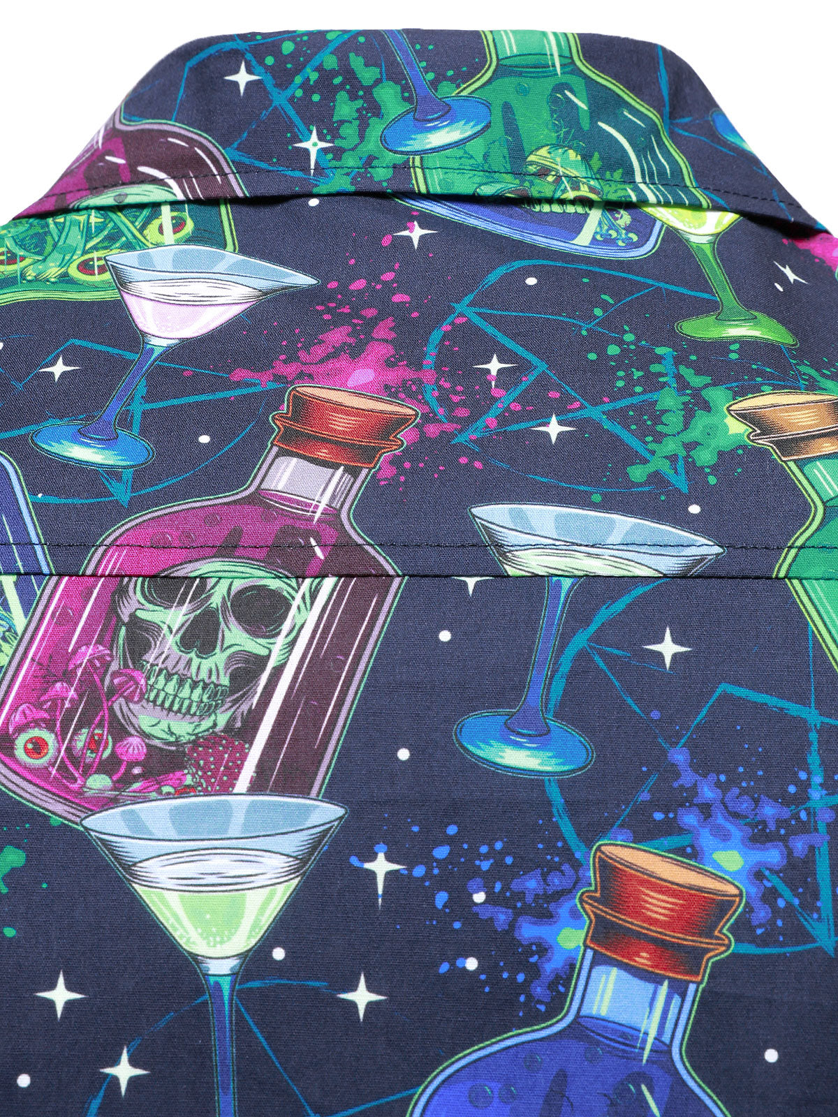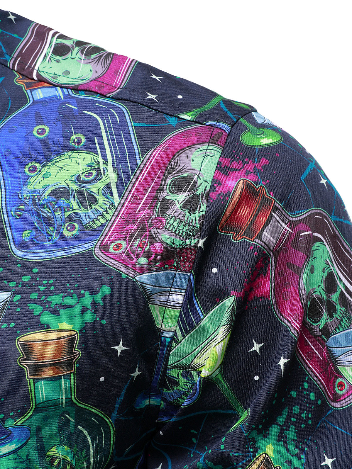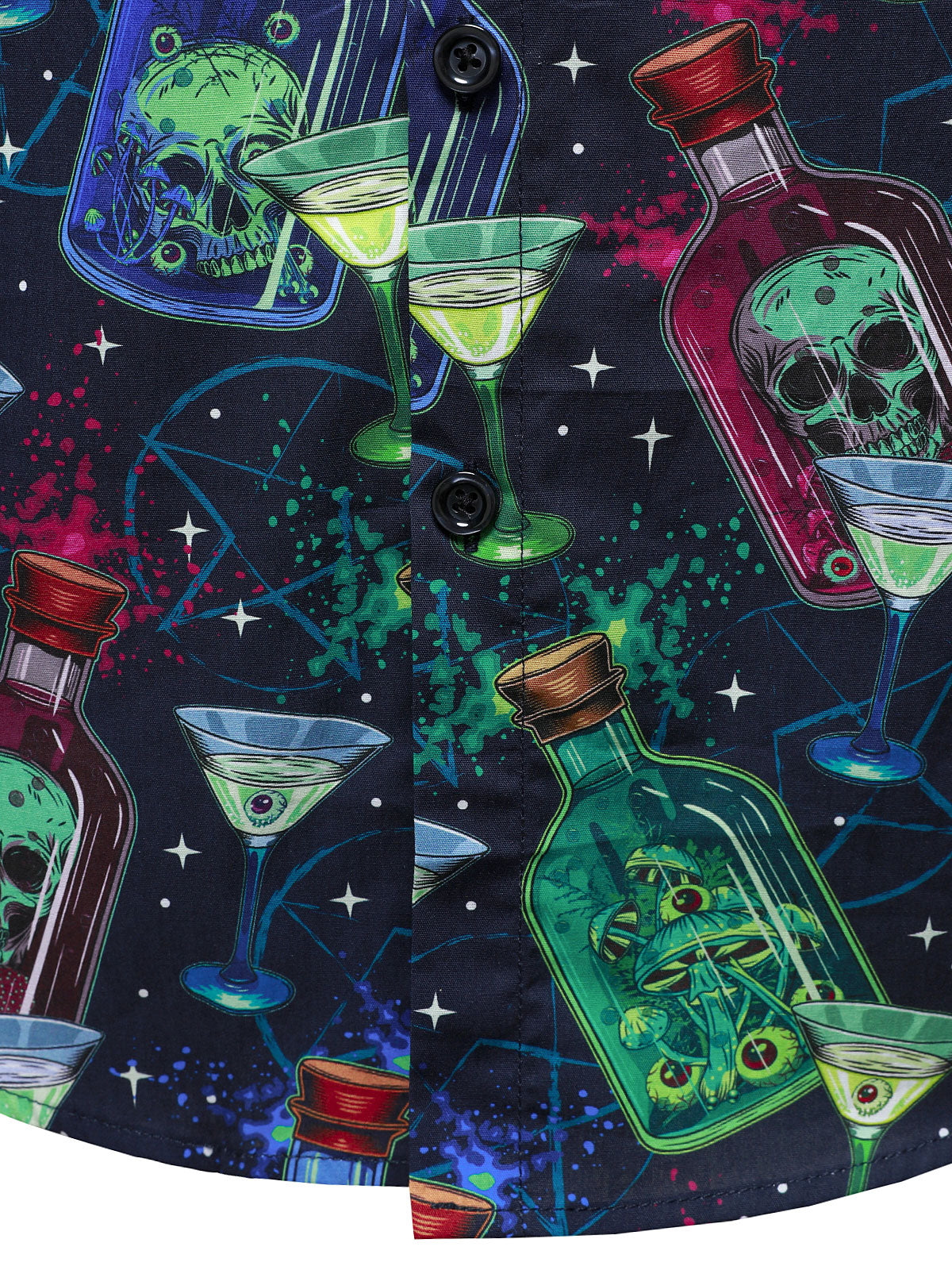 Men's Casual Holiday Wine Glass Skull Print Long Sleeve Cotton Party Shirt