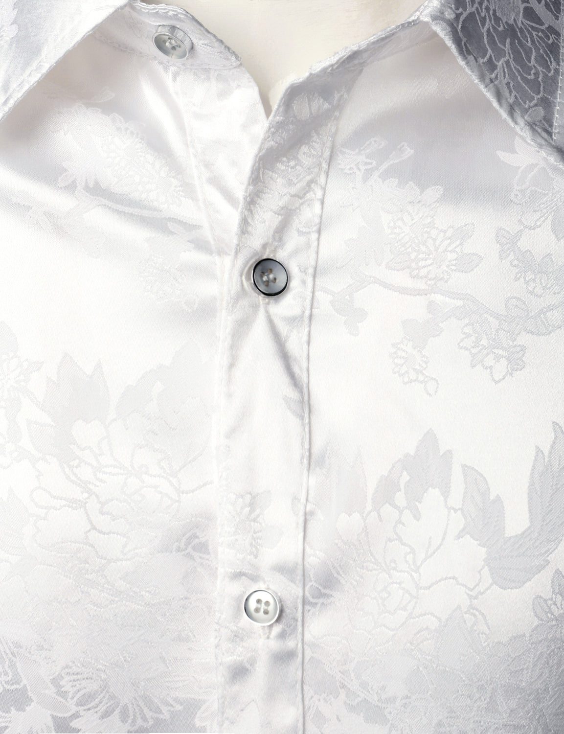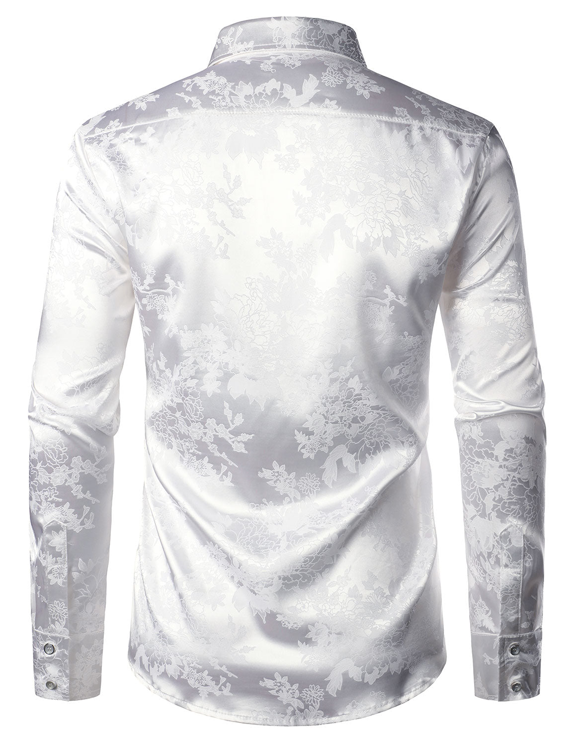 Men's Floral Jacquard Shiny Satin White Long Sleeve Button Up Dress Shirt