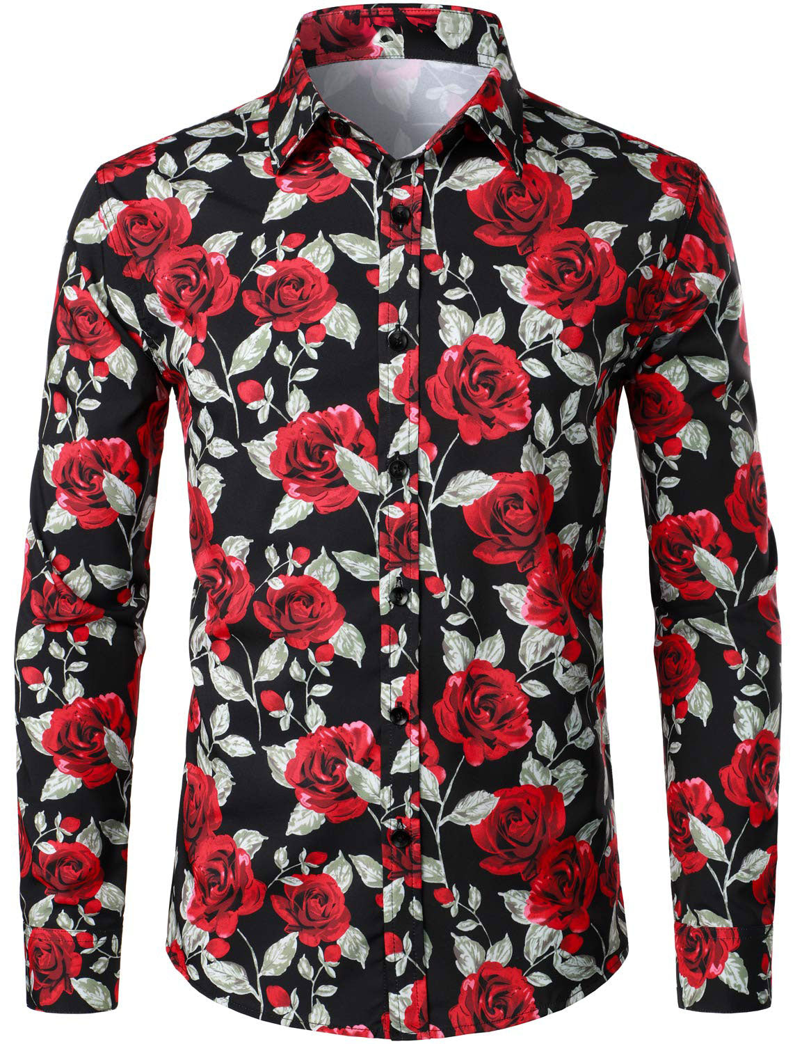 Men's Red Rose Casual Button Long Sleeve Shirt