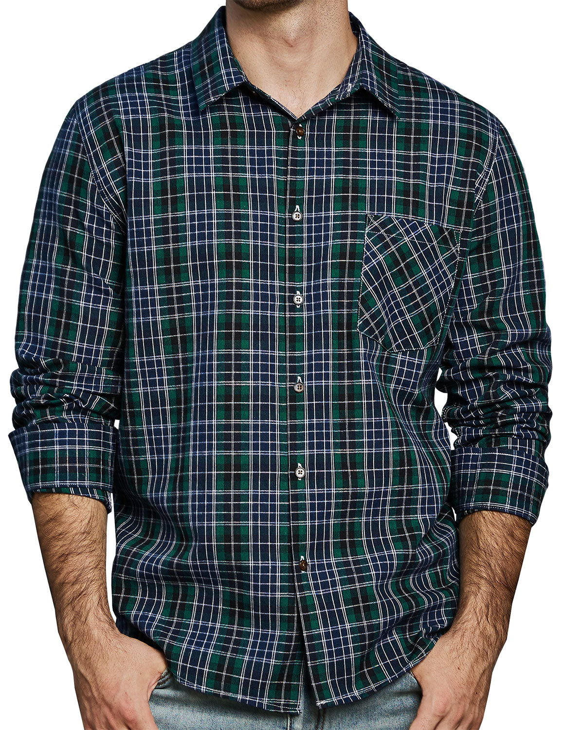 Men's Casual Retro Plaid Pocket Long Sleeve Dress Shirt