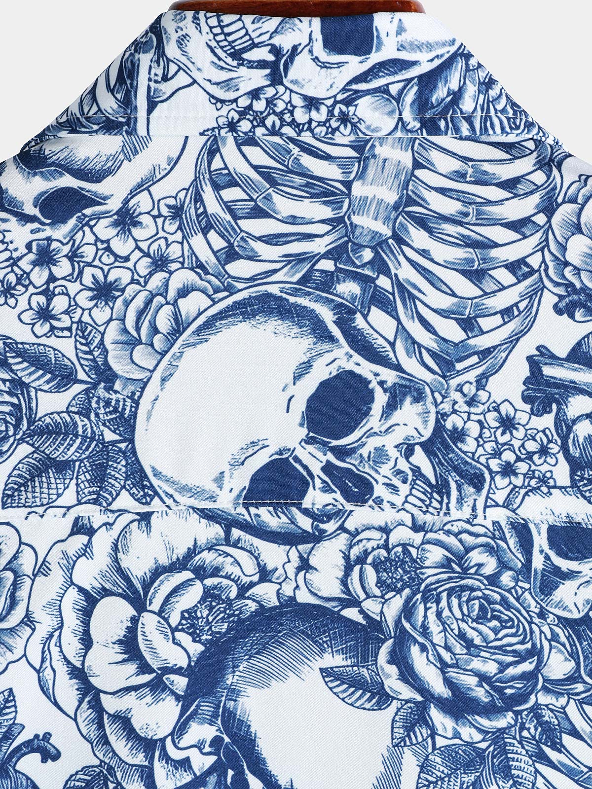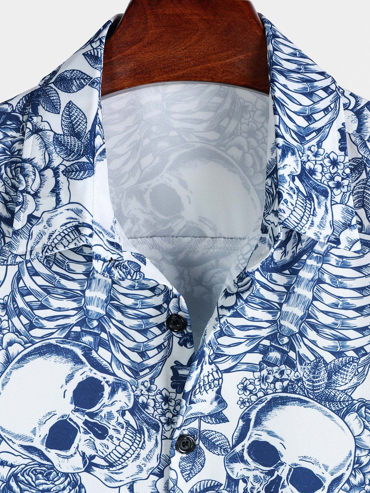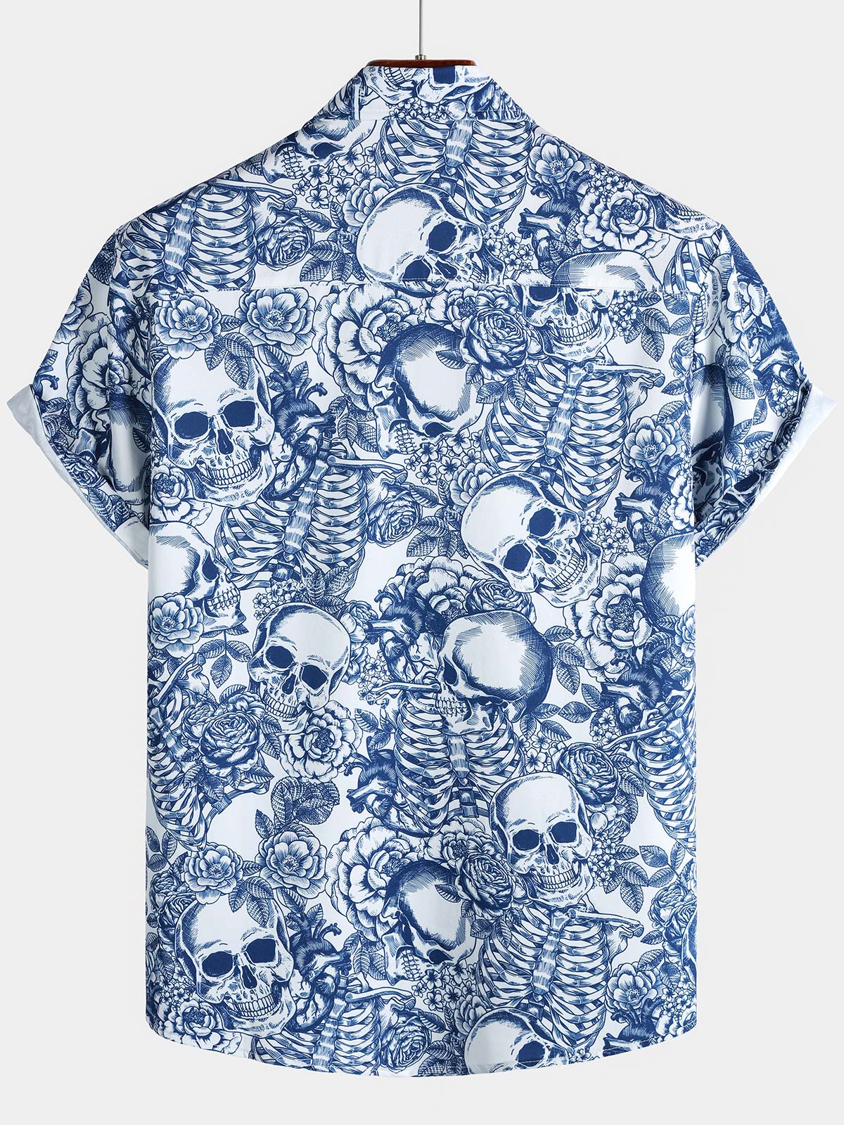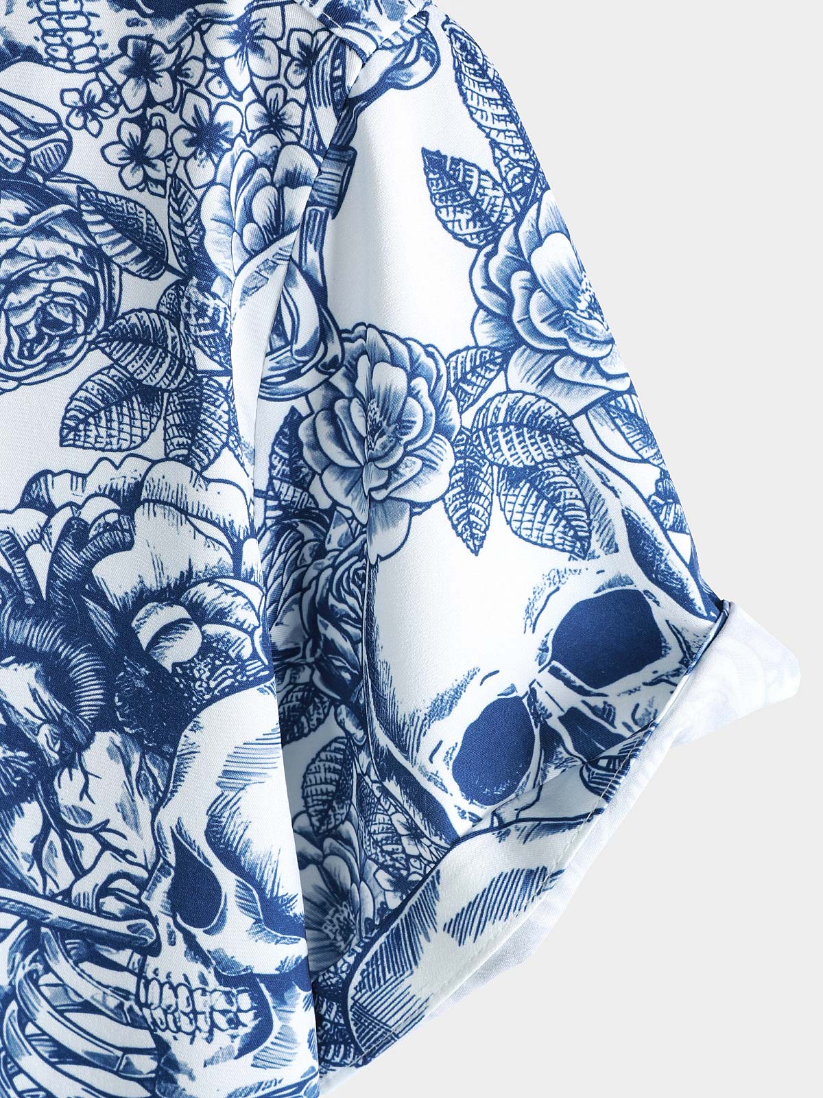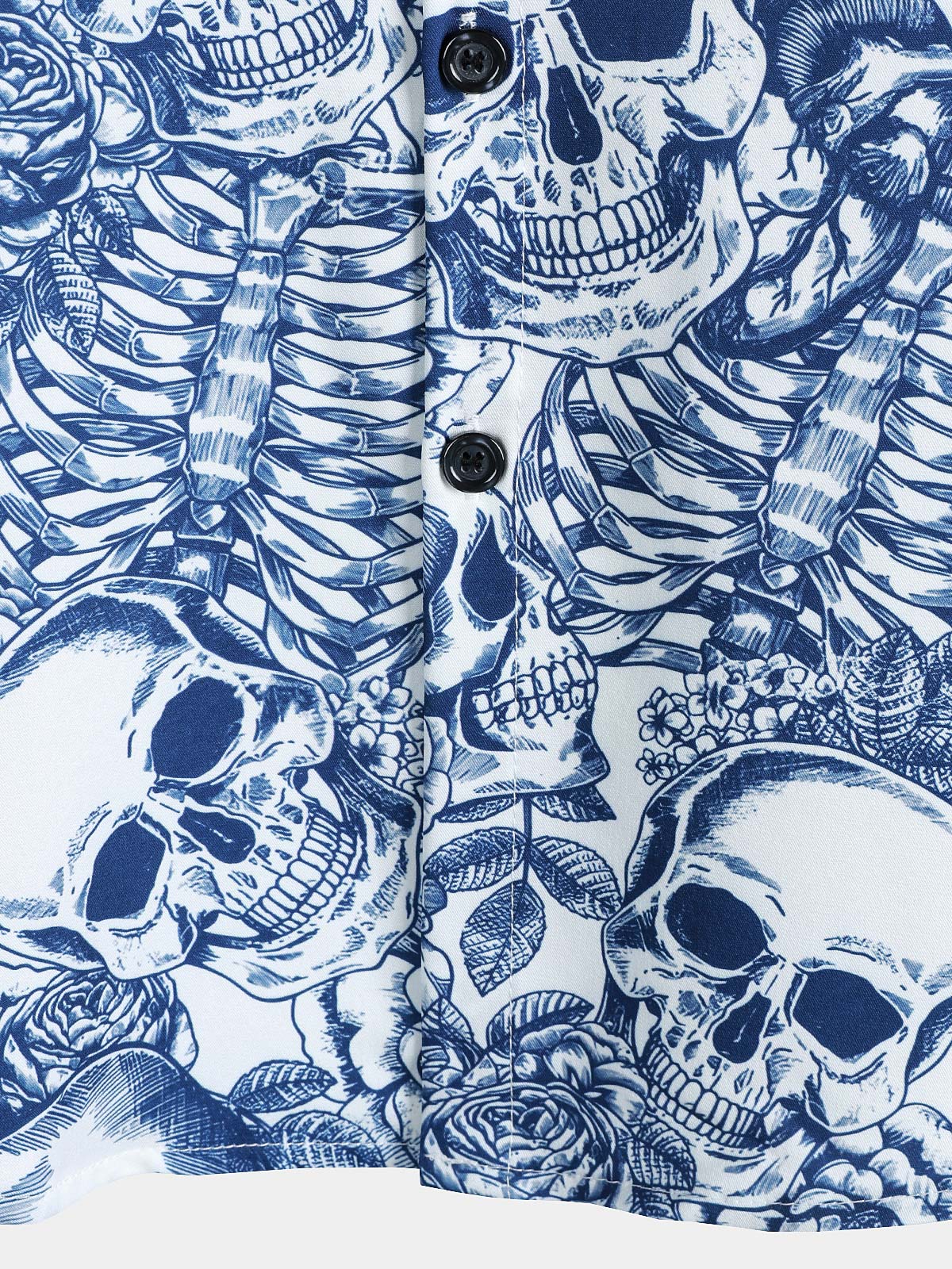 Men's Blue Flower Skull Graphic Button Up Short Sleeve Punk Rock Art Shirt