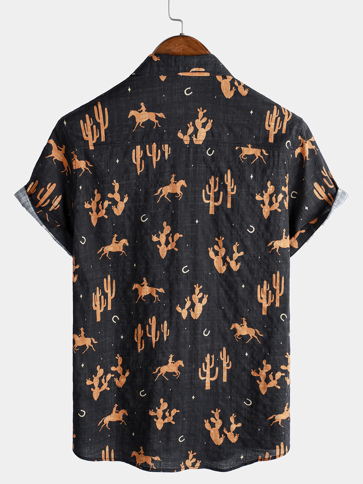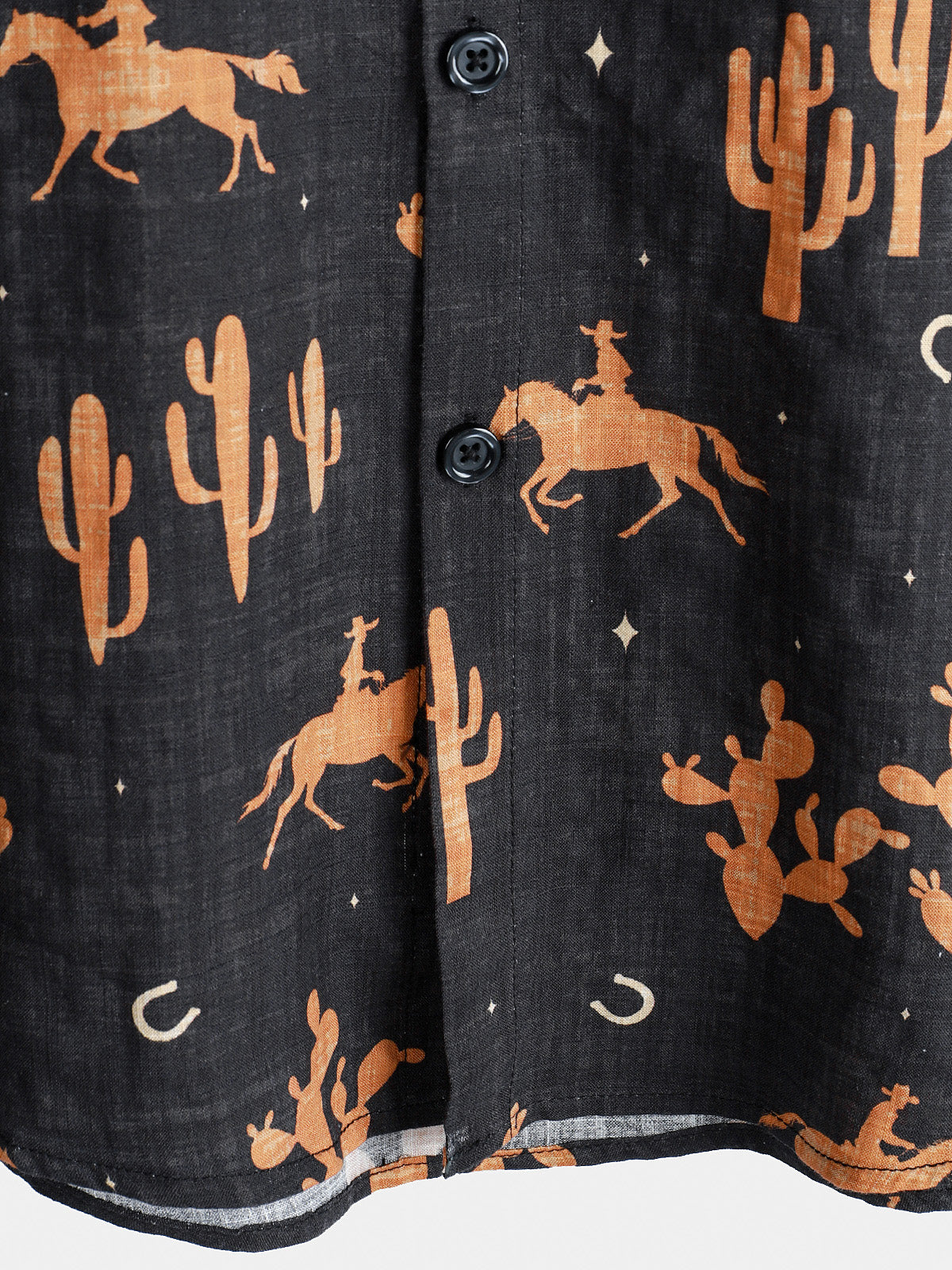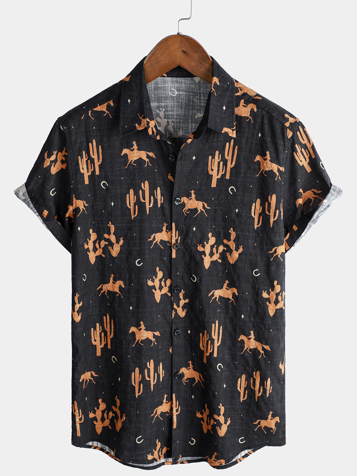 Men's Holiday Horse Print Cowboy Button Up Short Sleeve Shirt