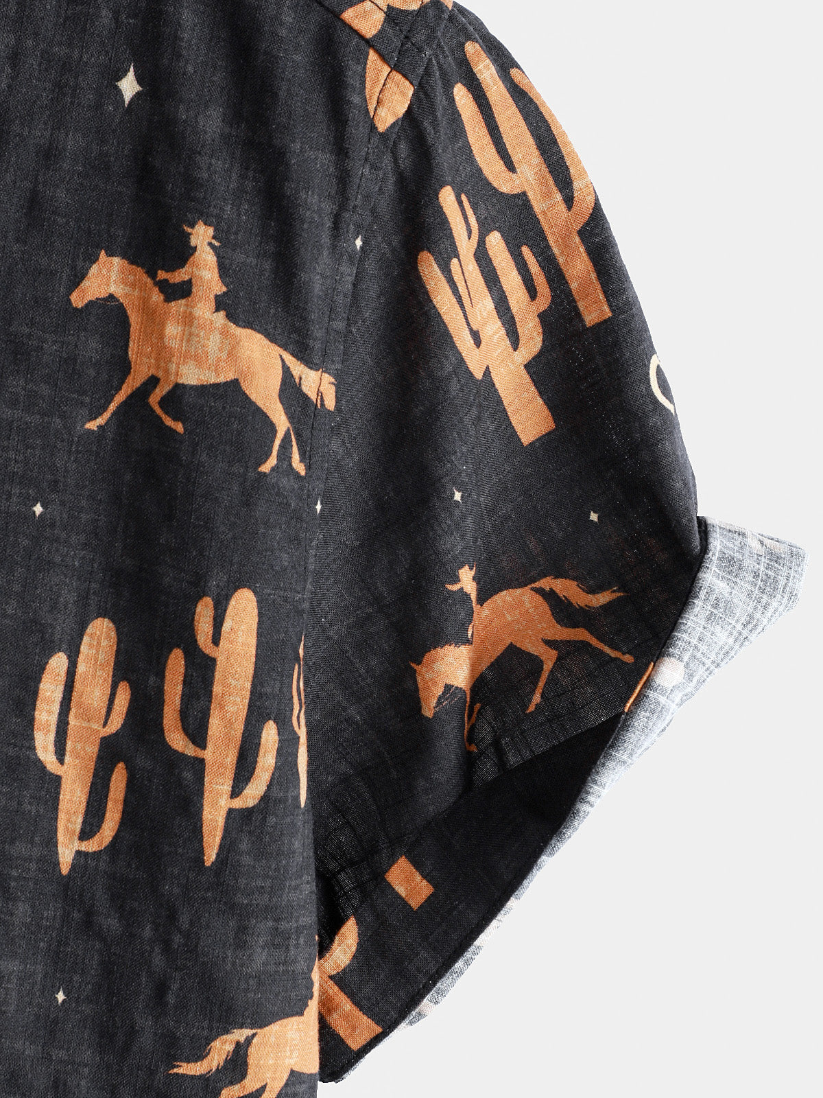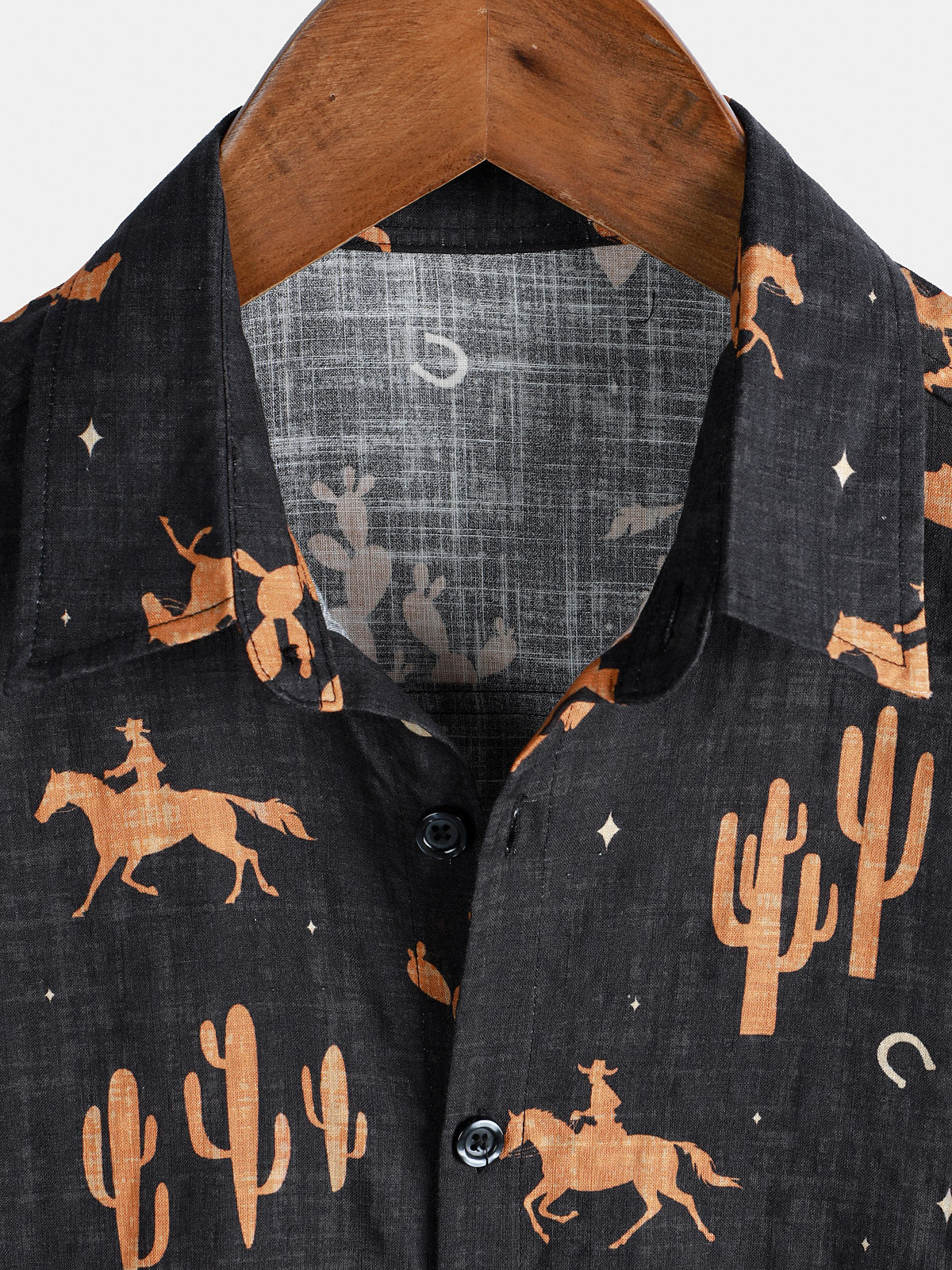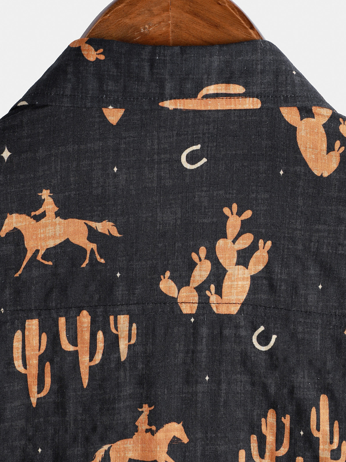 Men's Holiday Horse Print Cowboy Button Up Short Sleeve Shirt