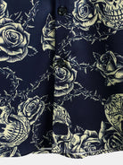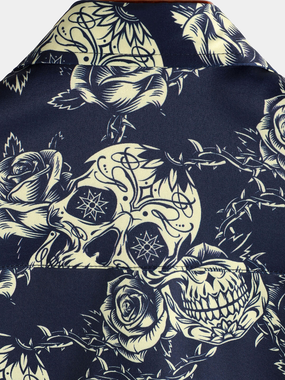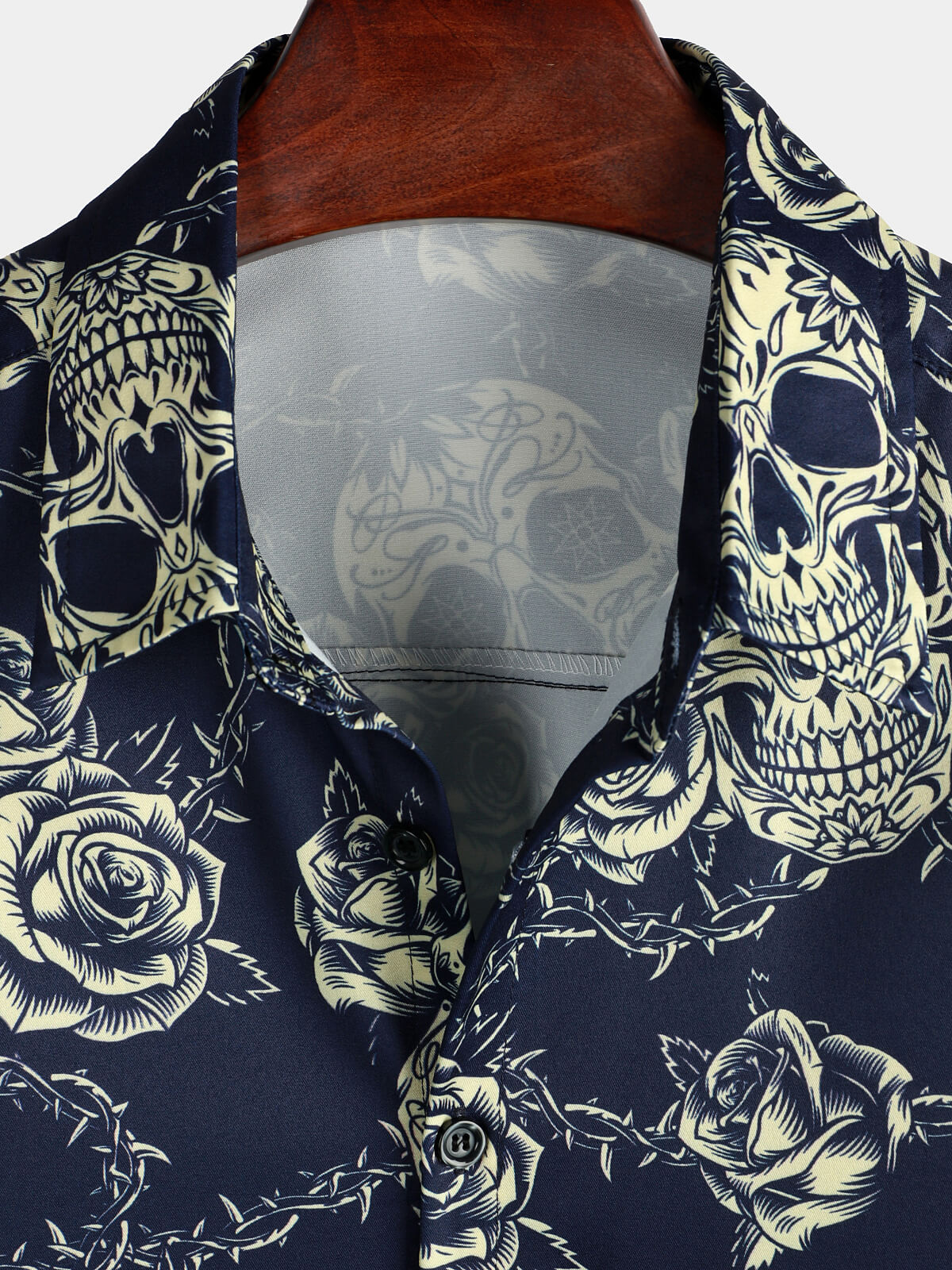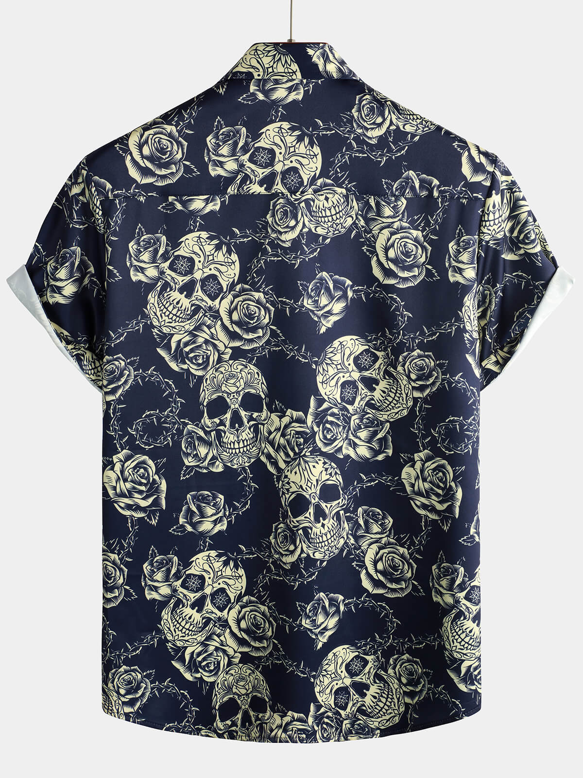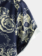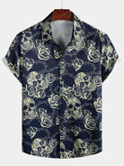 Men's Rock Skull Vintage Rose Print Button Up Short Sleeve Shirt