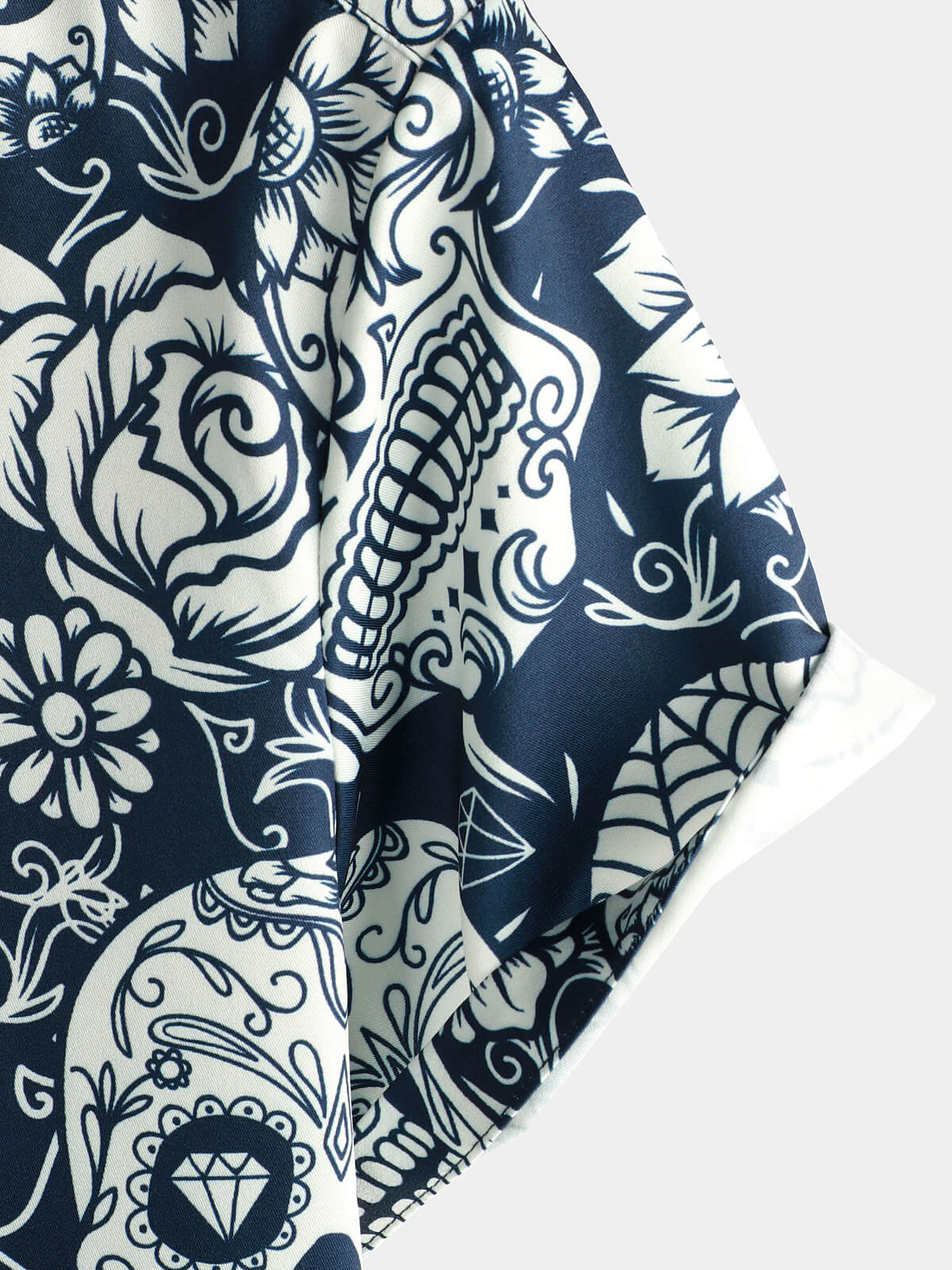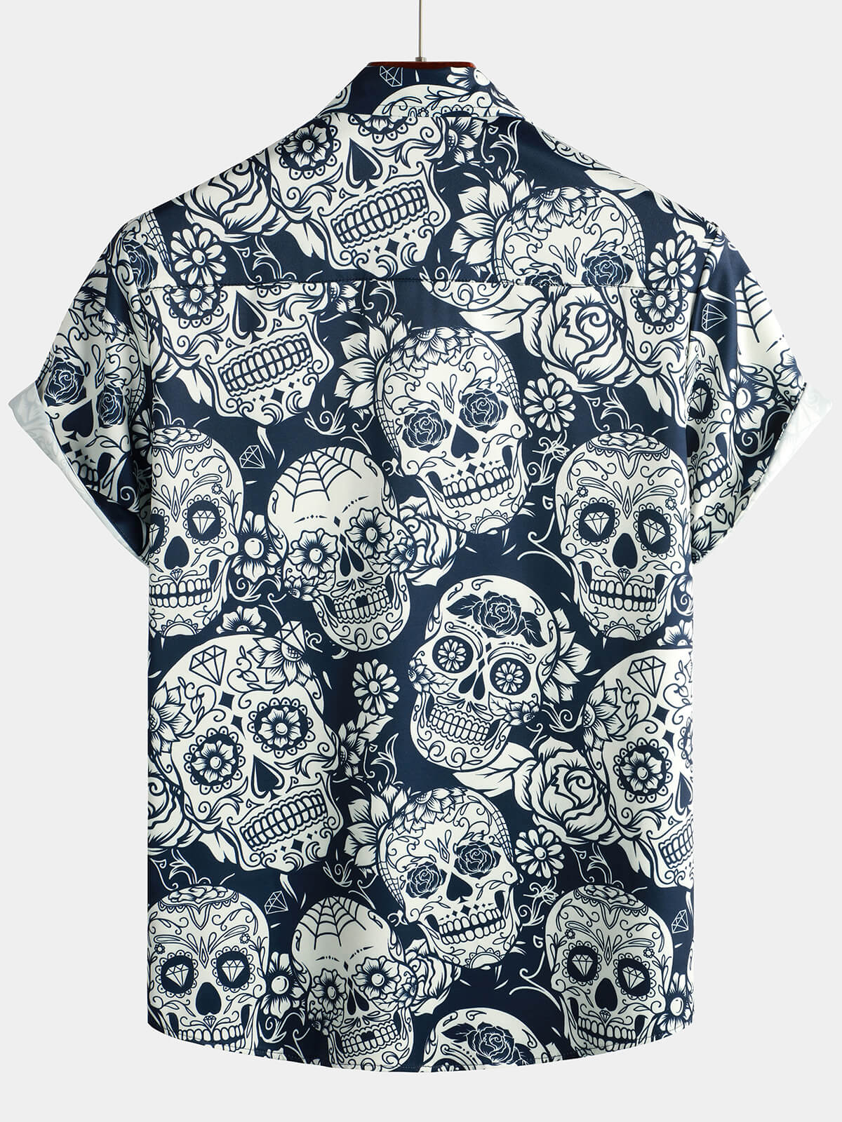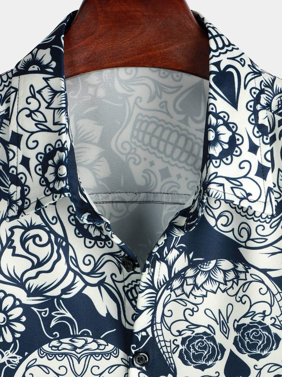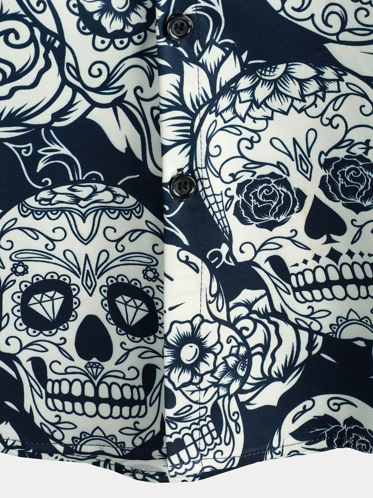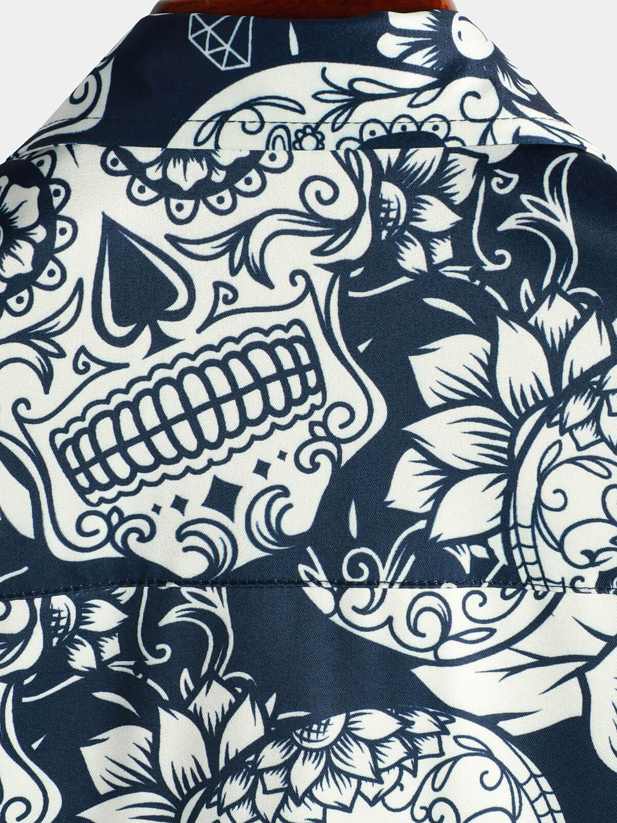 Men's Sugar Skull Floral Print Cool Button Up Funny Short Sleeve Hawaiian Shirt