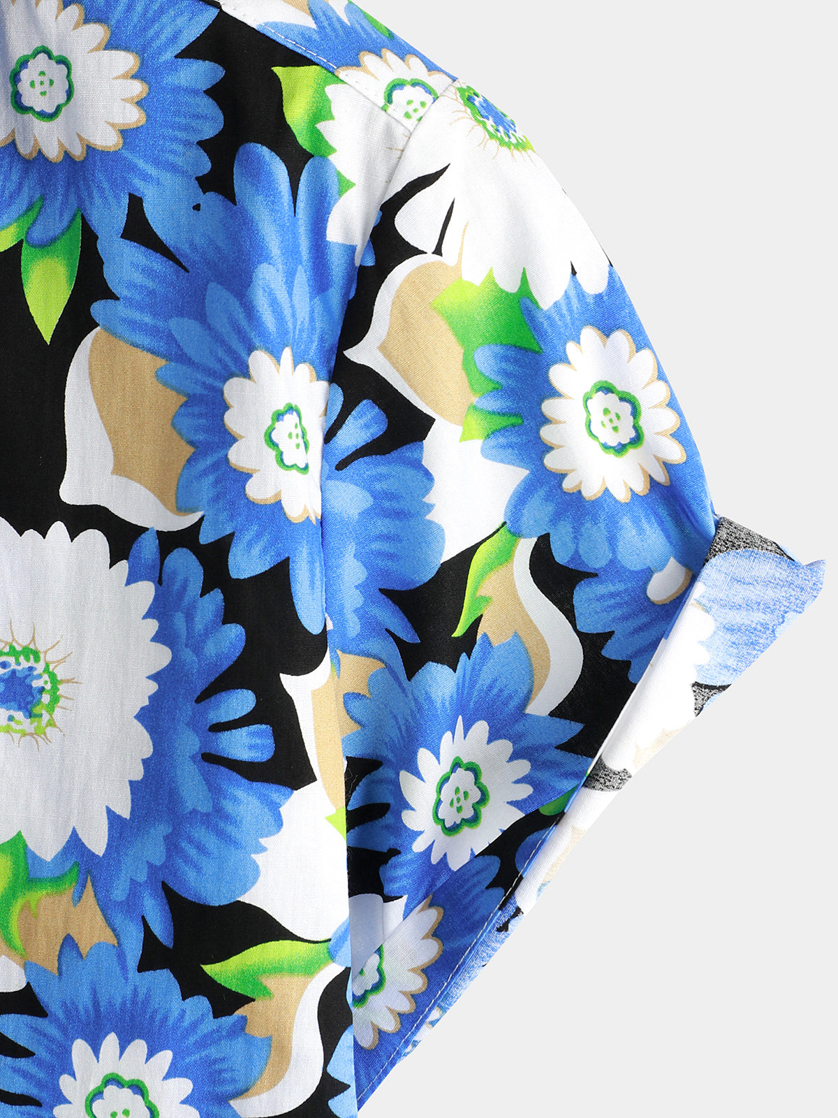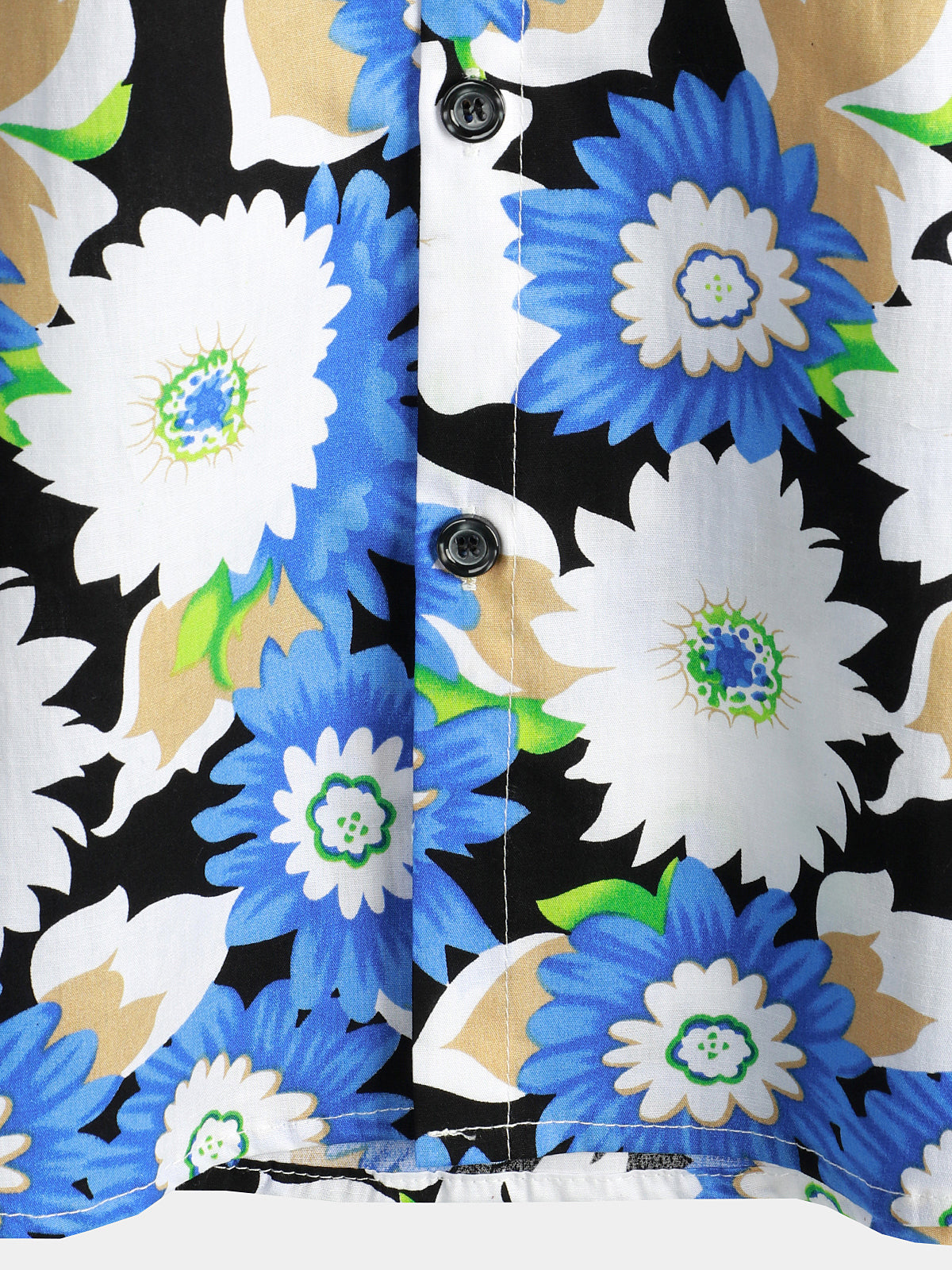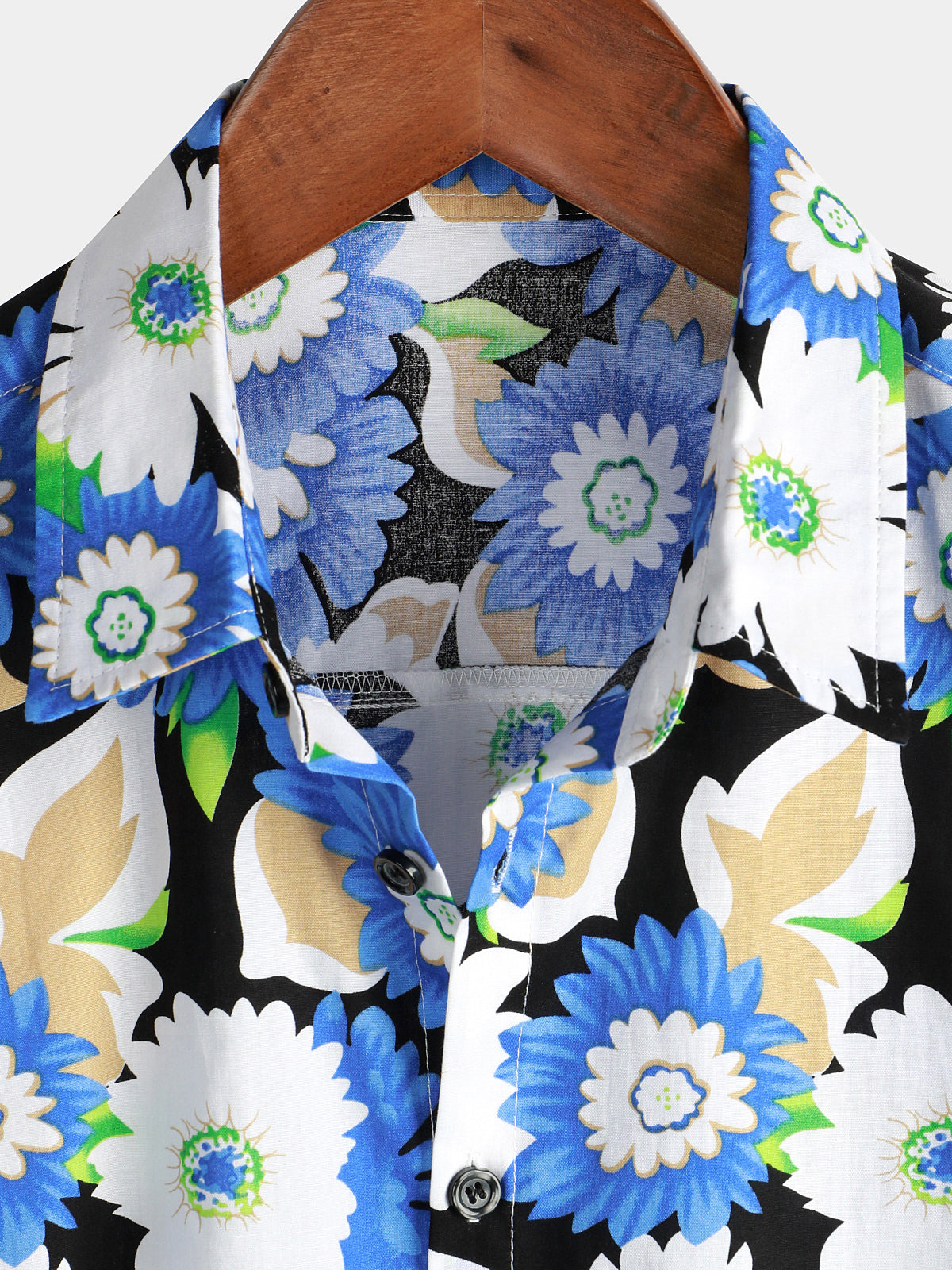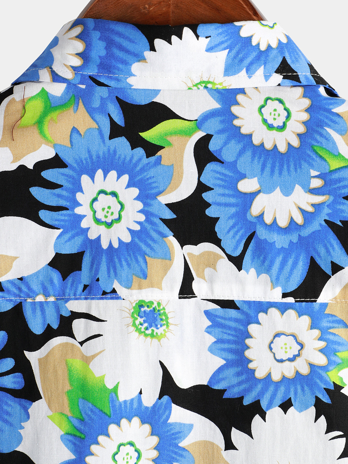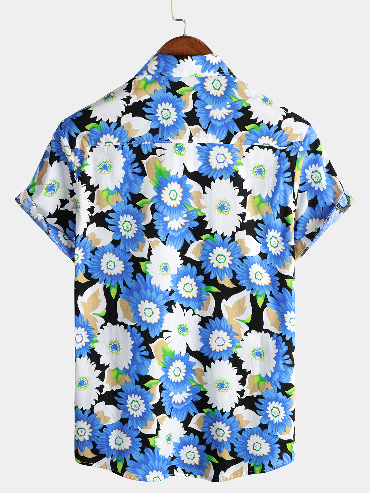 Men's Floral Print Breathable Cotton Cool Short Sleeve Blue Flower Button Up Shirt