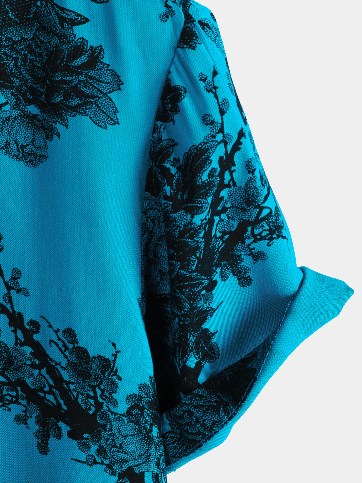 Men's Blue Retro Holiday Breathable Flower Hawaiian Short Sleeve Shirt