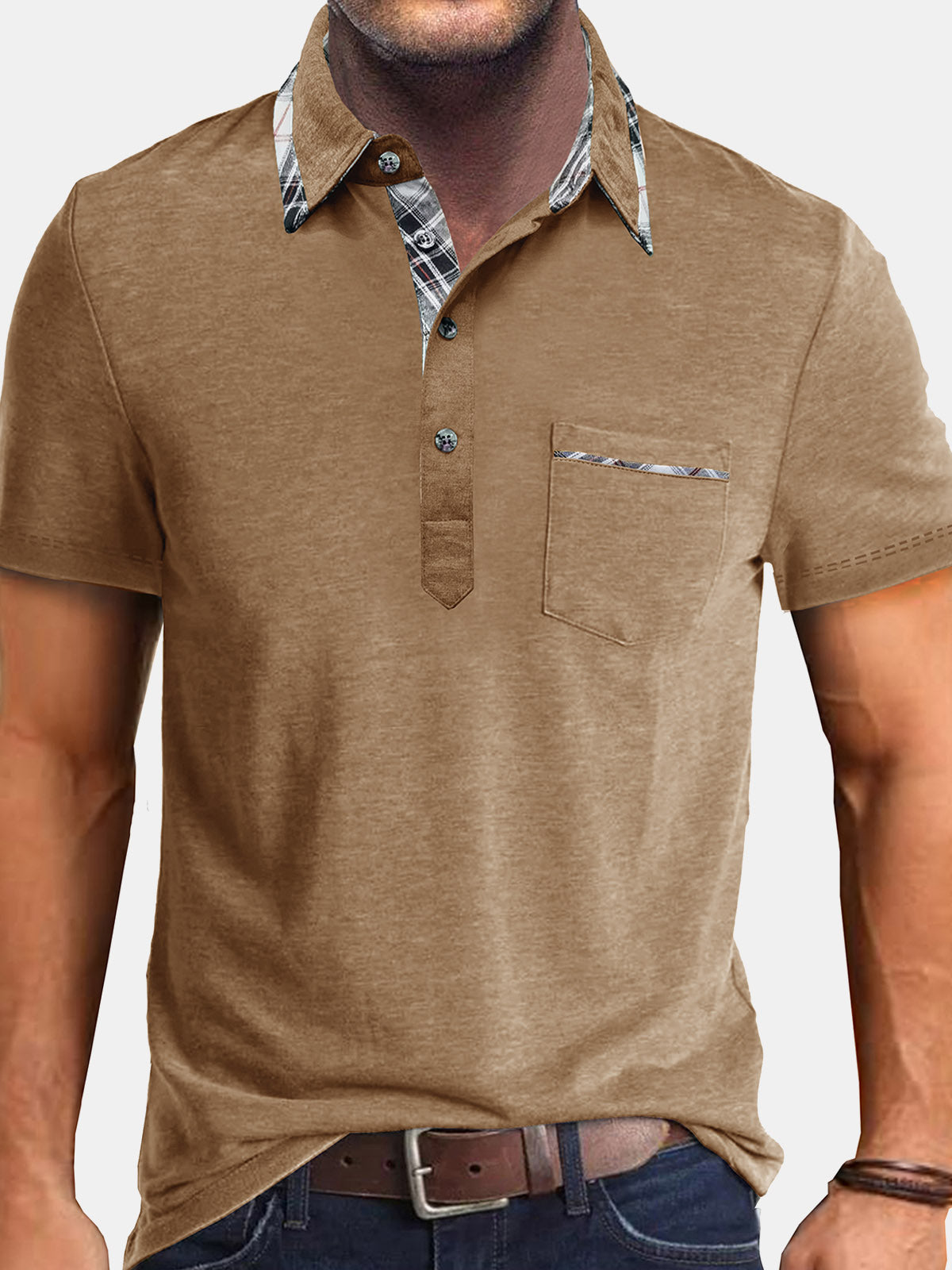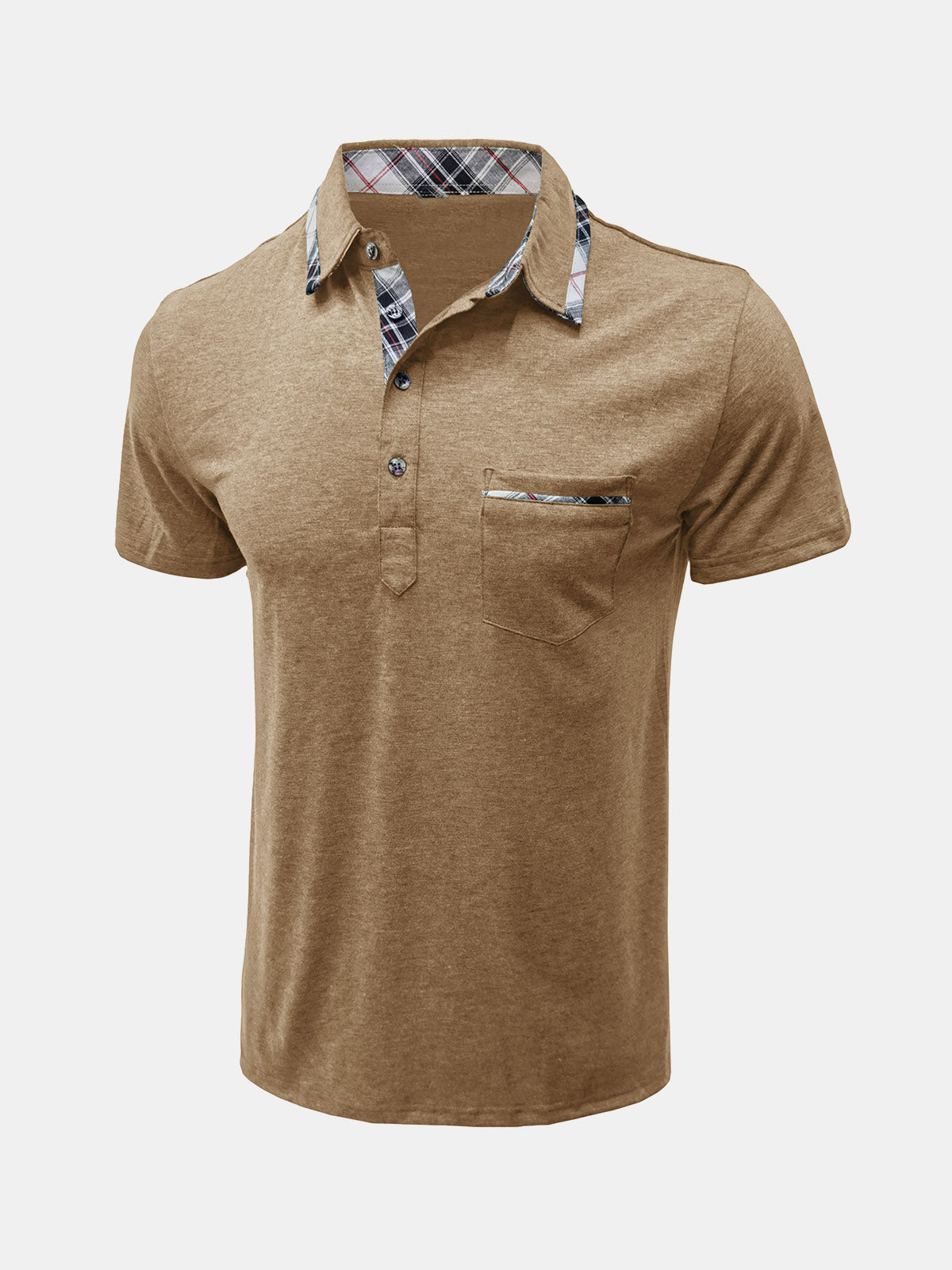Men's Summer Casual Plaid Breathable Pocket Short Sleeve Polo Shirt