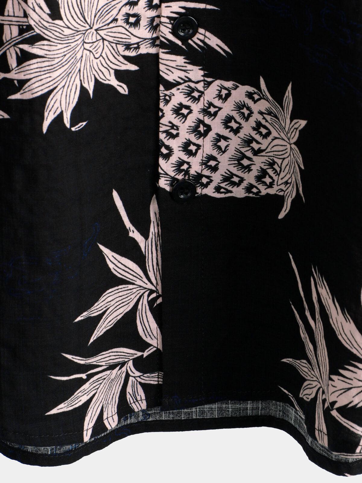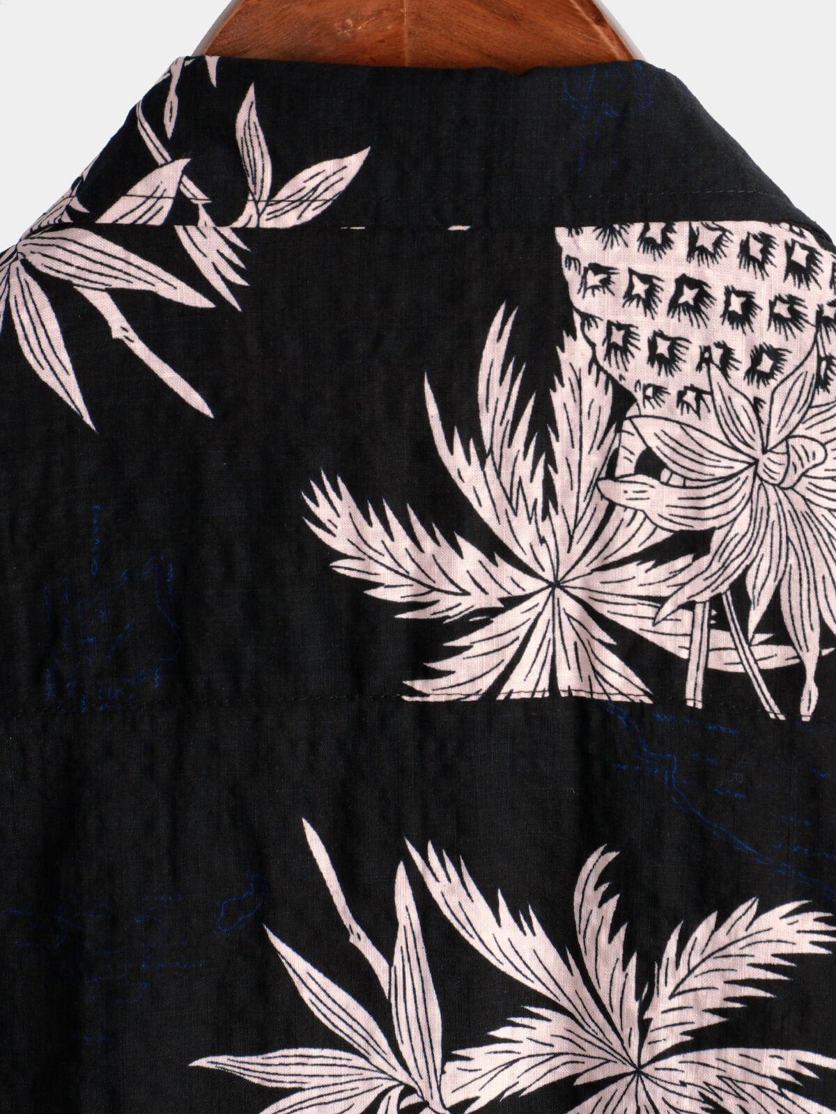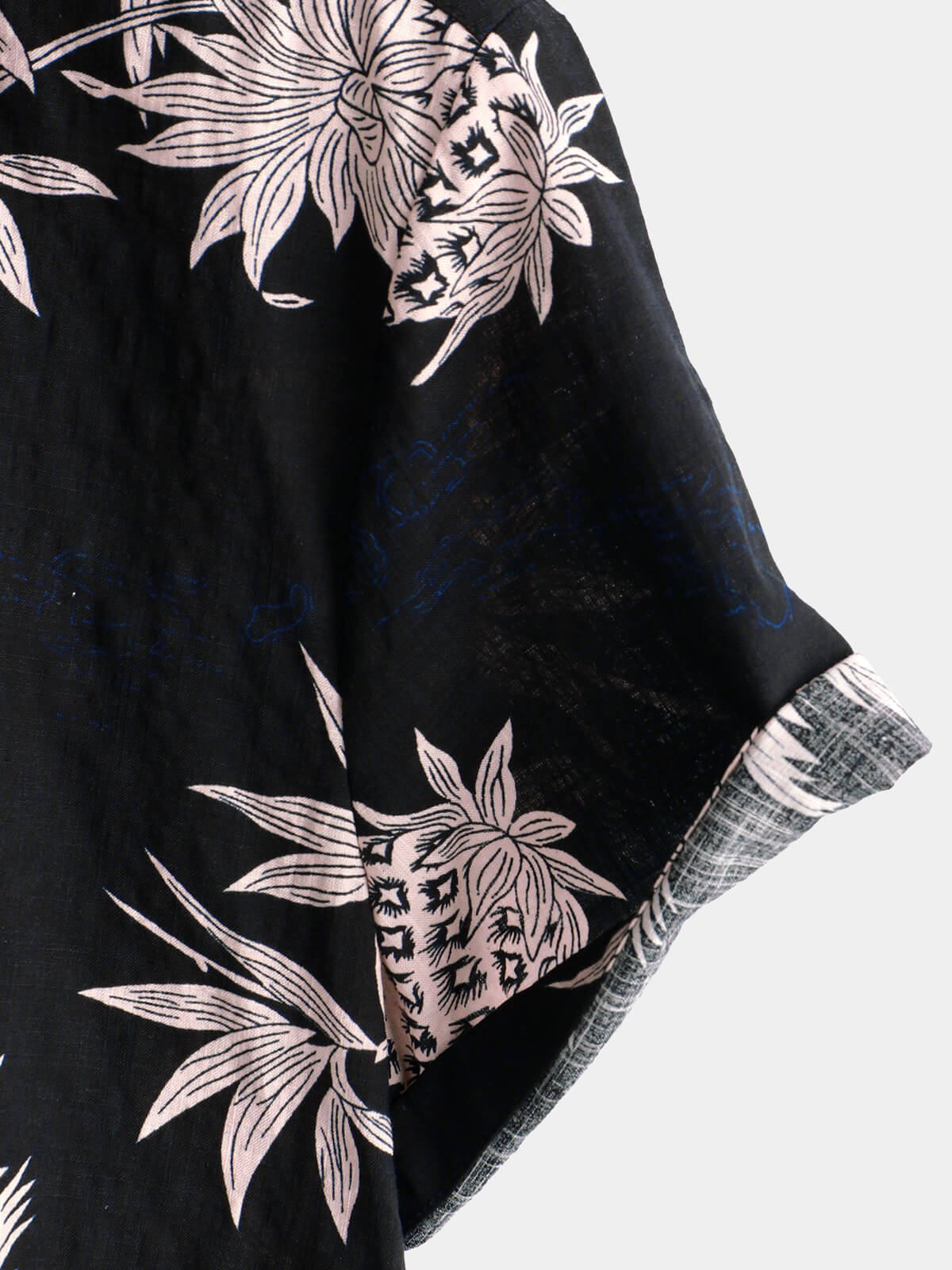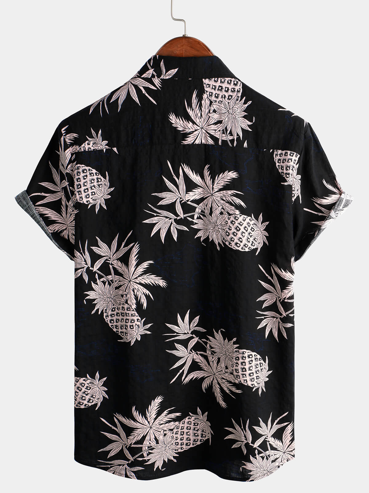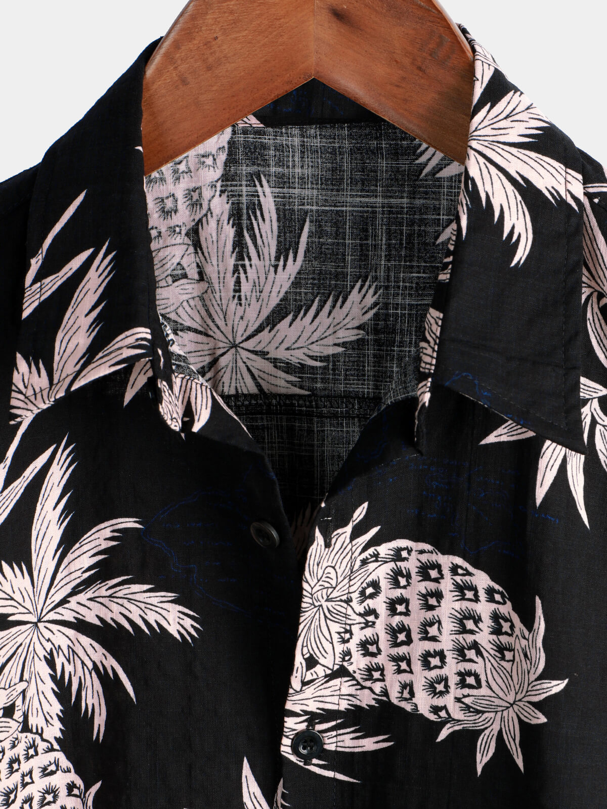 Men's Cotton Pineapple Print Black Hawaiian Beach Button Up Short Sleeve Shirt