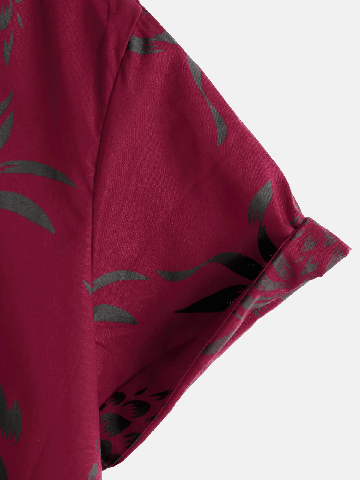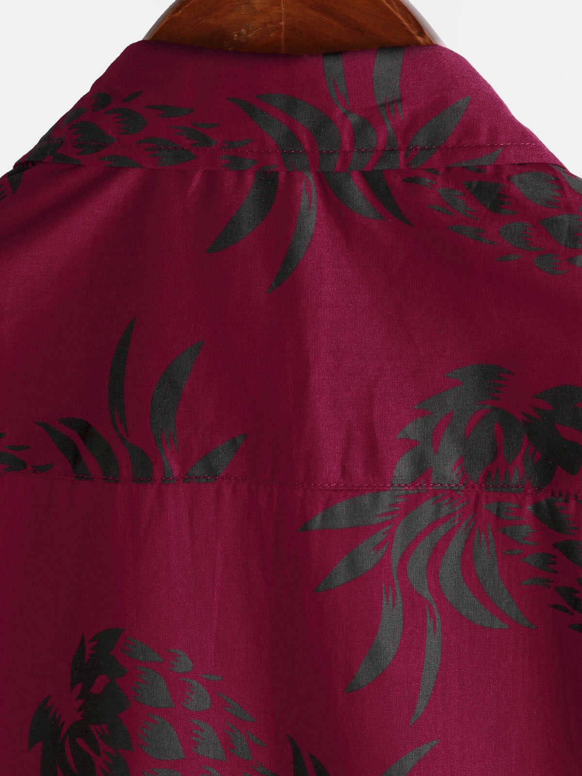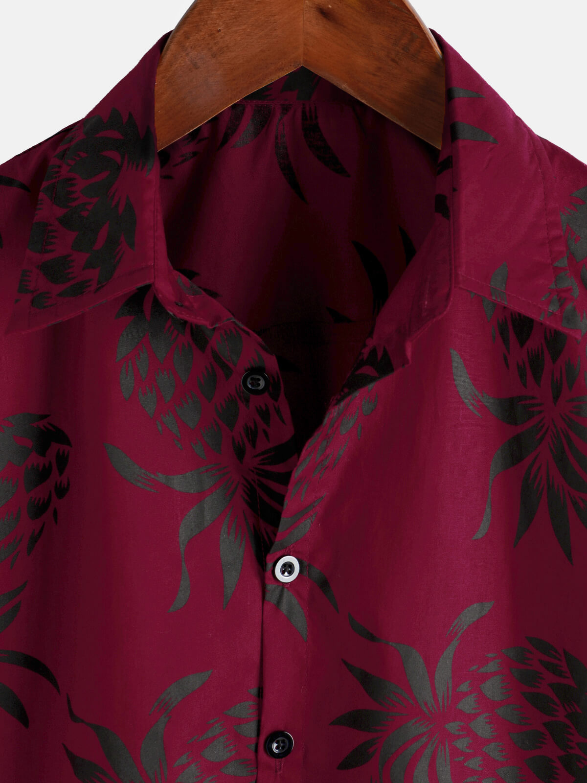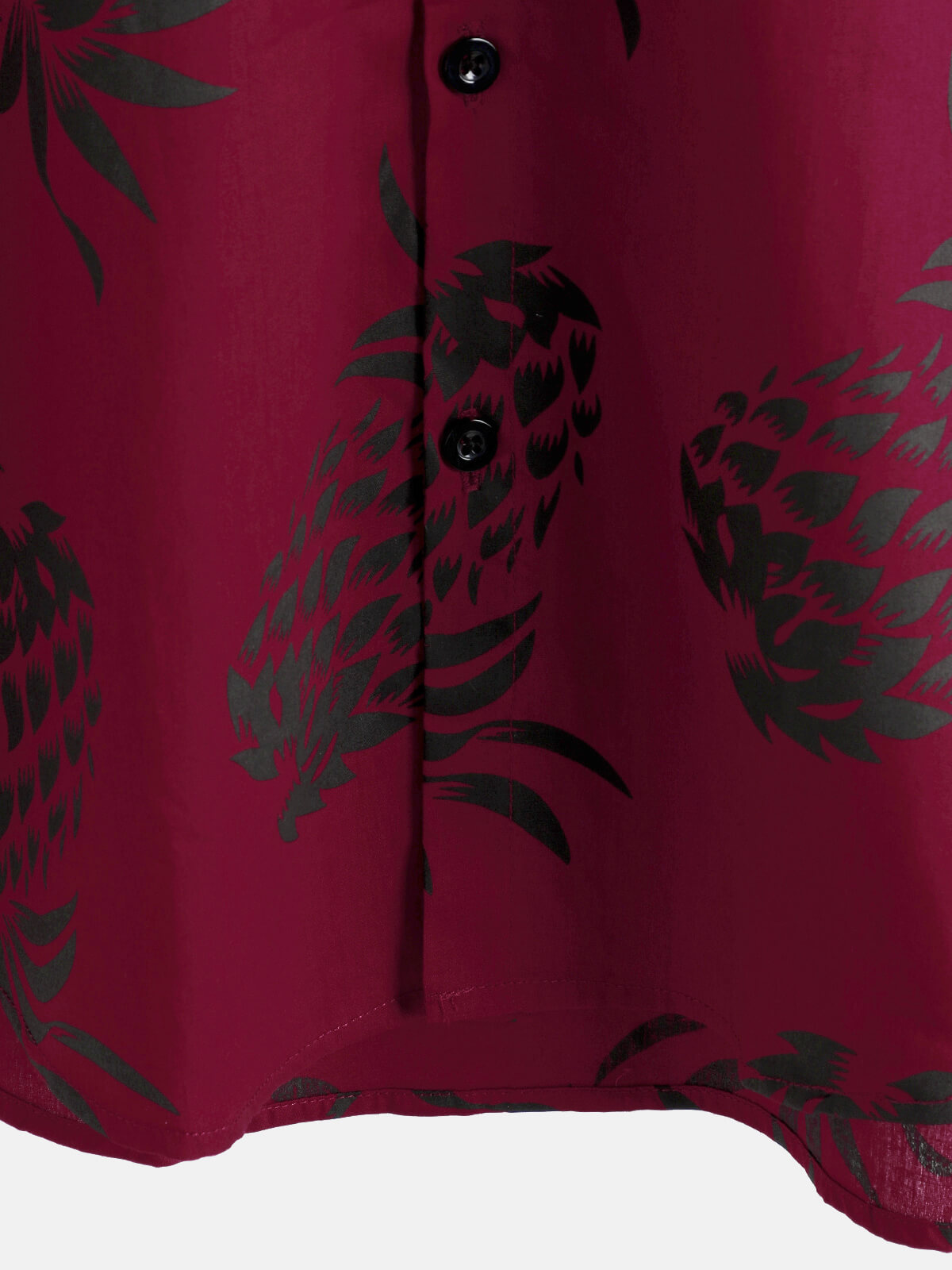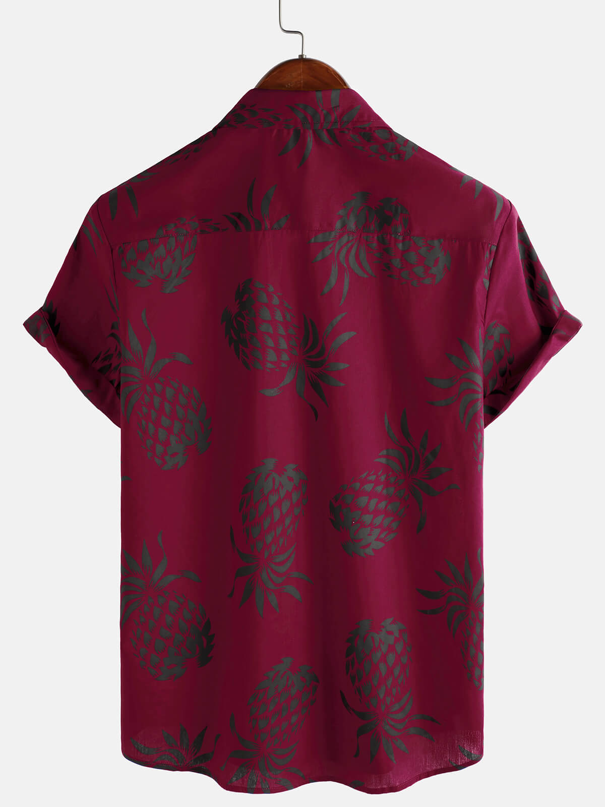 Men's Cotton Pineapple Print Red Summer Hawaiian Button Up Short Sleeve Shirt