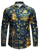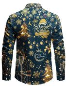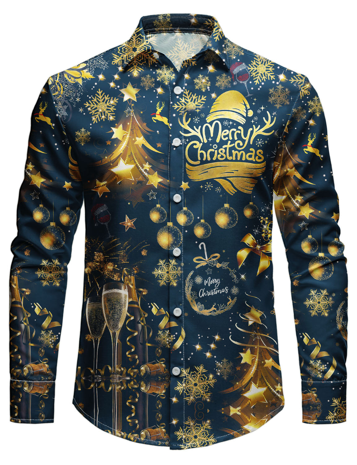 Men's Golden Merry Christmas Champagne Print Navy Blue Long Sleeve Shirt