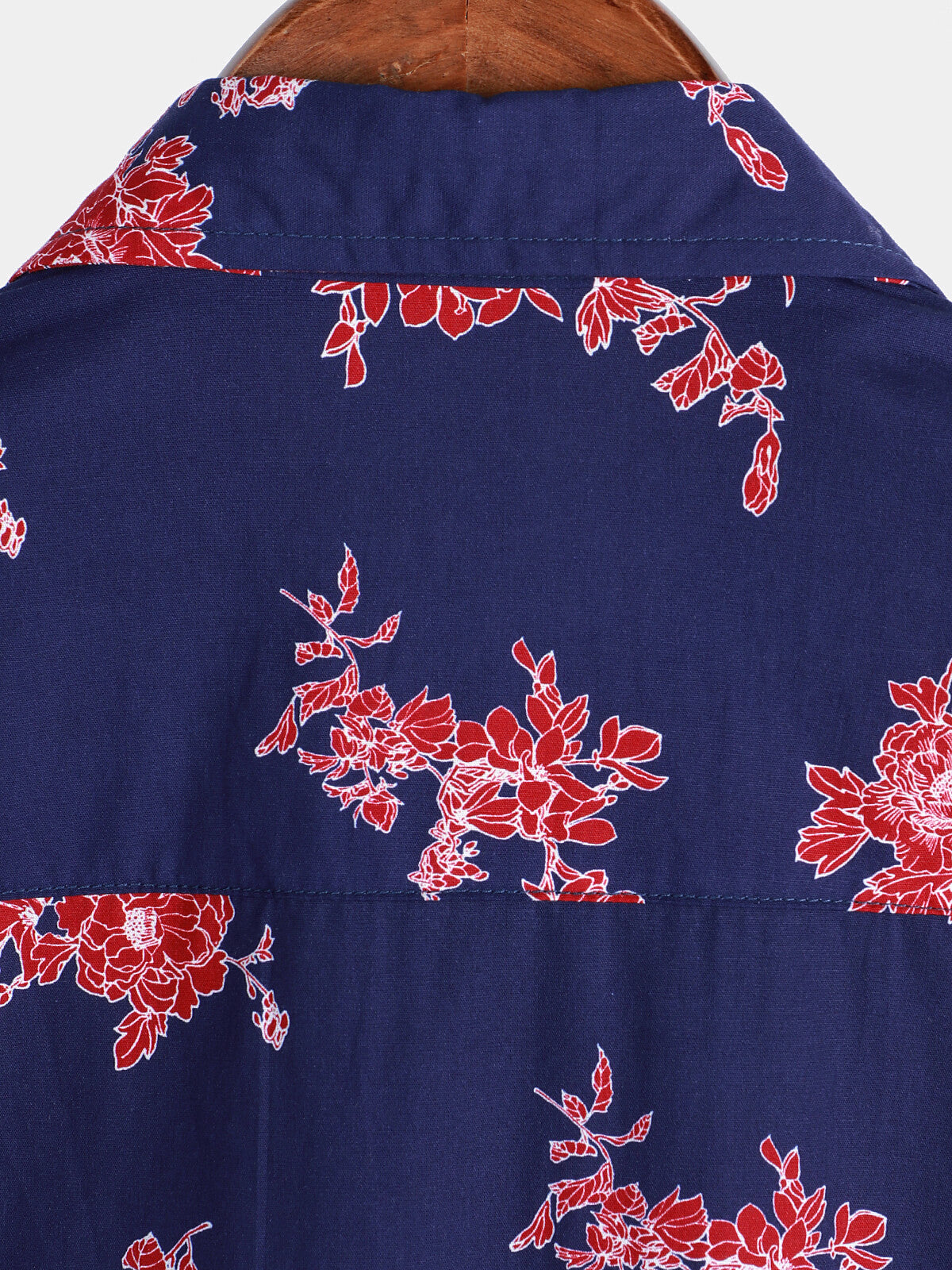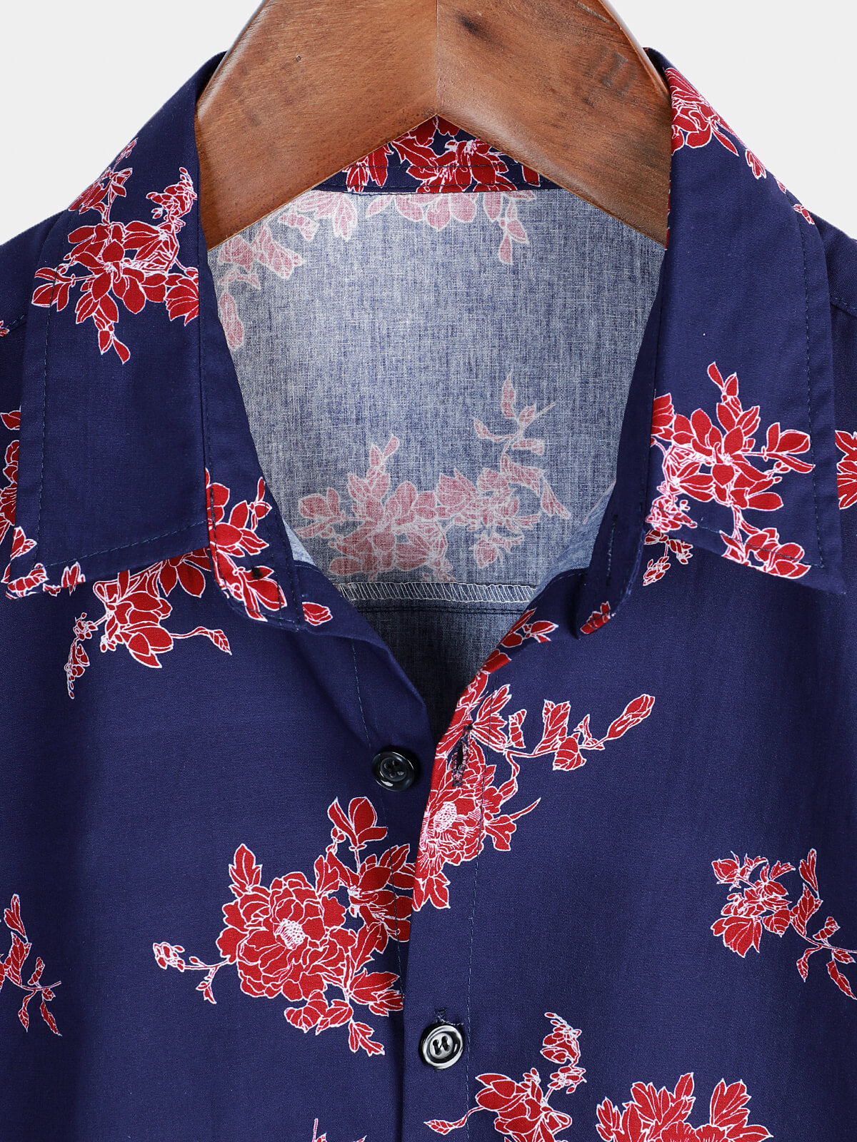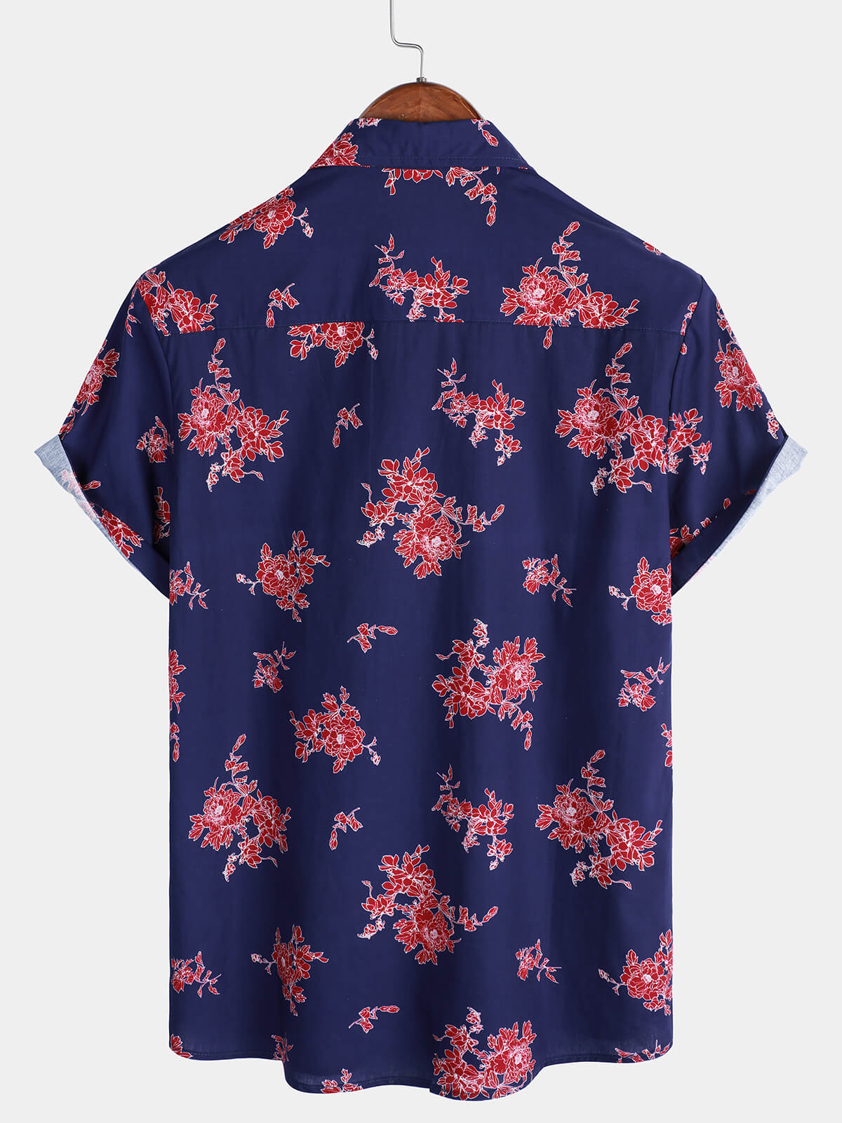 Men's Blue Floral Hawaiian Flower Print Short Sleeve Shirt
