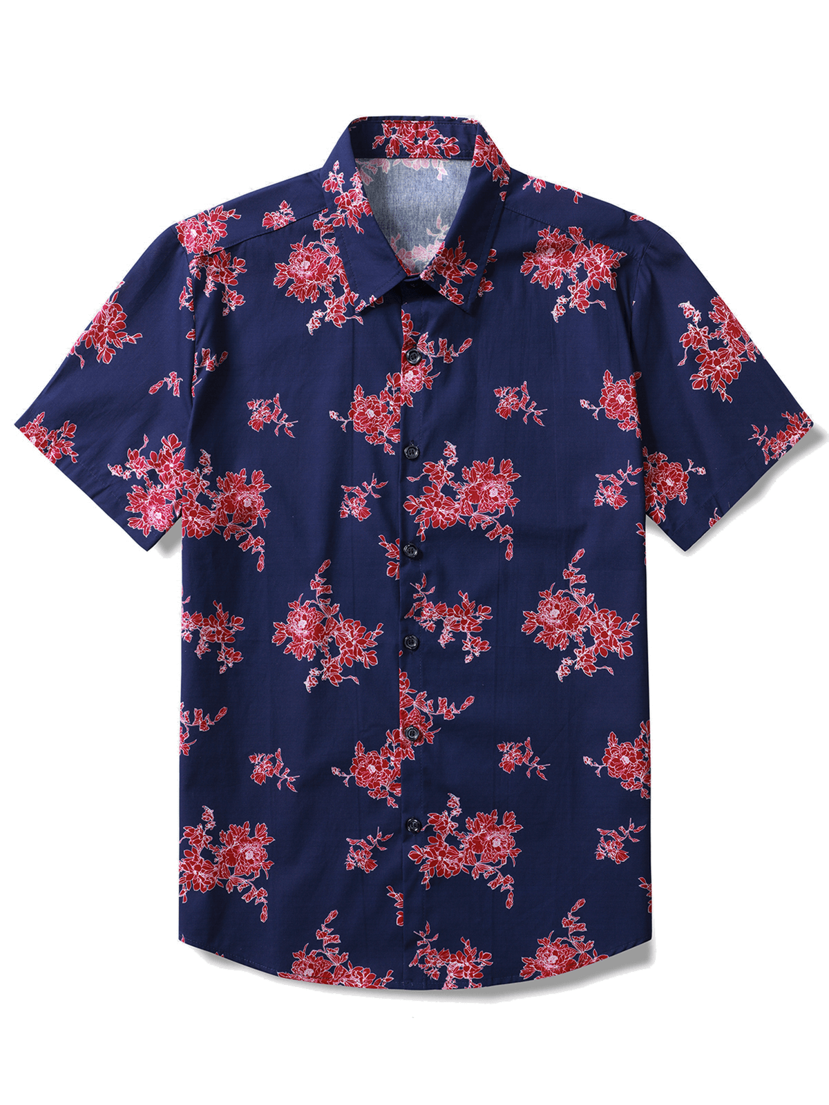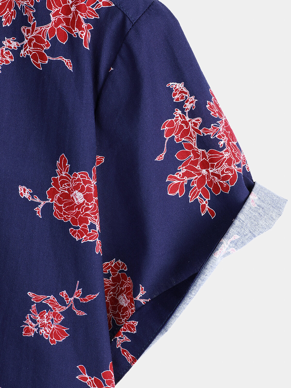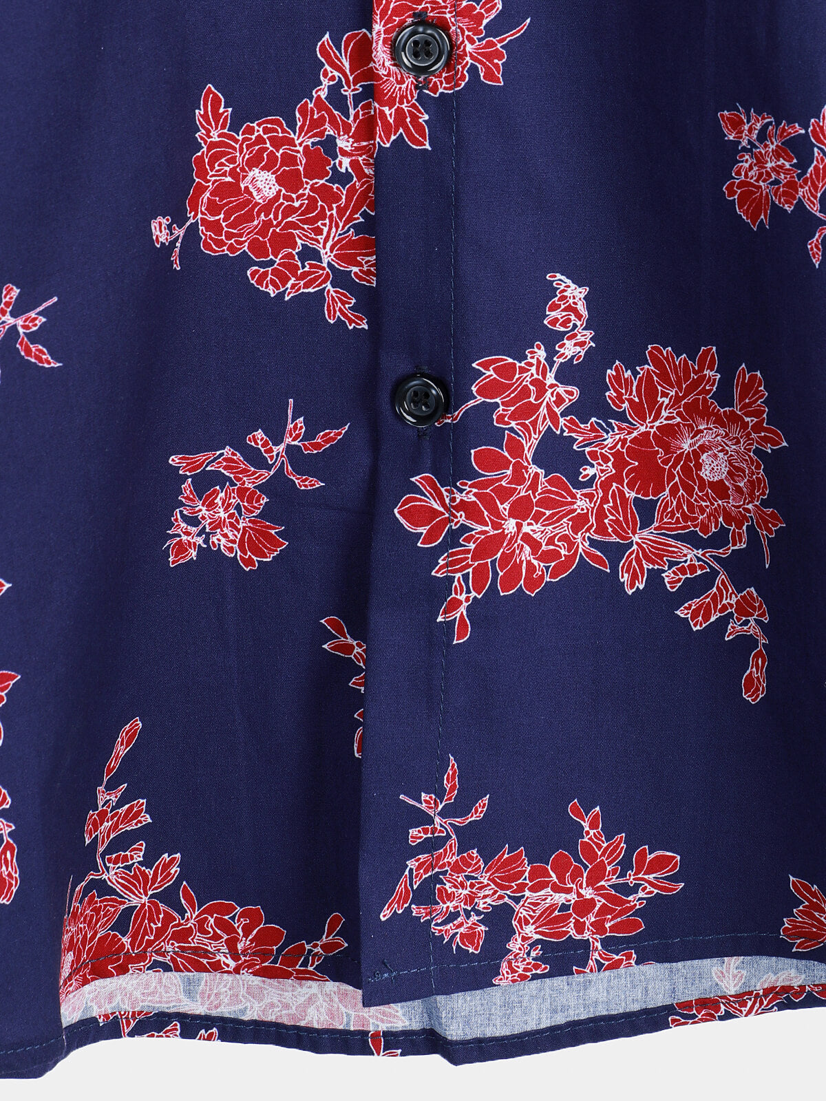 Men's Blue Floral Hawaiian Flower Print Short Sleeve Shirt
