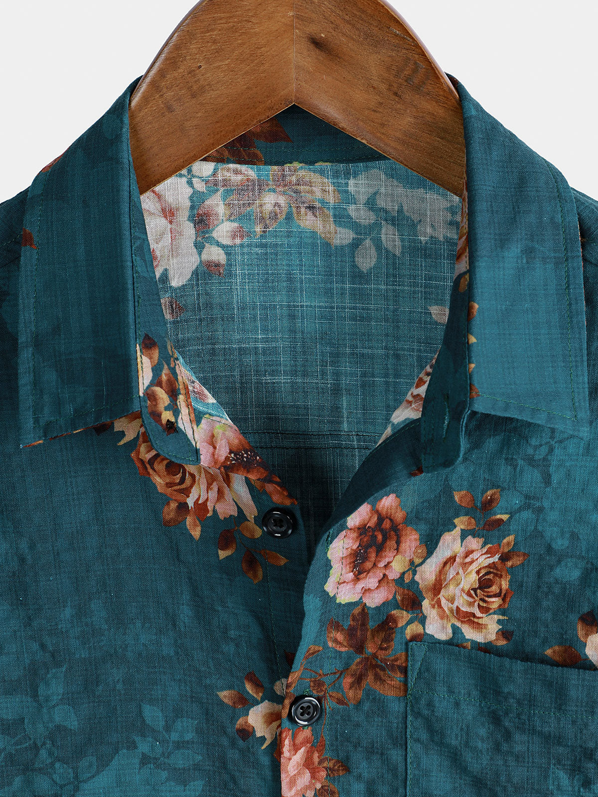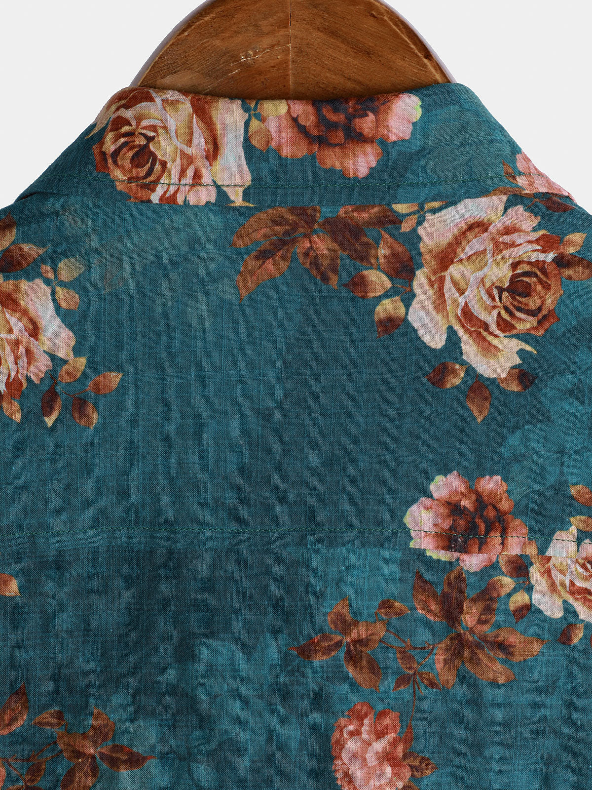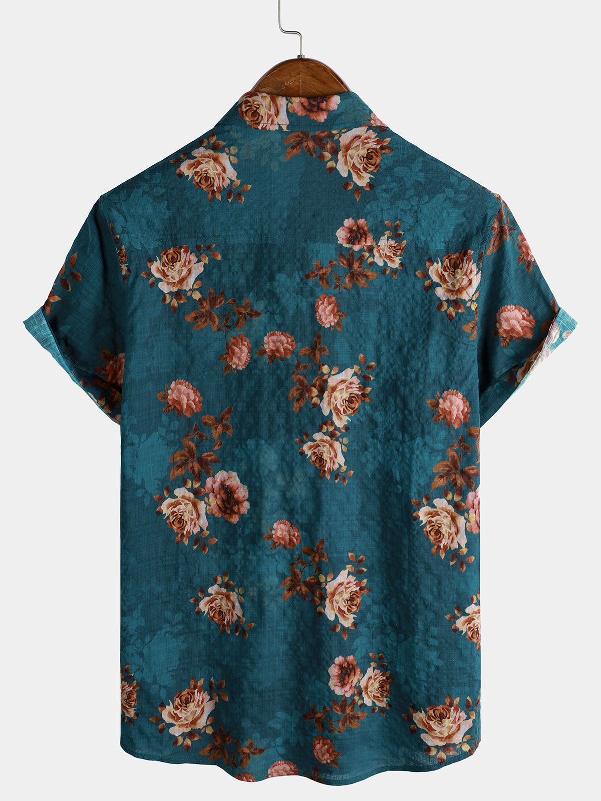 Men's Blue Floral Summer Short Sleeve Breathable Button Up Shirt