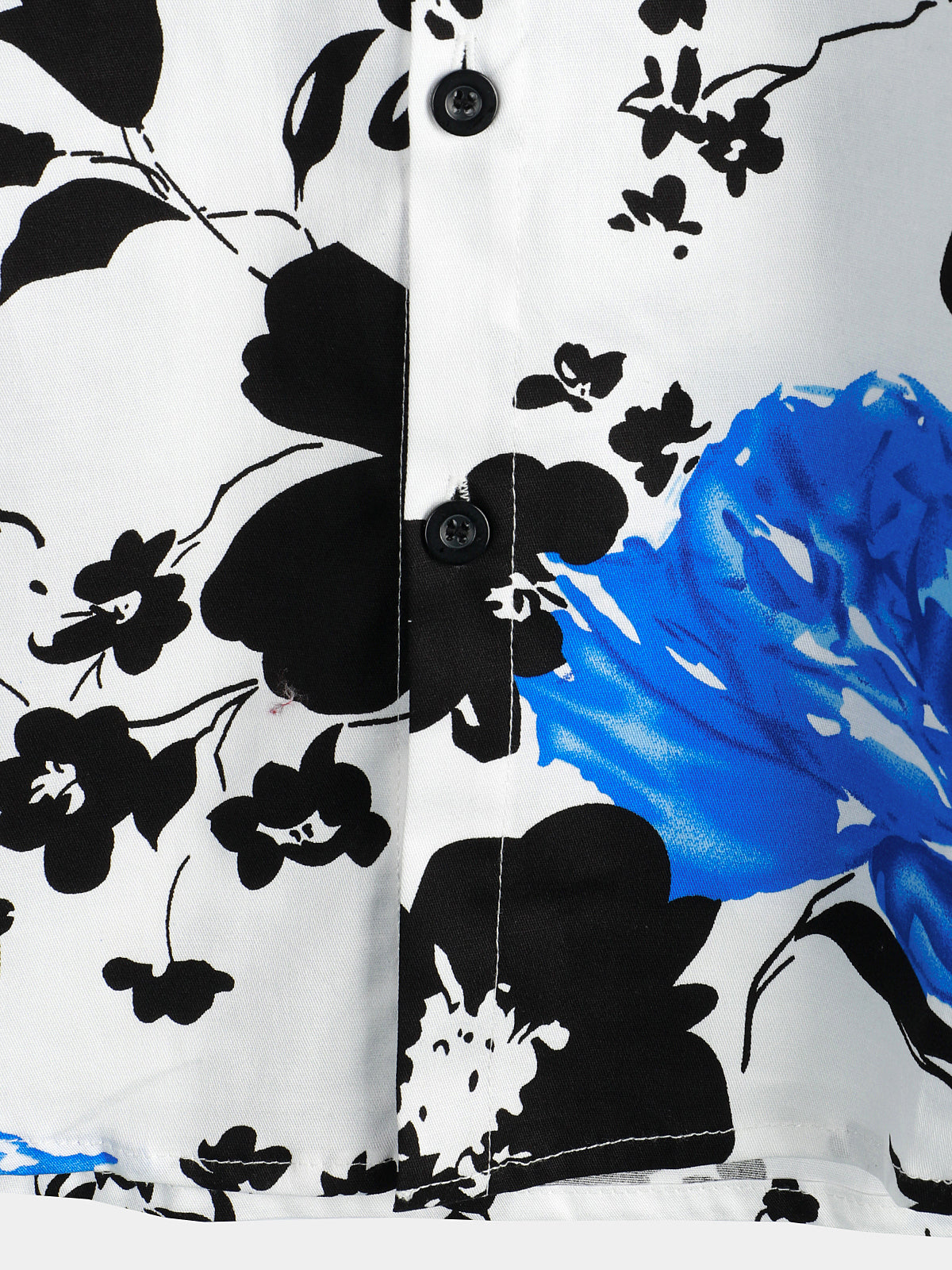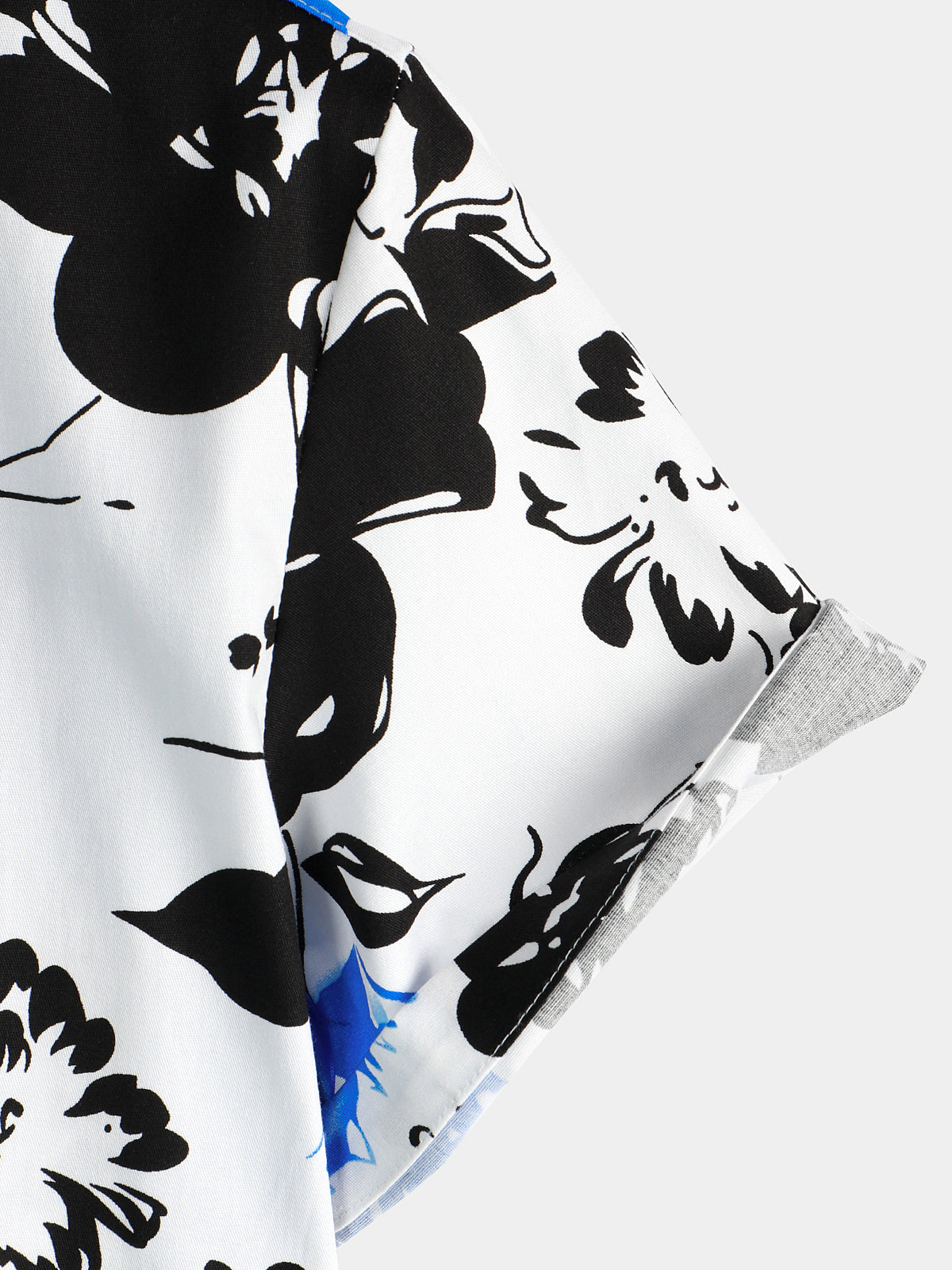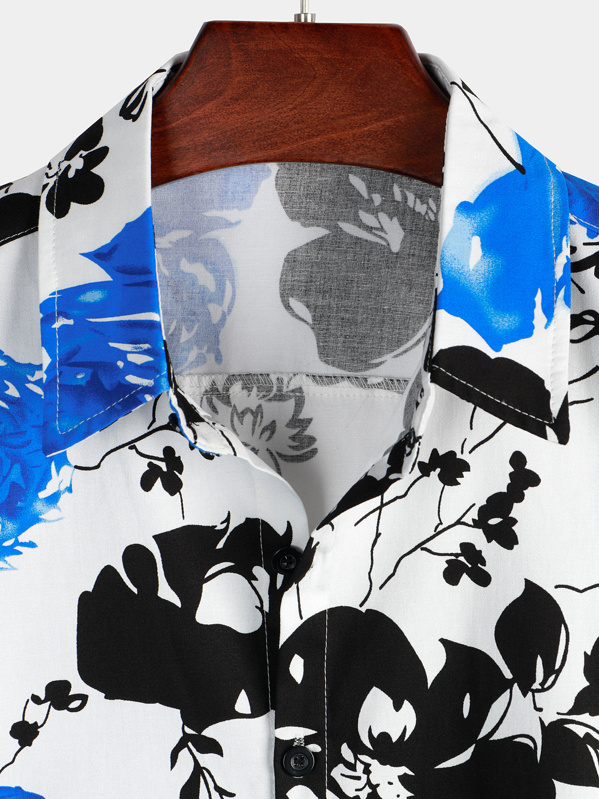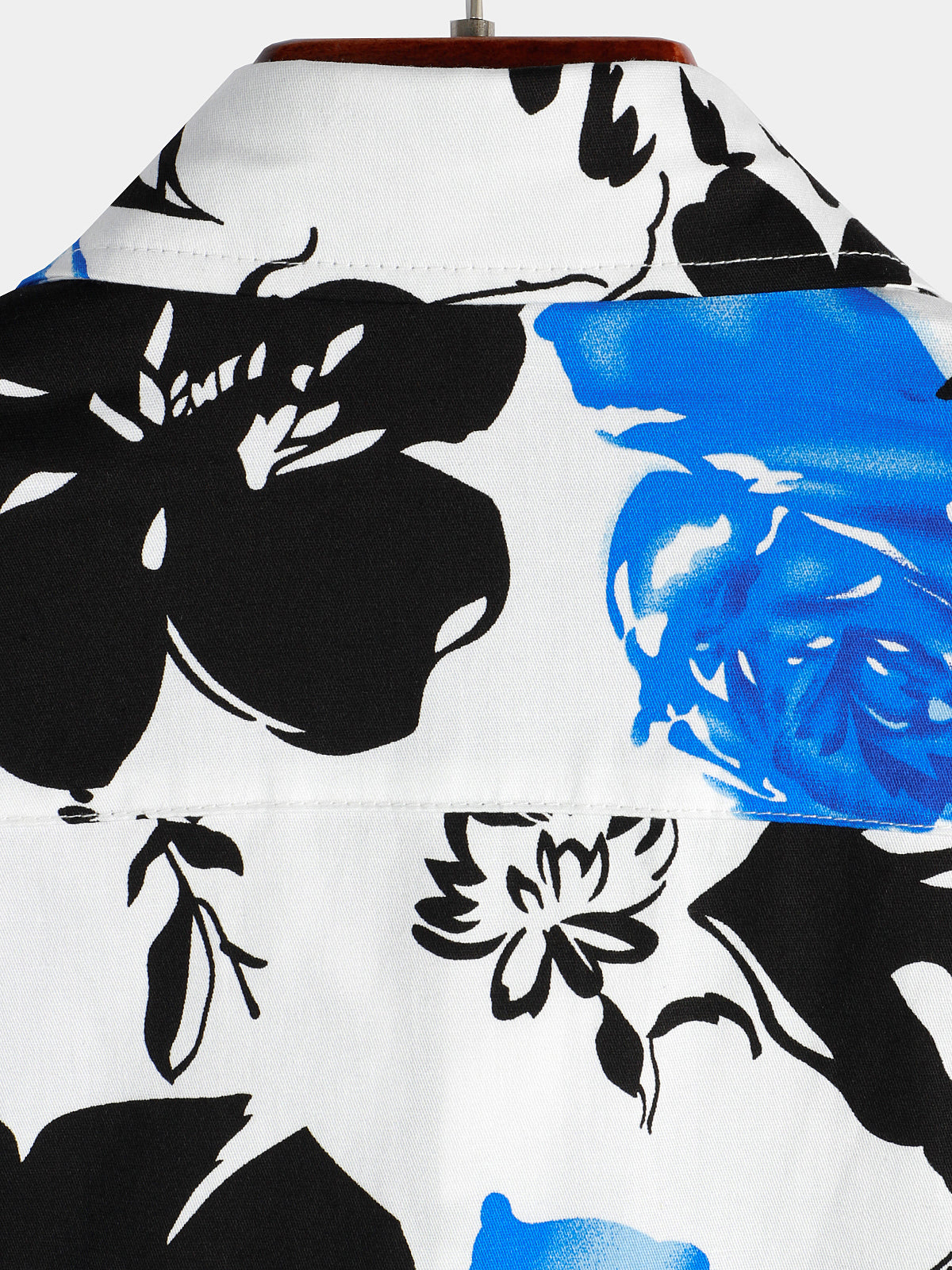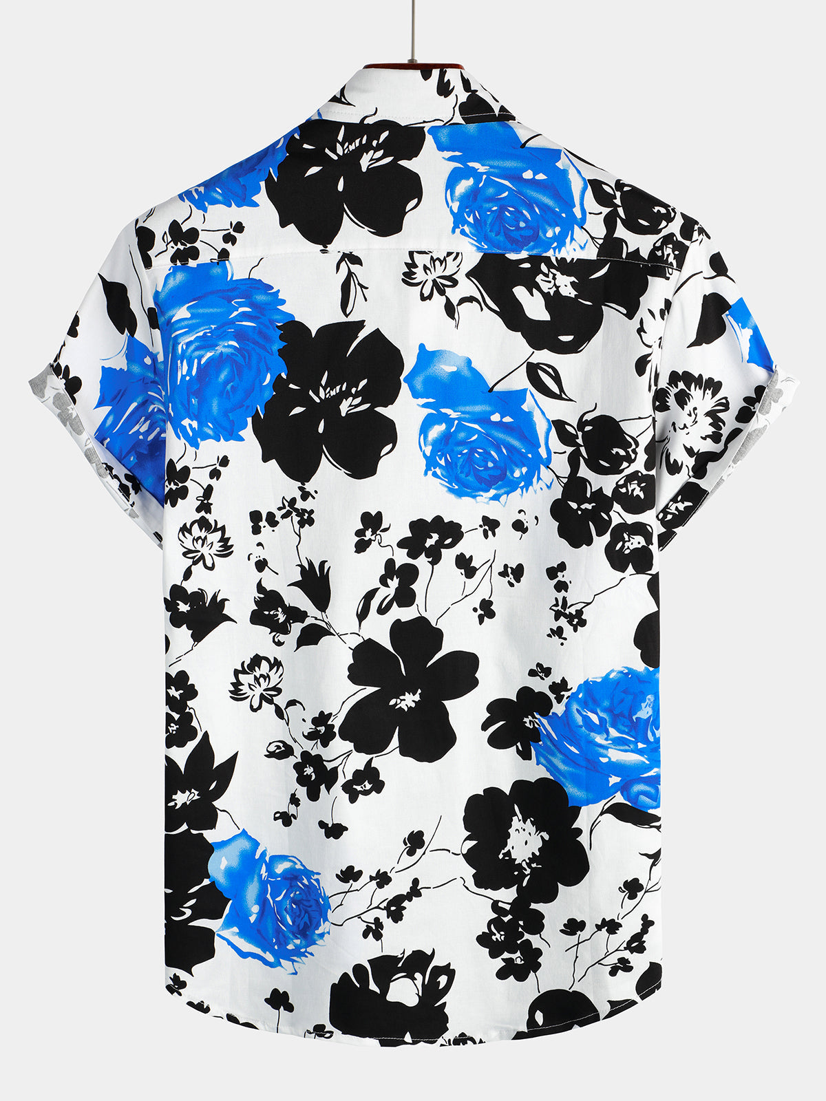 Men's Floral Print Vacation Casual Blue Flower Cotton Short Sleeve Shirt