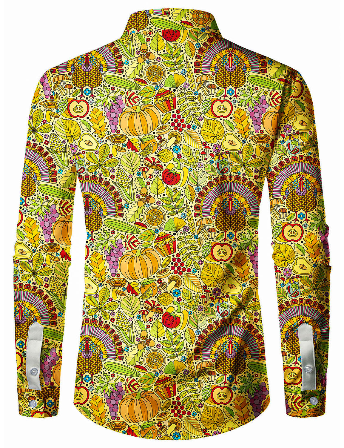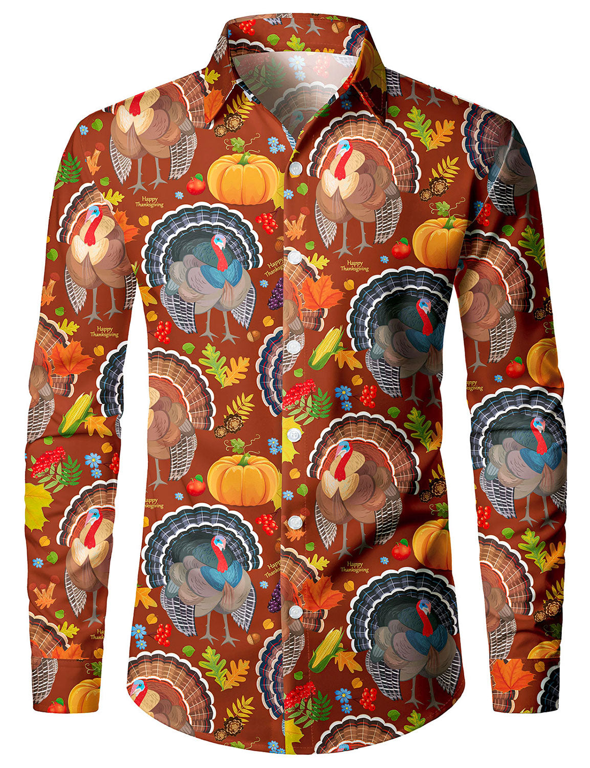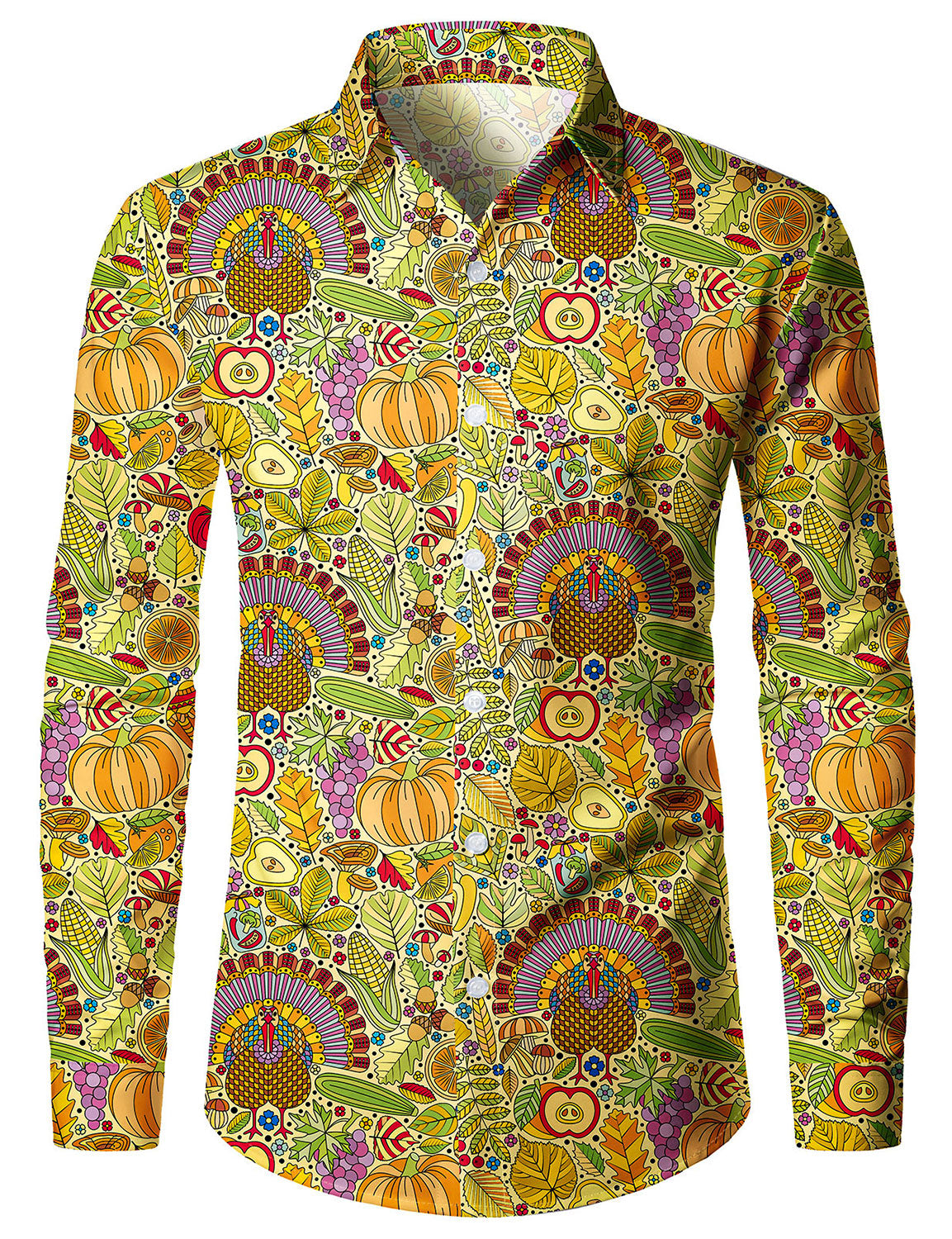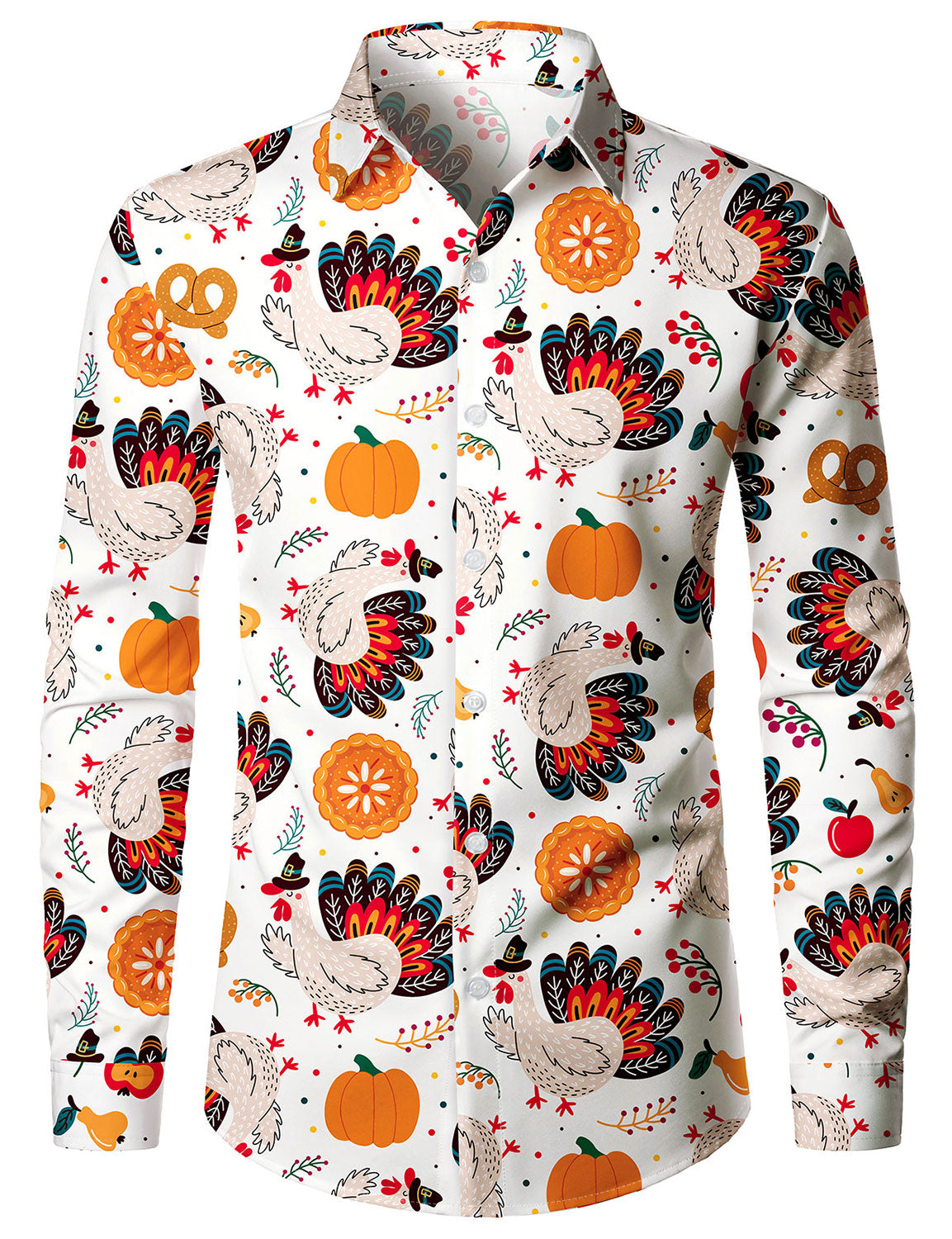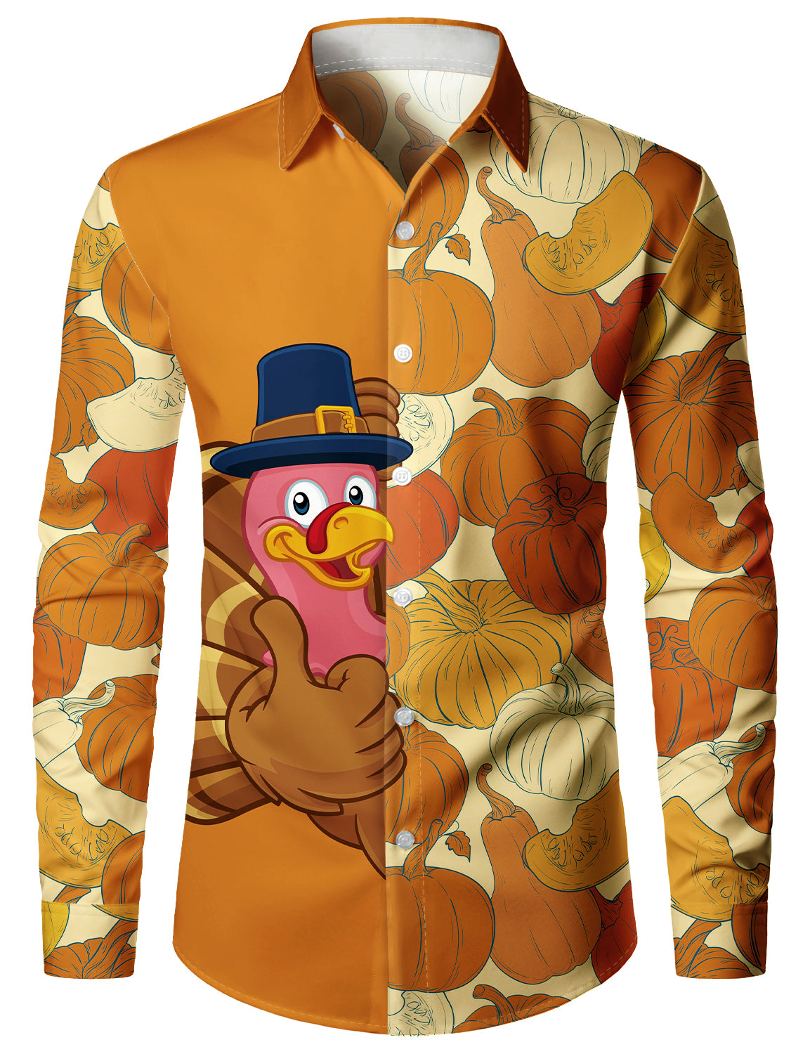 Men's Thanksgiving Cartoon Turkey Pumpkin Holiday Button Long Sleeve Shirt