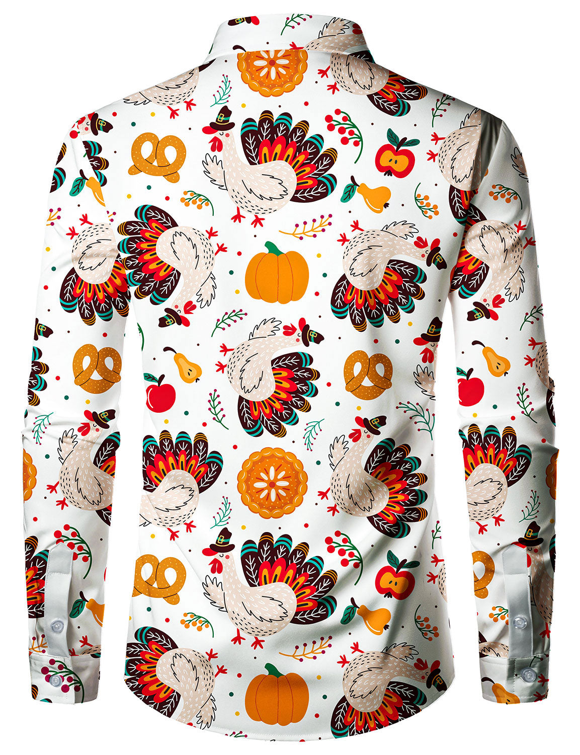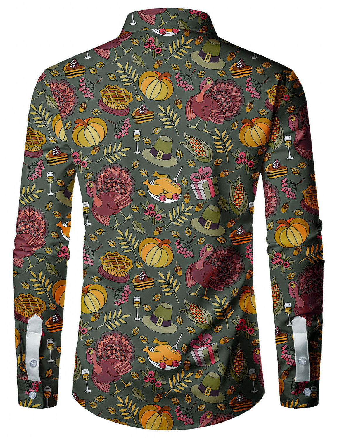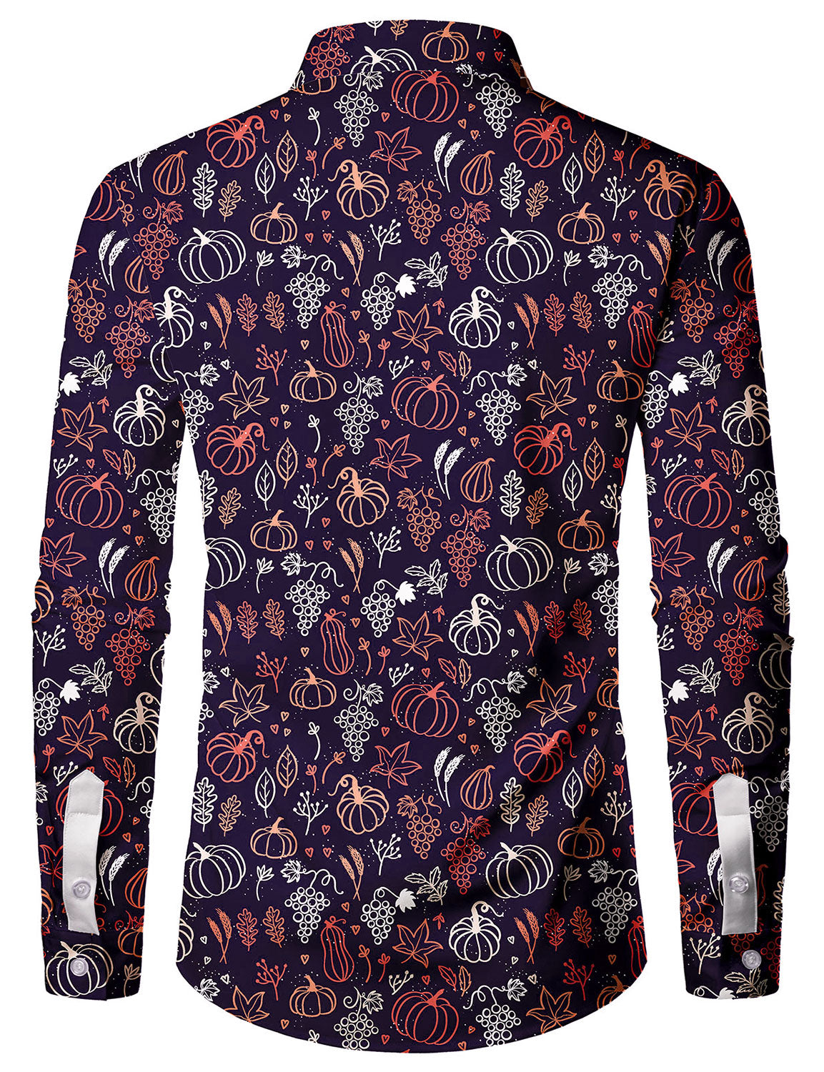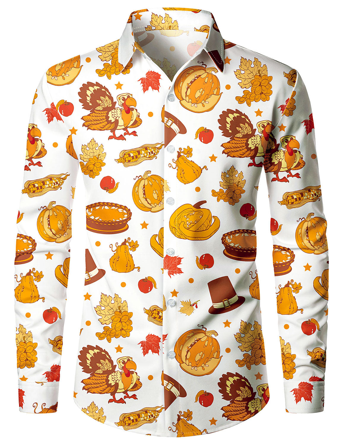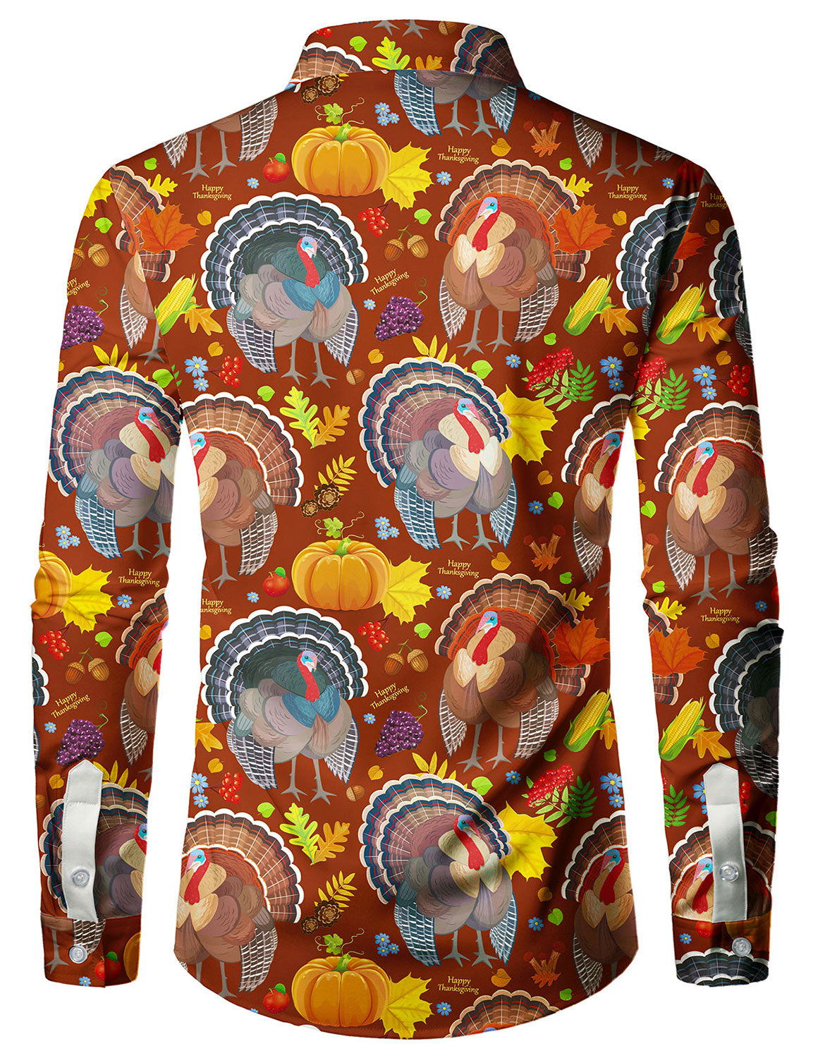 Men's Thanksgiving Cartoon Turkey Pumpkin Holiday Button Long Sleeve Shirt
