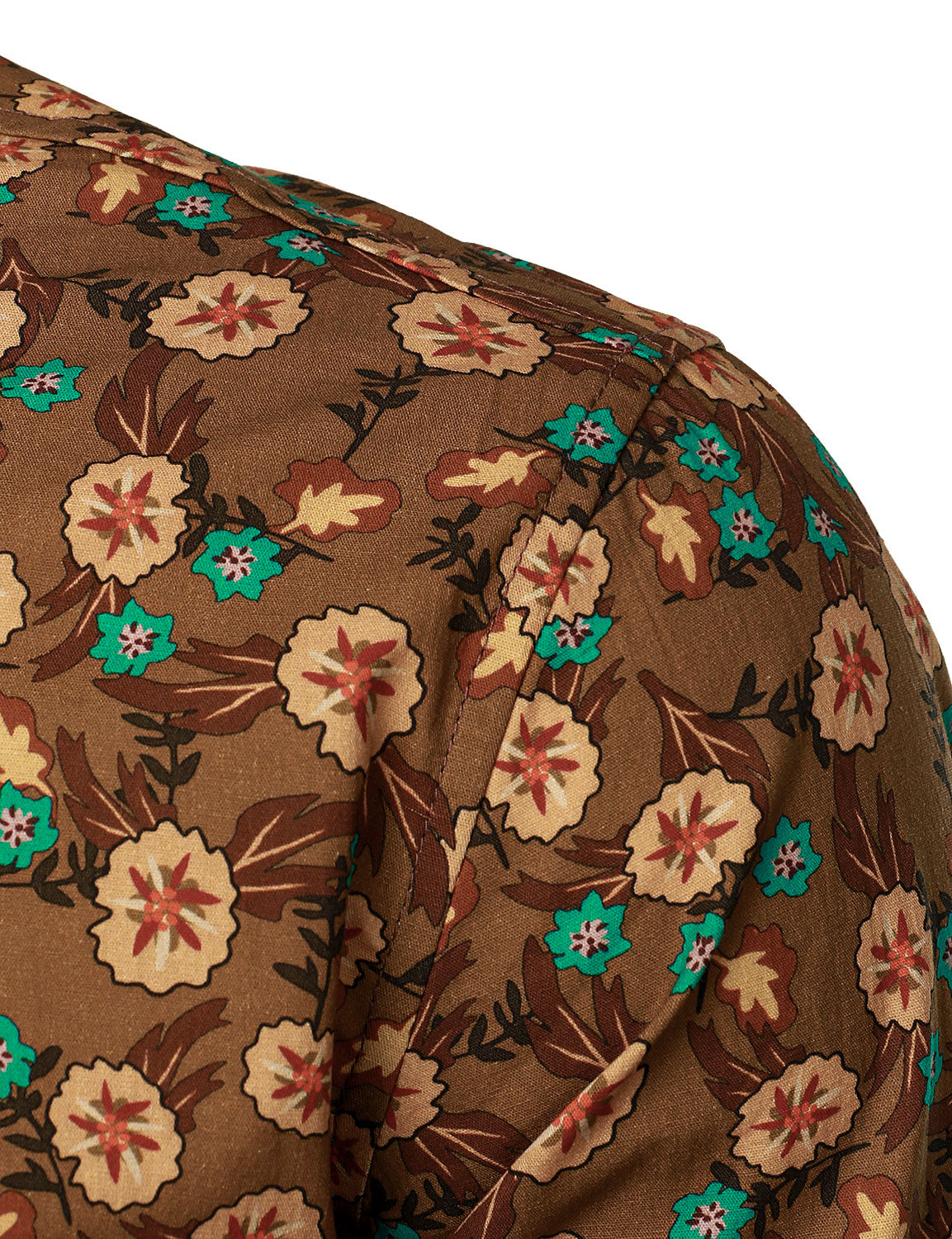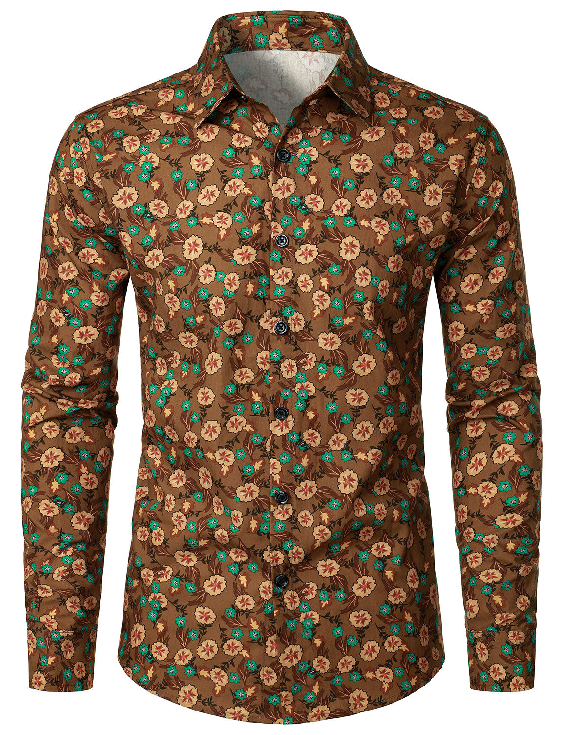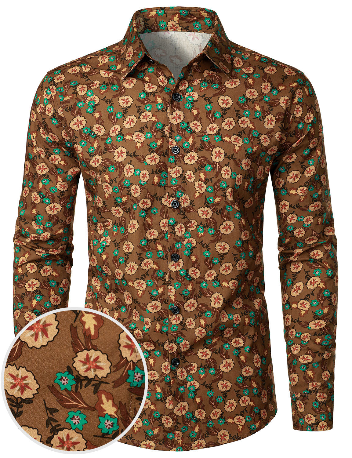 Men's Floral Casual Cotton Brown Long Sleeve Dress Shirt