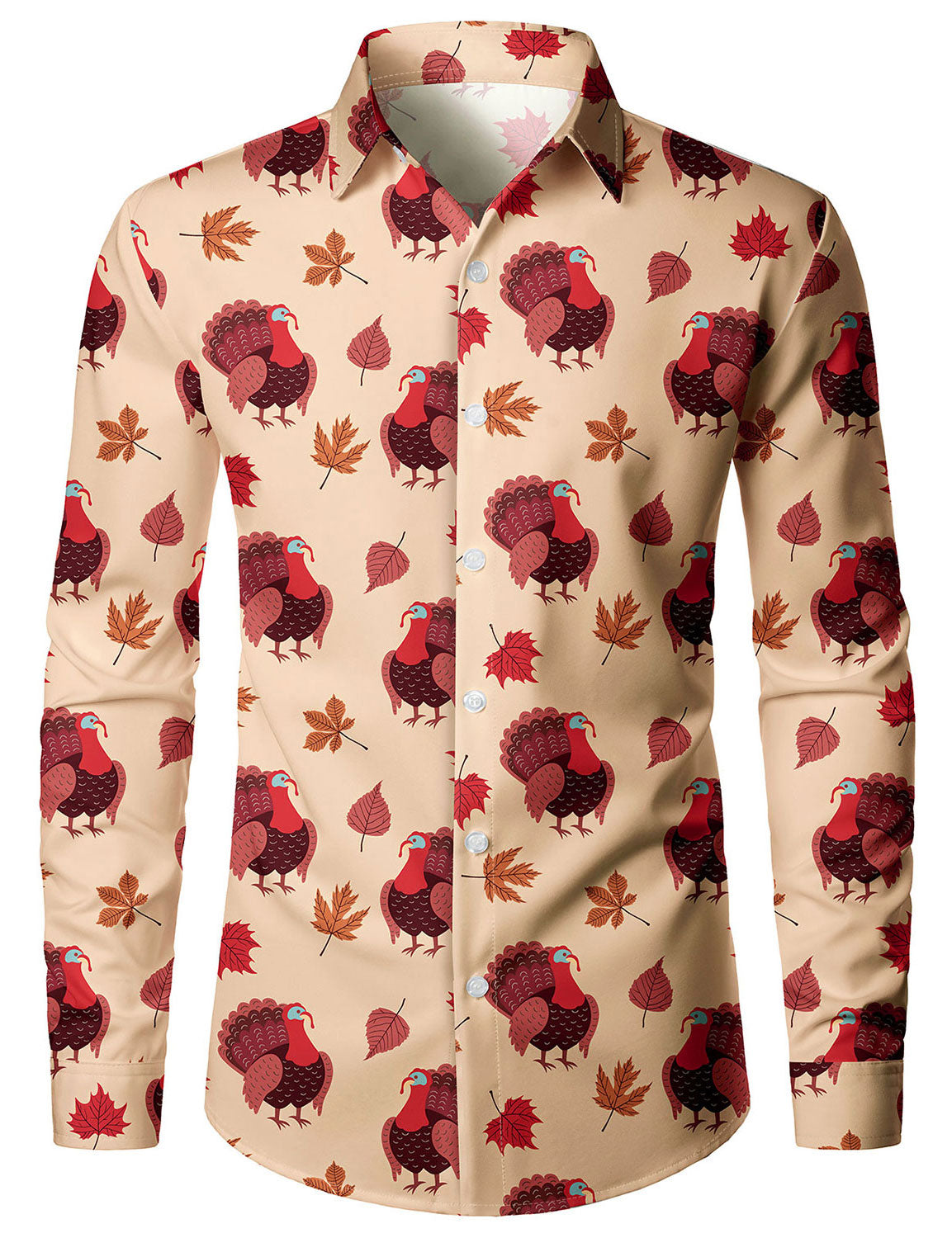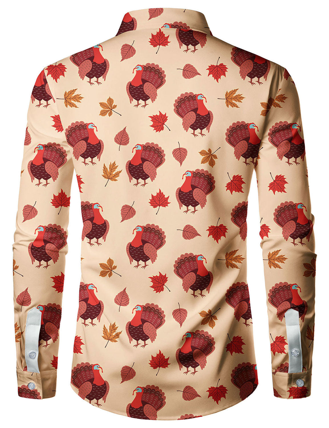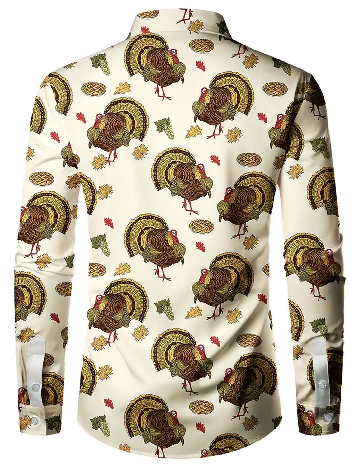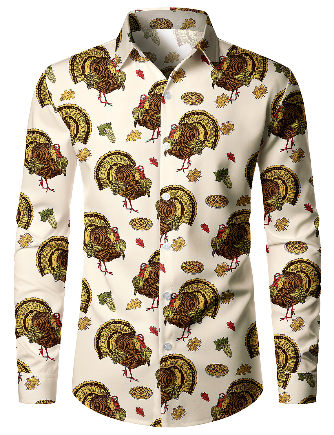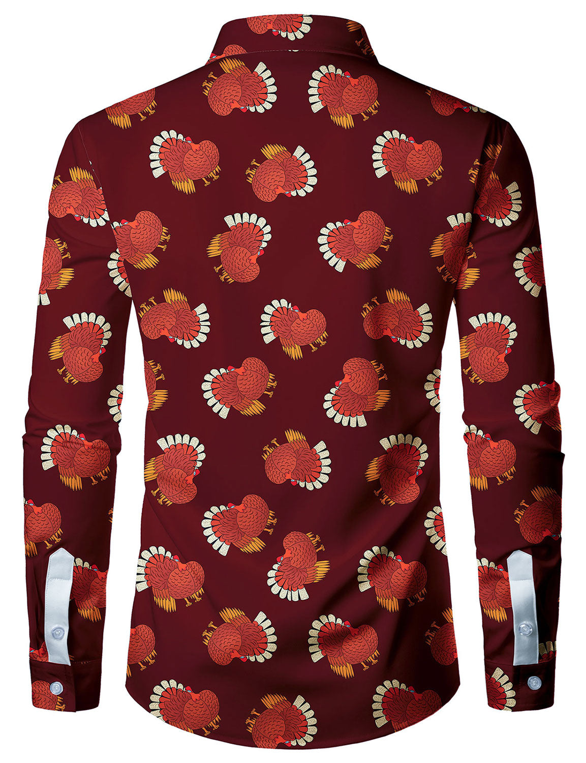 Men's Cute Turkey Print Thanksgiving Funny Holiday Button Up Long Sleeve Shirt