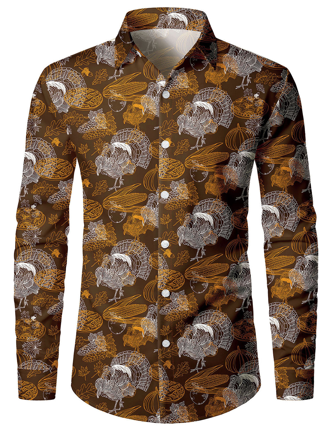 Men's Vintage Thanksgiving Turkey Holiday Brown Button Long Sleeve Shirt