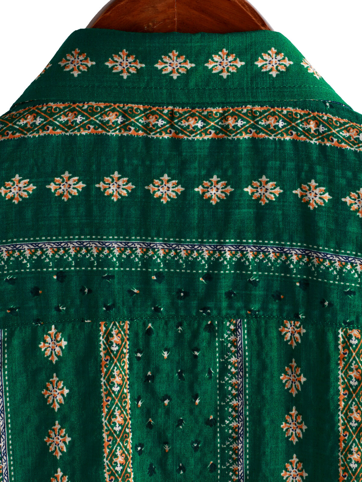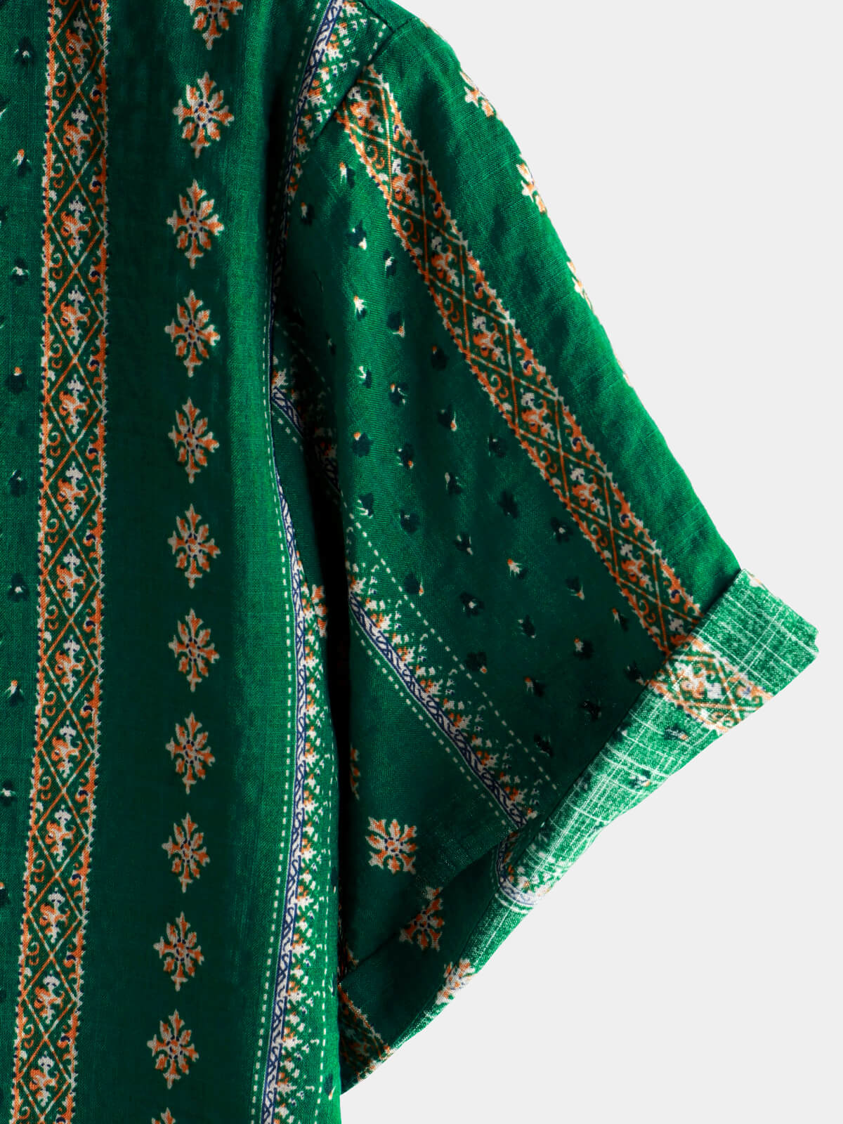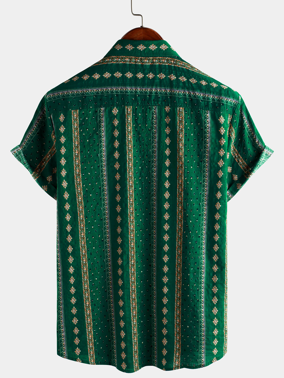 Men's Retro Green Striped Print Button Up 70s Vintage Short Sleeve Shirt